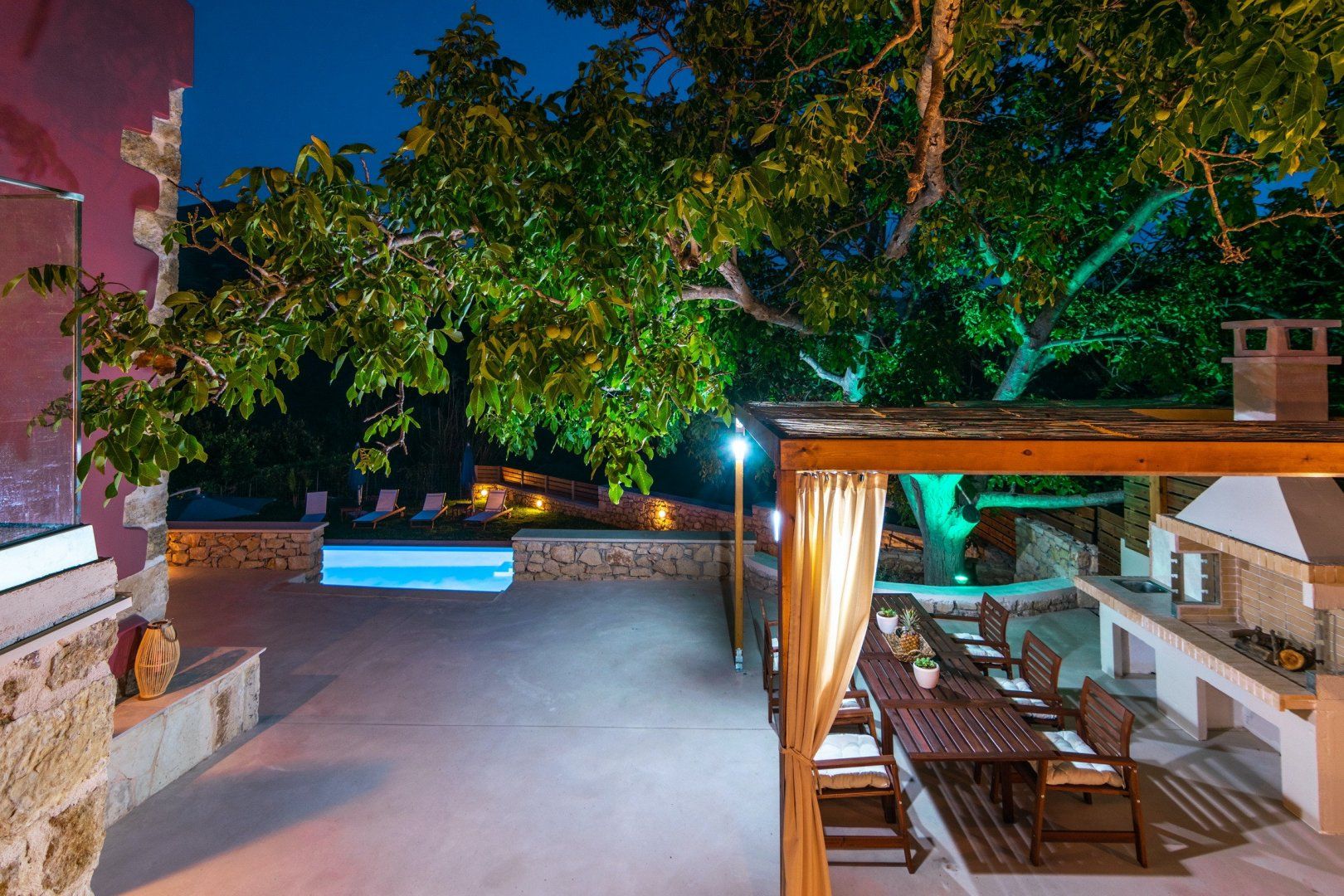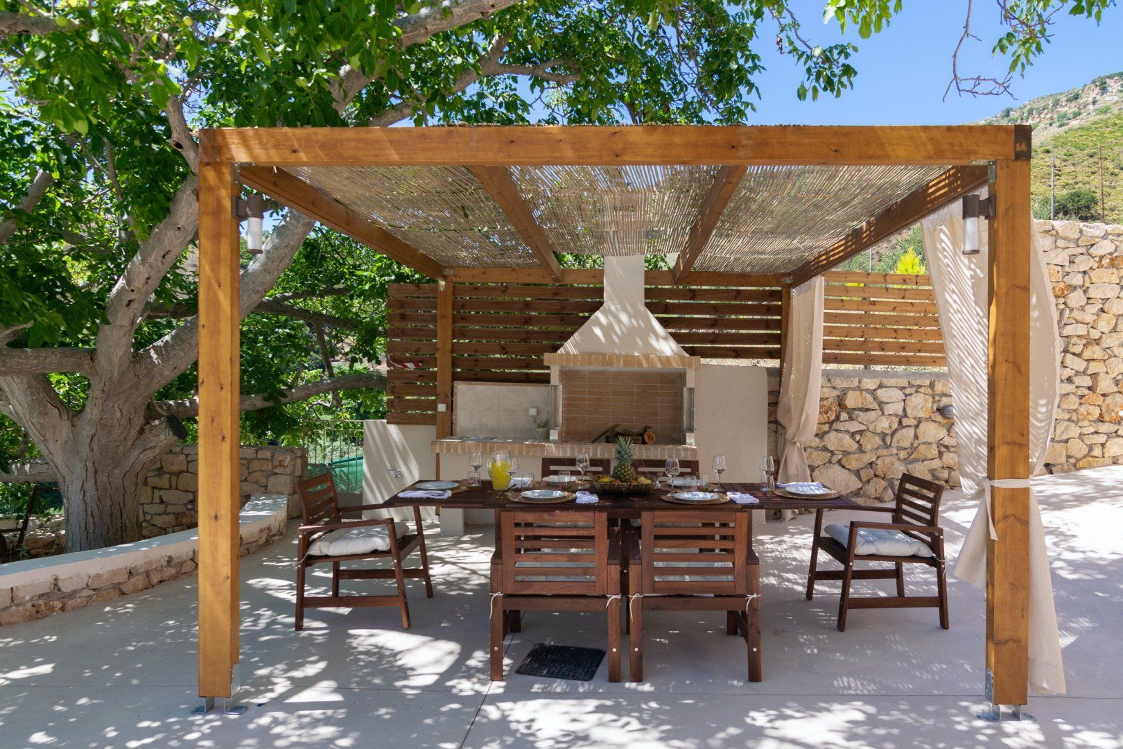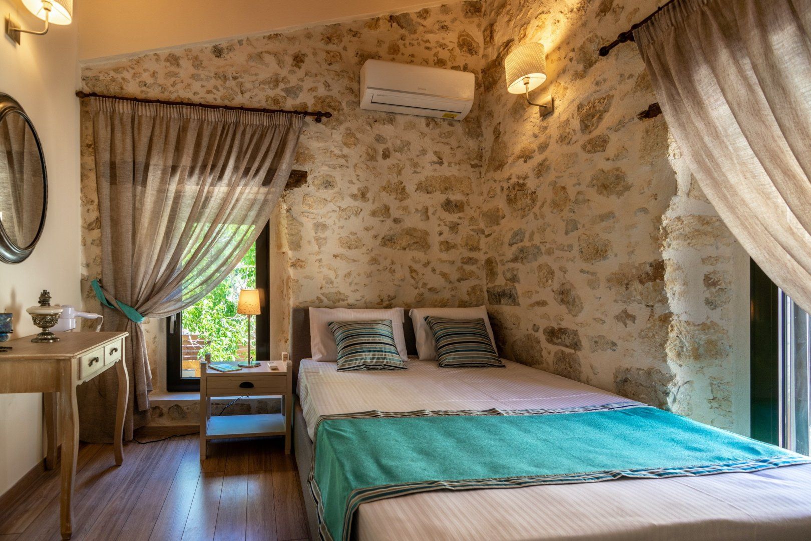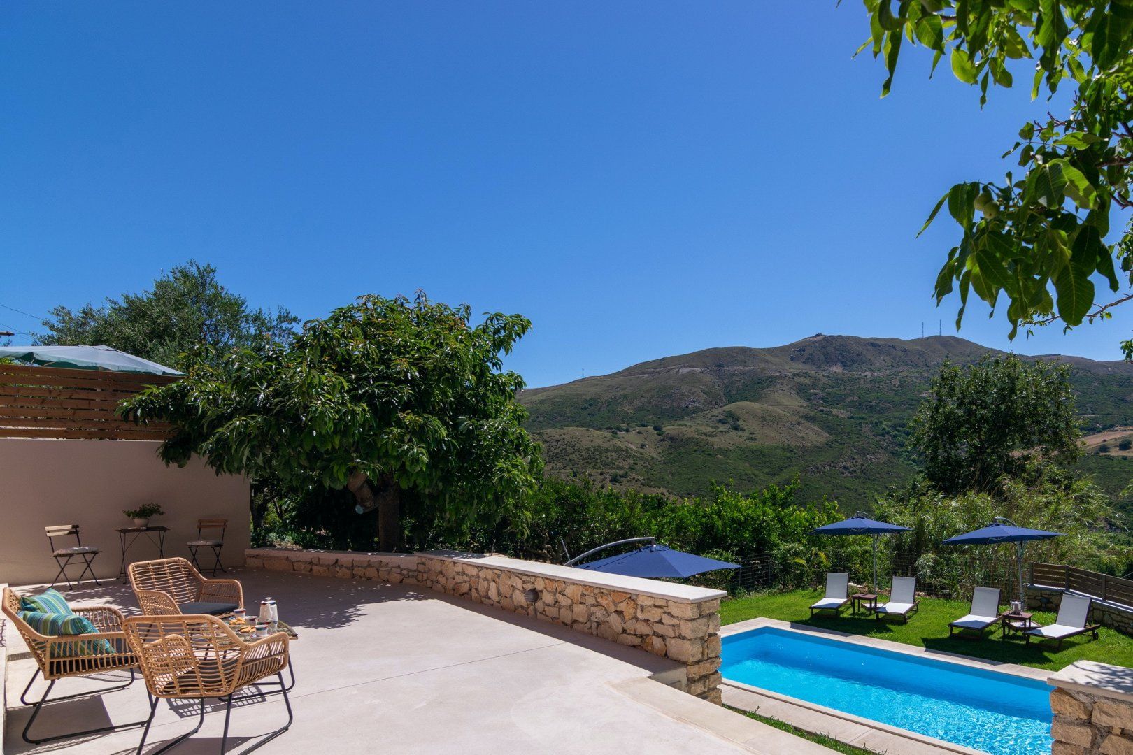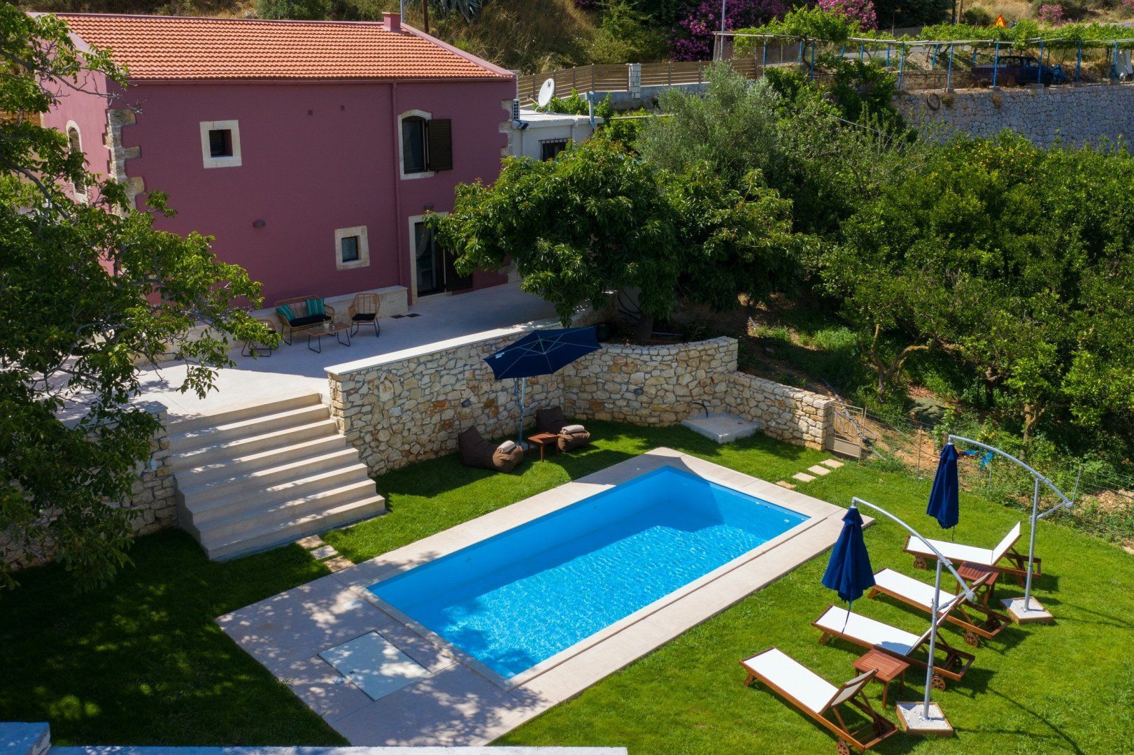 Before you even set your bags down at this home, you’re met with a paint pallet of beauty. From the green gardens, pink wash exterior and crystal blue water – paradise does exist. The lower terrace is home to your private pool, surrounded by comfortable sun loungers. Spend the afternoon with your feet up, soaking in the Crete sunshine. Our favourite spot is slightly elevated – an undercover barbecue area, wood oven and beautifully dressed table for an evening dining alfresco. Gather your loved ones and uncork a bottle of wine for a memorable evening as the sun sets.