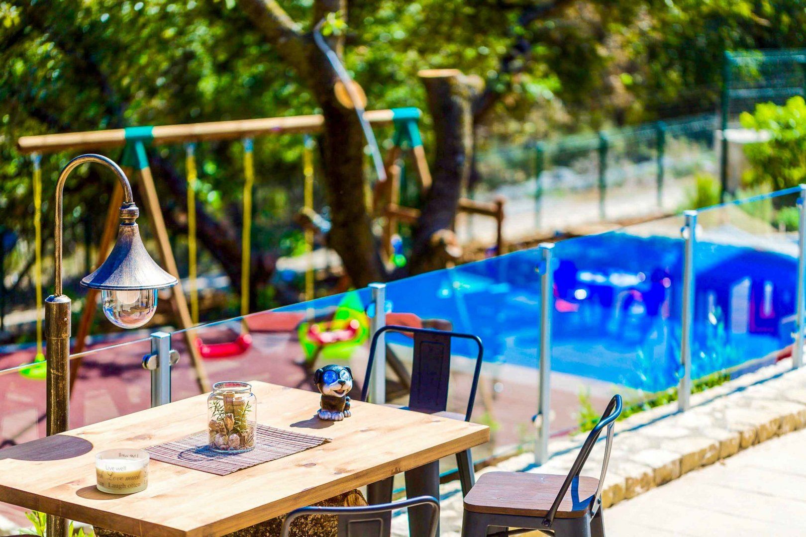 *This home is all on one level but there are stone stairs to the pool area and to the playground, as well as a couple of steps up to the bedrooms