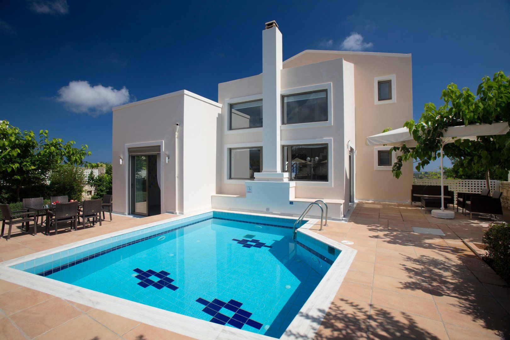 Inside, double-height ceilings in the open-plan living area allow sunlight to pour in and bathe the space in a warm glow, while the bedrooms – each with a balcony – offer spectacular views over the Cretan mountains and a peaceful night’s sleep in the inviting beds. There’s a hydro massage tub on hand too to ramp up the relaxation even more, while outside, the private pool beckons hours of swimming and lounging on the deck chairs, followed by an alfresco barbecue feast around the outdoor table.