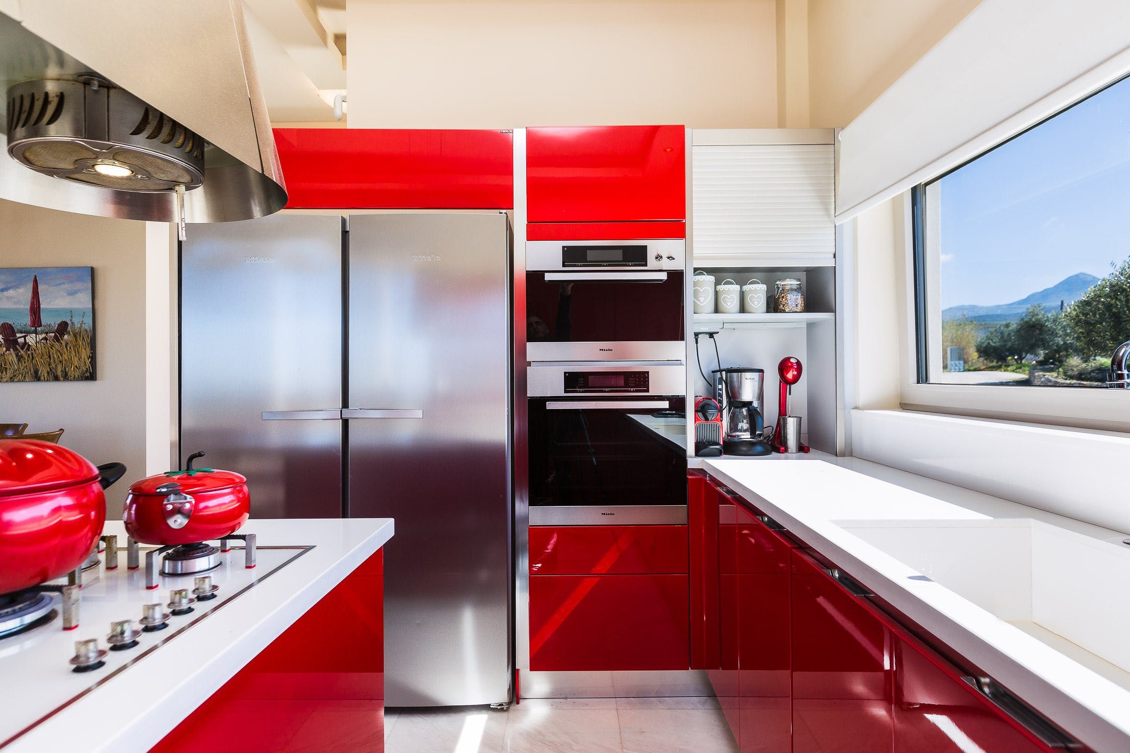 When you eventually head inside, you'll be pleased to discover a thoroughly contemporary interior filled with natural light from the floor-to-ceiling windows and glass doors, plus chandeliers and a fireplace to light up once the sun goes down for the night. The red kitchen is both striking and sleek, as is also the case with the master bedroom's en-suite bathroom and its sunken tub complete with a sea view.