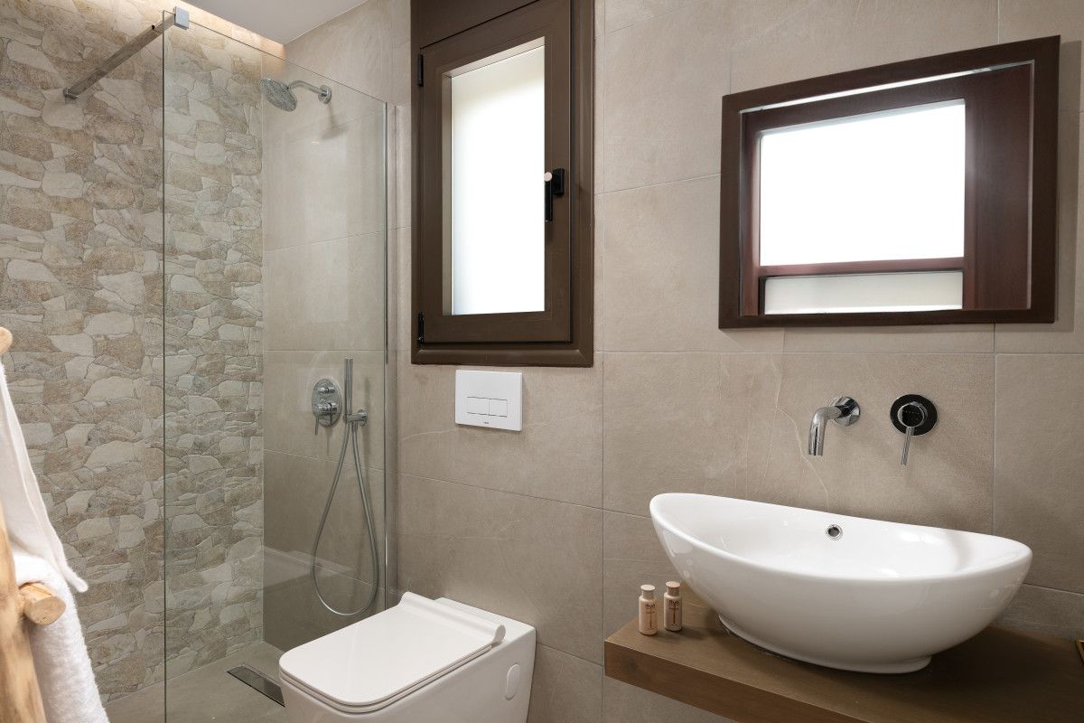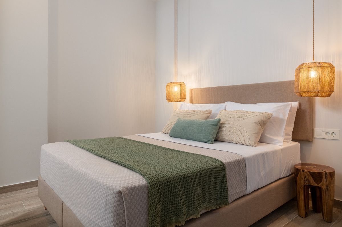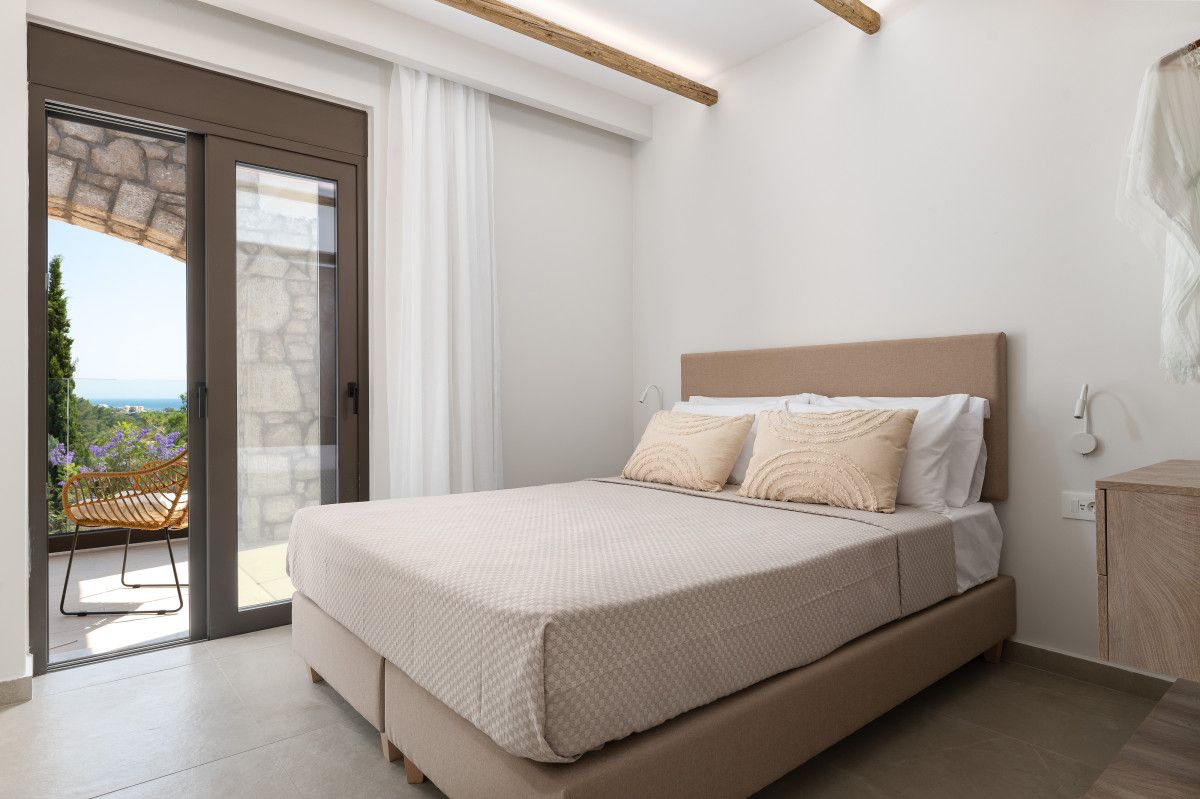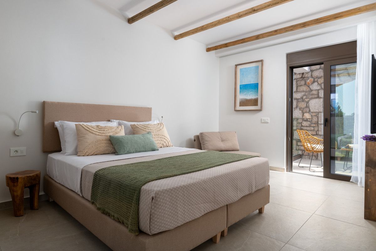 Each of the 3 Villas offers cozy living areas and beautiful outdoors and can conveniently accommodate up to 6 guests. They have 3 fully air-conditioned bedrooms with double beds in warm tones and a unique bohemian design, which reflects the nature itself. Two of the bedrooms are on the first floor. There is a stair down that leads to the third bedroom, which comes with a double bed, a sofa and its own bathroom with shower. There is one bathroom on each floor. Also, there is a double sofa bed in the living room. The kitchen is fully equipped to accommodate your culinary habits, as well as your experiments with local products and recipes. The beautiful living room is inviting with incredible furniture. There are smart TVs in each bedroom and free Wi-Fi throughout the property. All areas are carefully decorated in natural colors and textures. The property’s outdoor space is a highlight on its’ own merit. You will totally enjoy your time at the private swimming pool. Nature and modern Living are perfectly combined together to make your stay a memorable one.