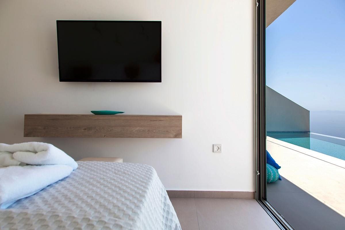 After arriving at this hillside abode, the first thing you’ll notice is the breathtaking coastal view. This home makes the most of its mountain location by allowing the scenery to extend out from its glass terraces. An infinity pool takes pride of place, with cushioned loungers at either side, where you can start with brunch in the morning, a swim in the afternoon, then cocktails as you watch glorious sunsets over the archipelago.