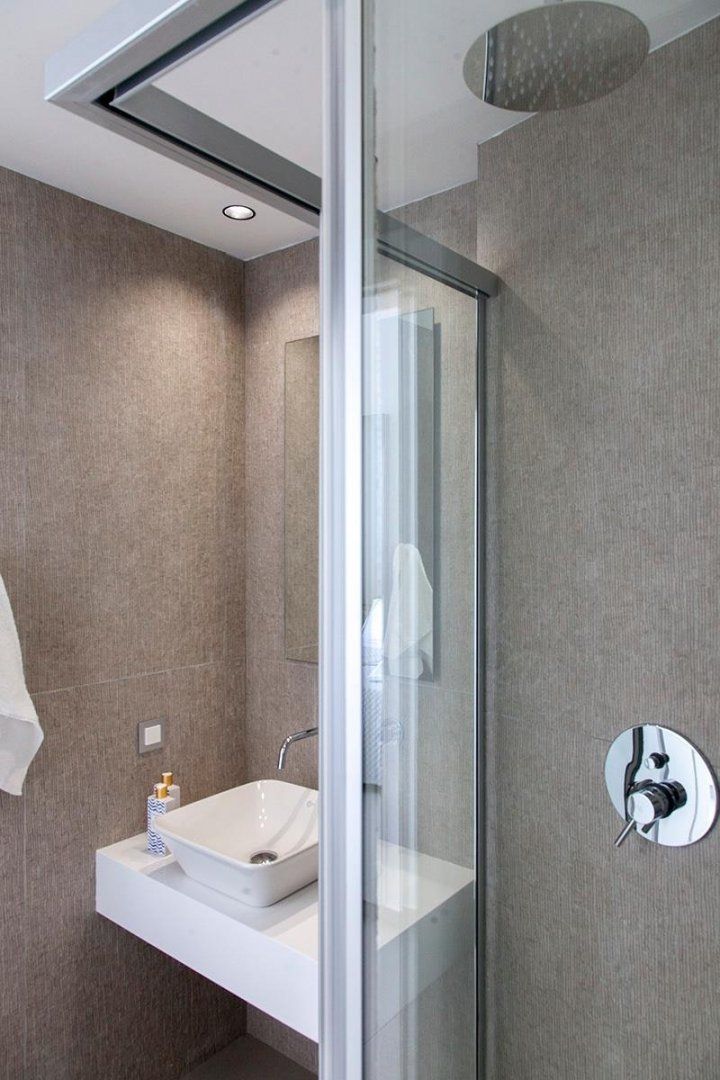 When you need a top-up, head in through huge glass, sliding doors and into a modern living space. Understated furniture, white walls, and a matte grey kitchen make the whole room feel bright and fresh. But the real purpose of this minimalist decor is to let the main attraction stand out from every room – that fantastic sea view.