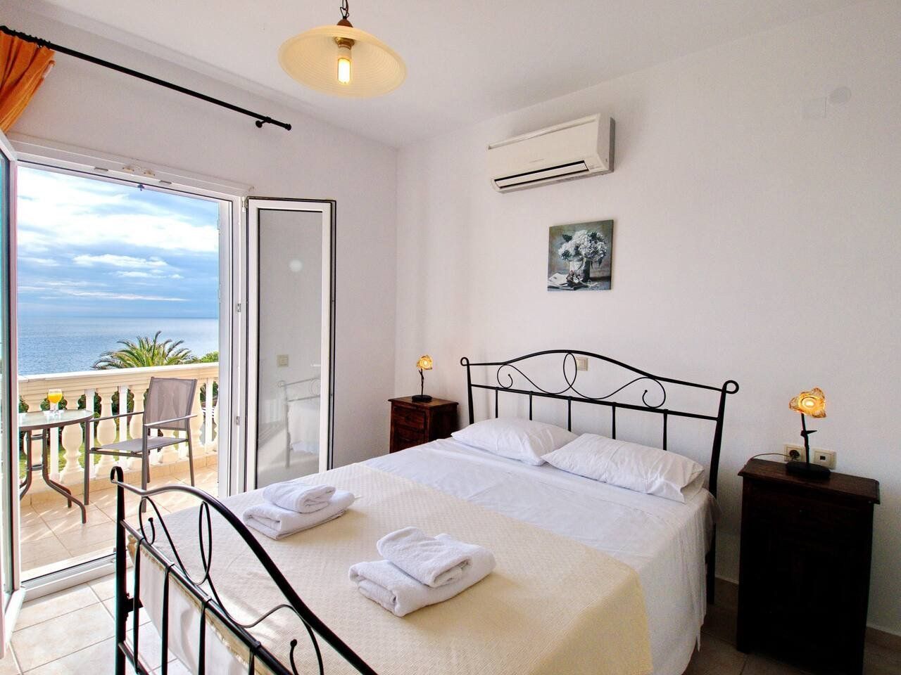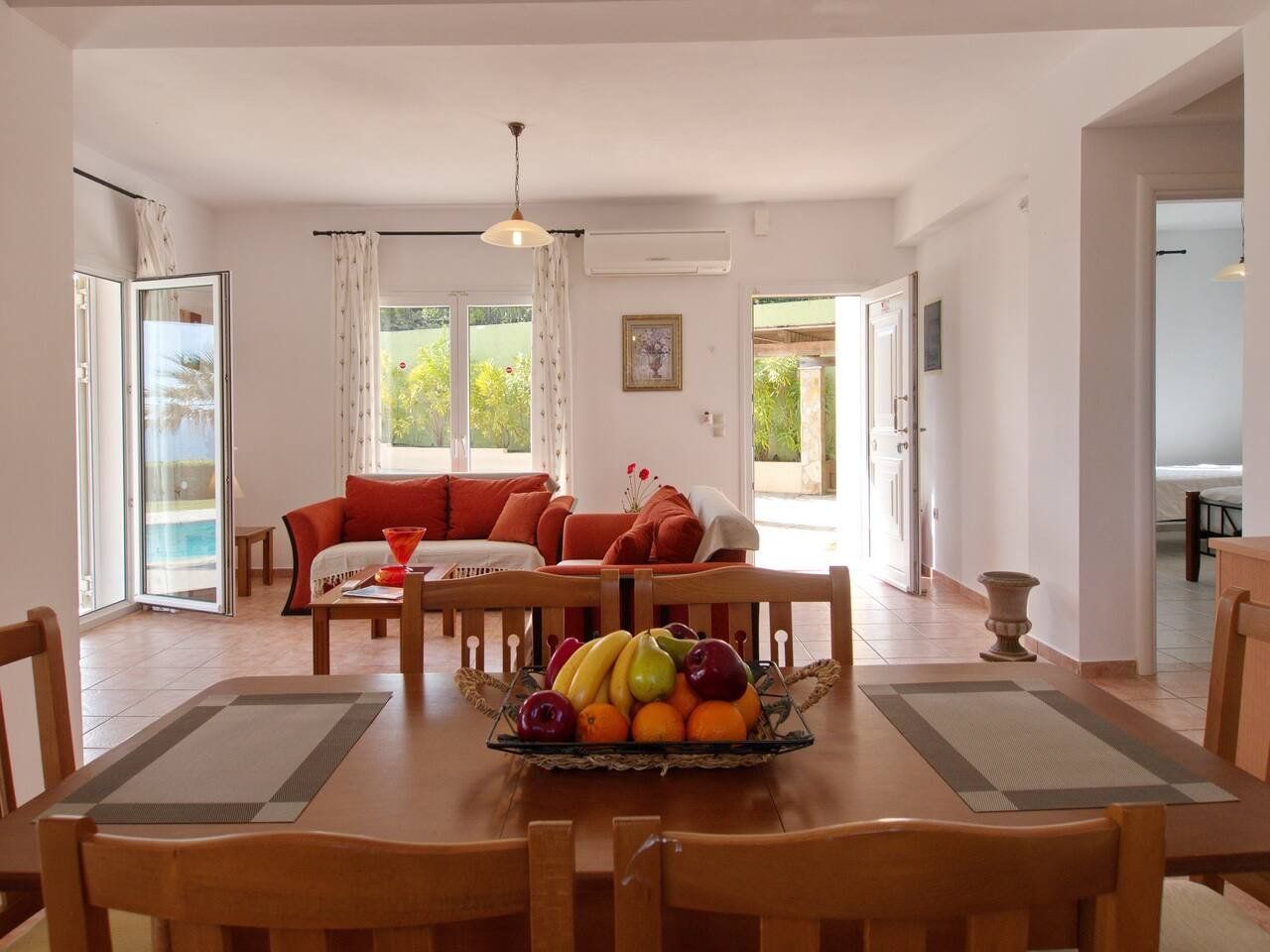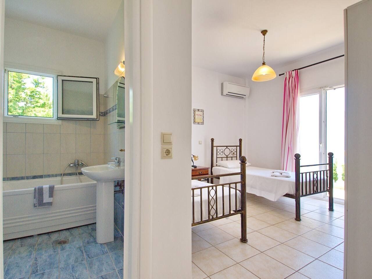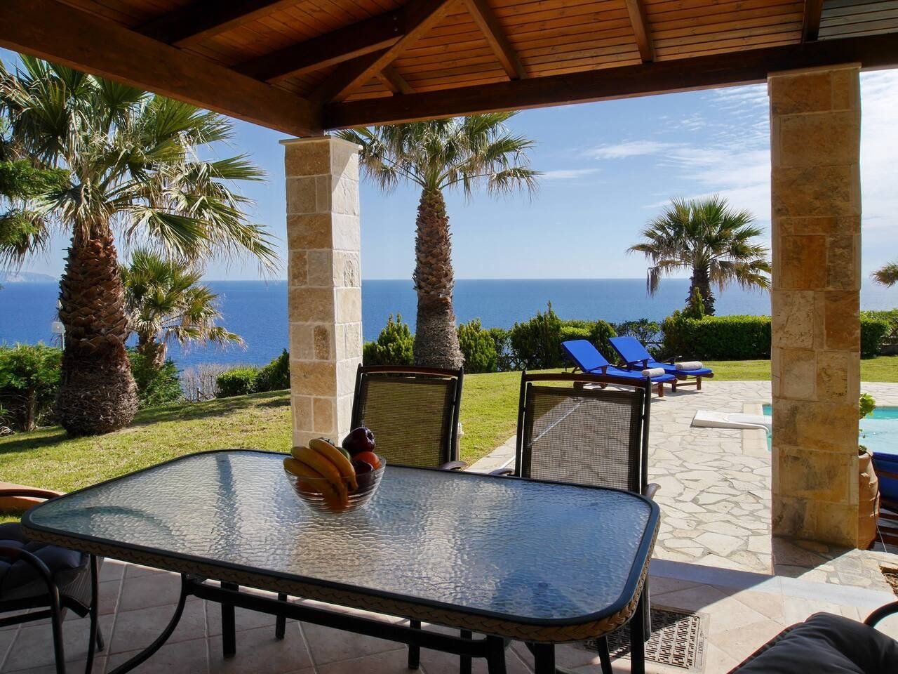 The real scene-stealer? Out on the long front balcony, which has prime views over the ocean and across to Zante. Thanks to the quiet location, it's easy to relax – whether you're swimming lengths in the pool, curling up with a book on the terrace, or sneaking in a siesta on the daybeds. For the adventurous, a rocky outcrop is a few metres down the hill, from which you can dive straight into the sea. Or why not head into Spartia, a five-minute drive away? Here you'll find shops, eateries and a picturesque sandy beach to enjoy in the Kefalonia sunshine.