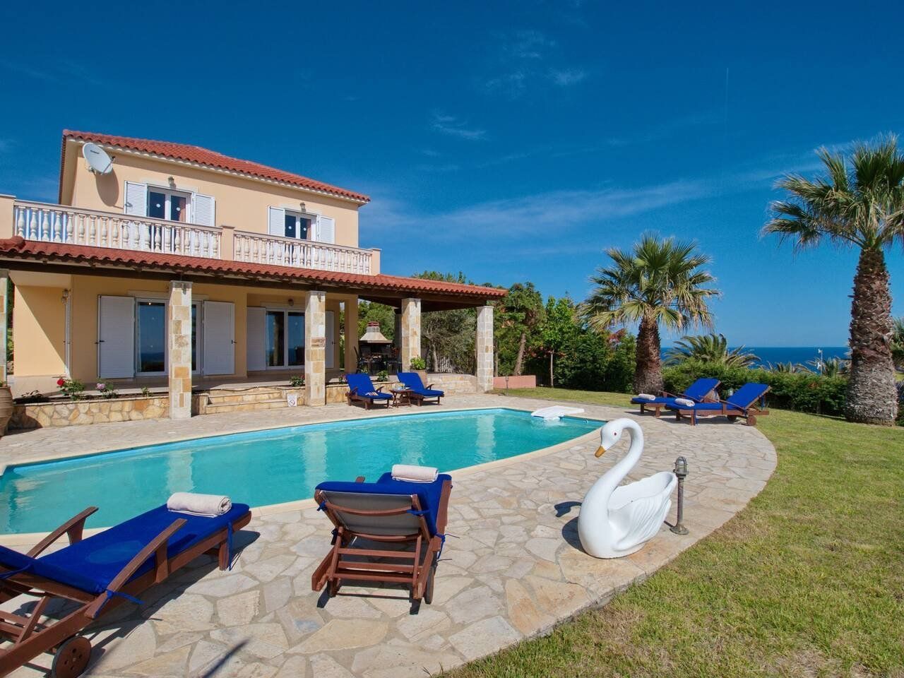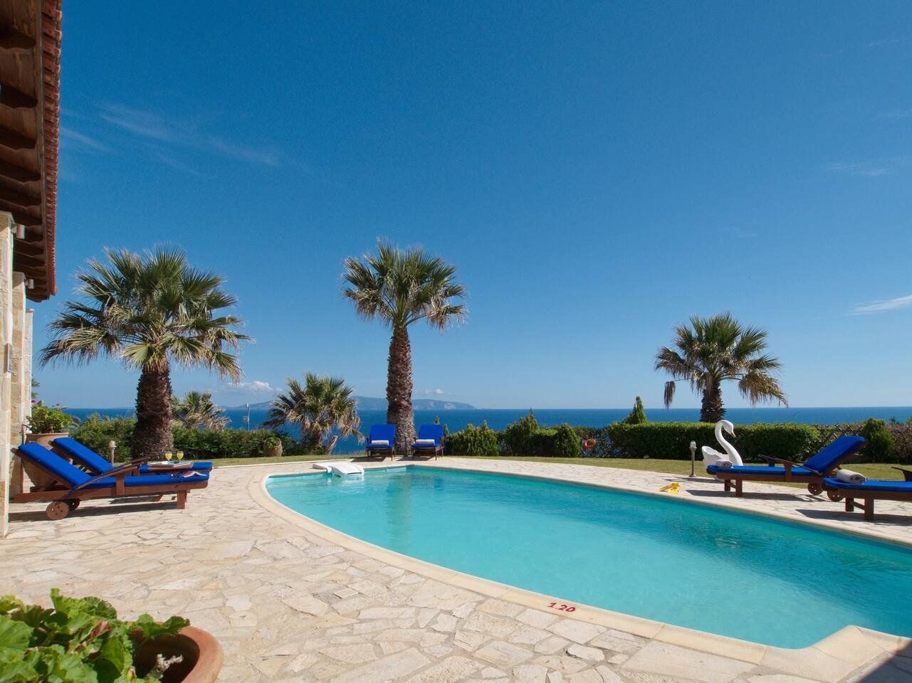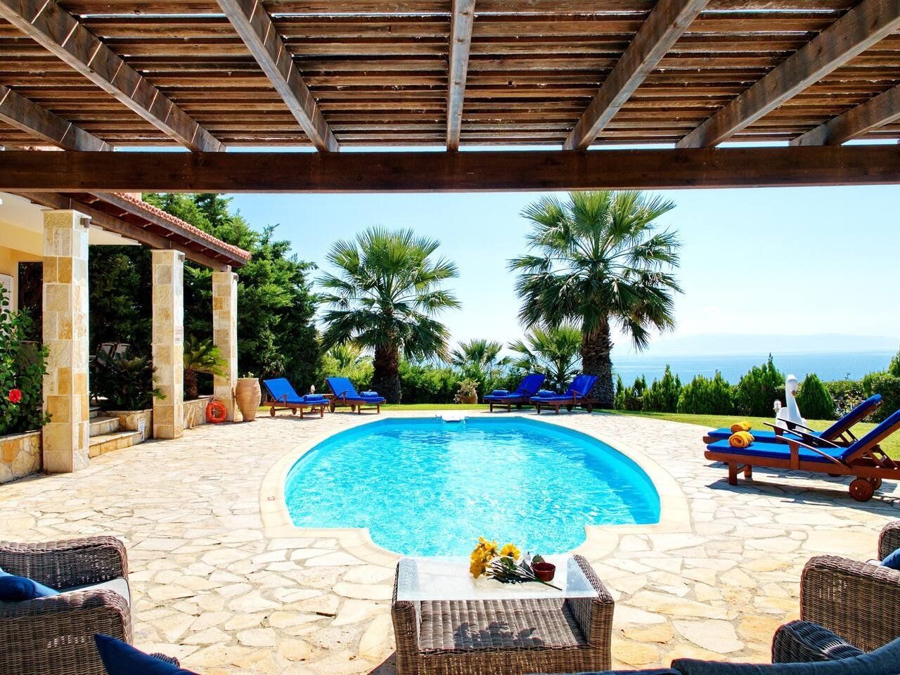 The Greek living we dream of on cold winter days is brought to life in this villa on the Liakias peninsular. Days are filled with blue; the turquoise swimming pool, the cerulean sky, and the aquamarine Ionian sea.