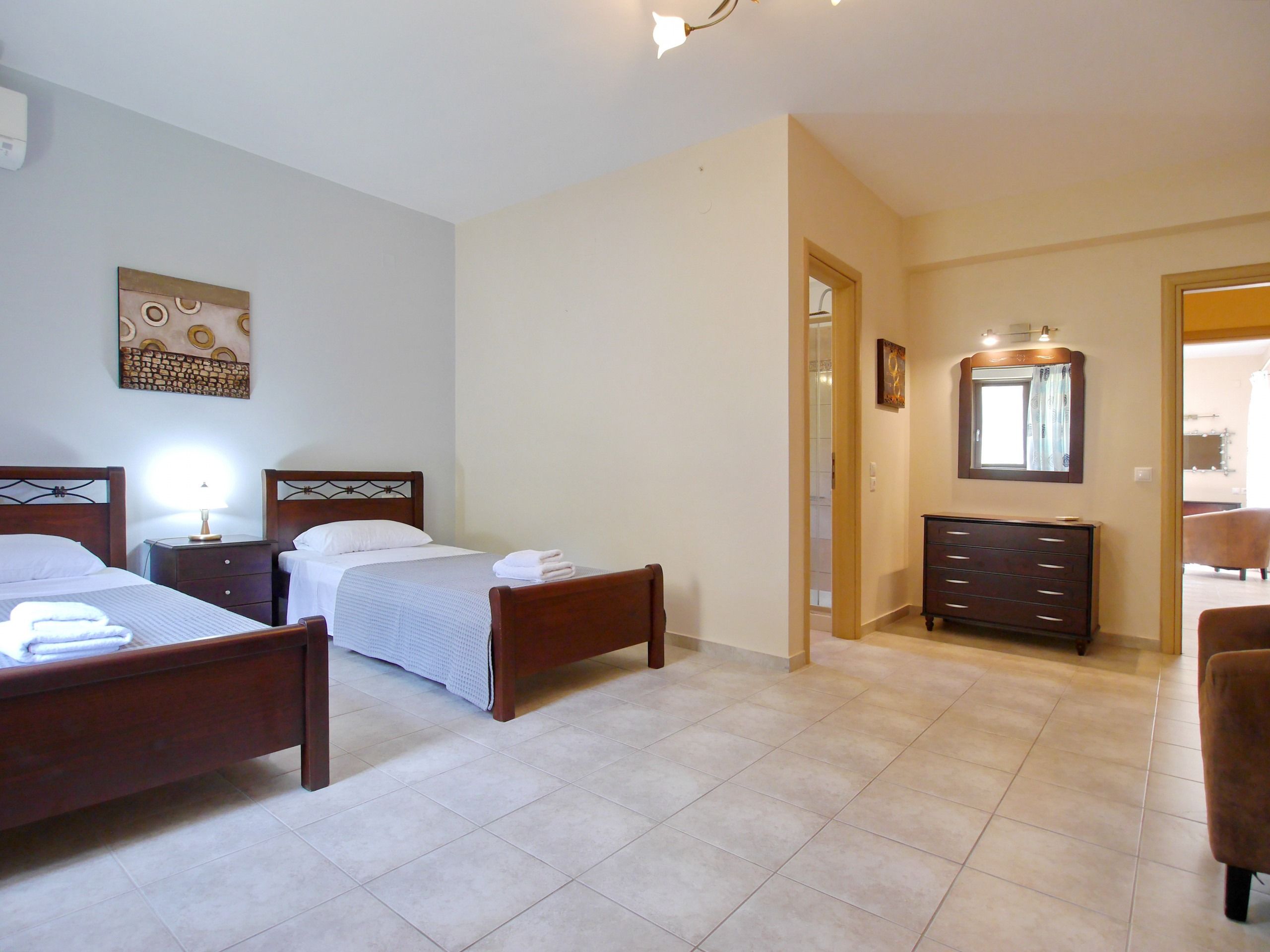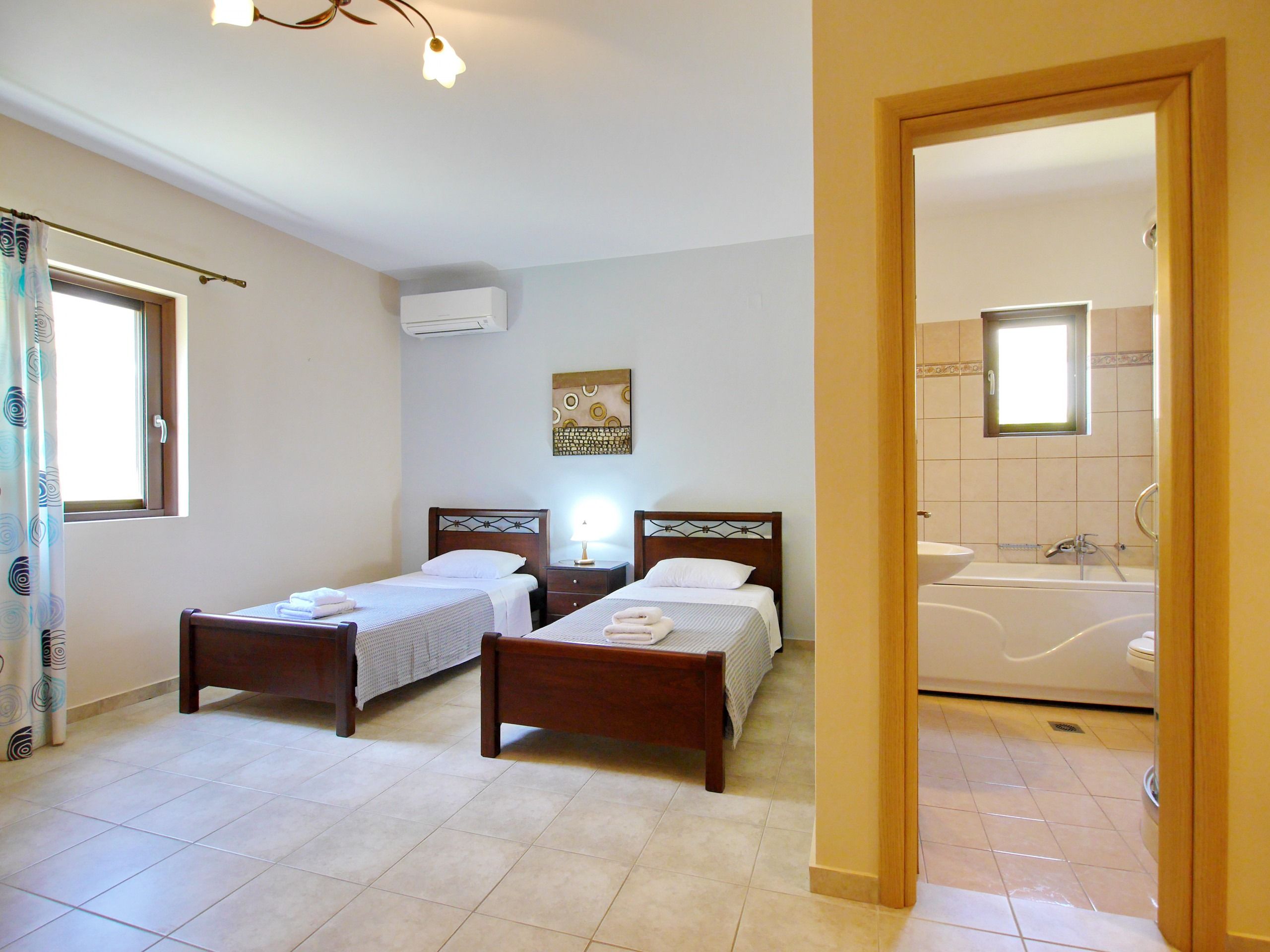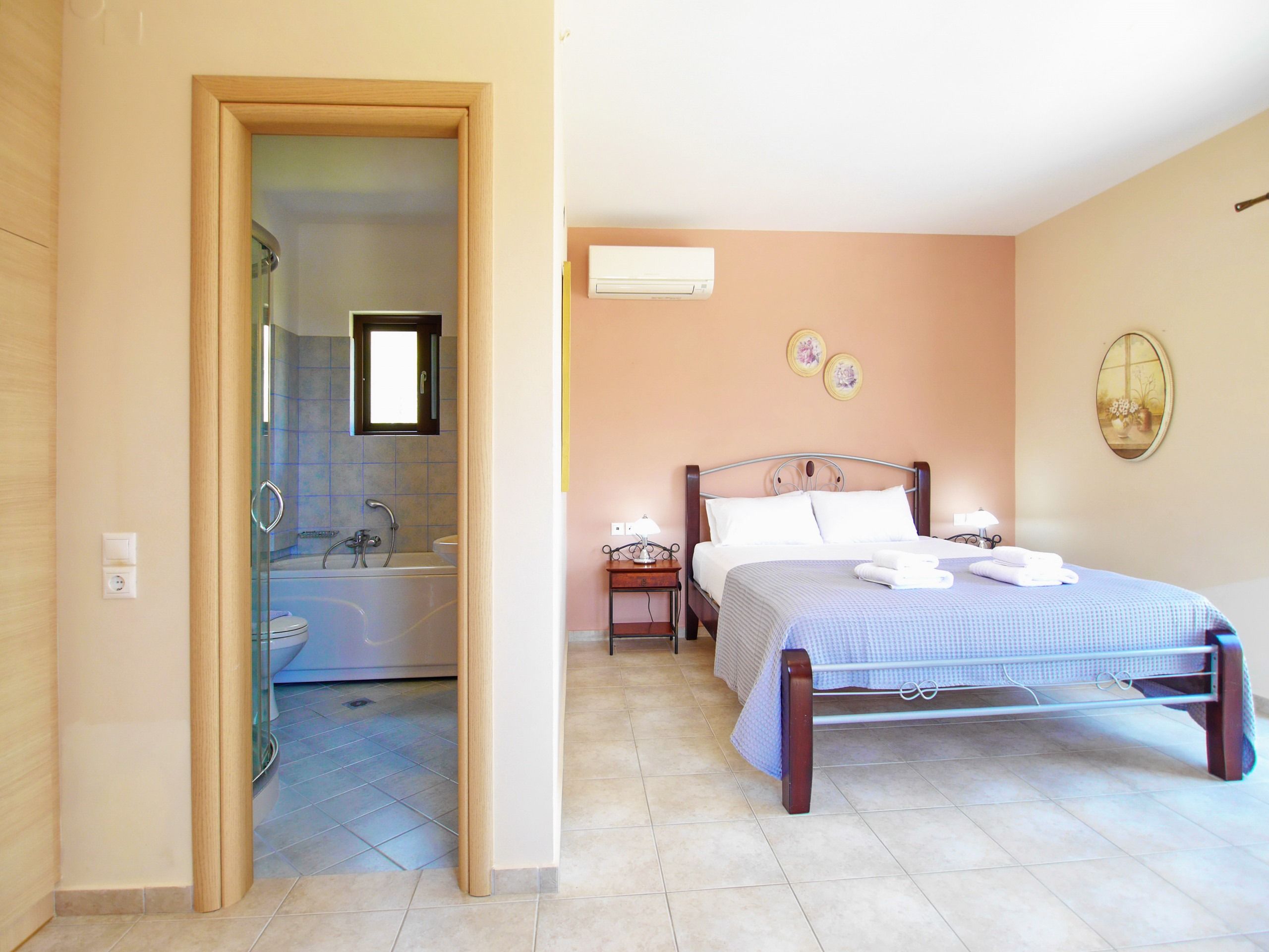 Inside, an open-plan living space is flooded with light from the sliding doors, with an L-shaped sofa for movie nights. Bedrooms bounce from orange to pastel blue, and each has its own en-suite for privacy. Two even boast sea-facing balconies. The decor may be a little dated (especially the kitchen), but it’s cosy and comfortable. And with easy access to the sea, a rocky beach a short walk away, and shops and tavernas within ten minutes by car, we reckon most of your time will be spent out and about.