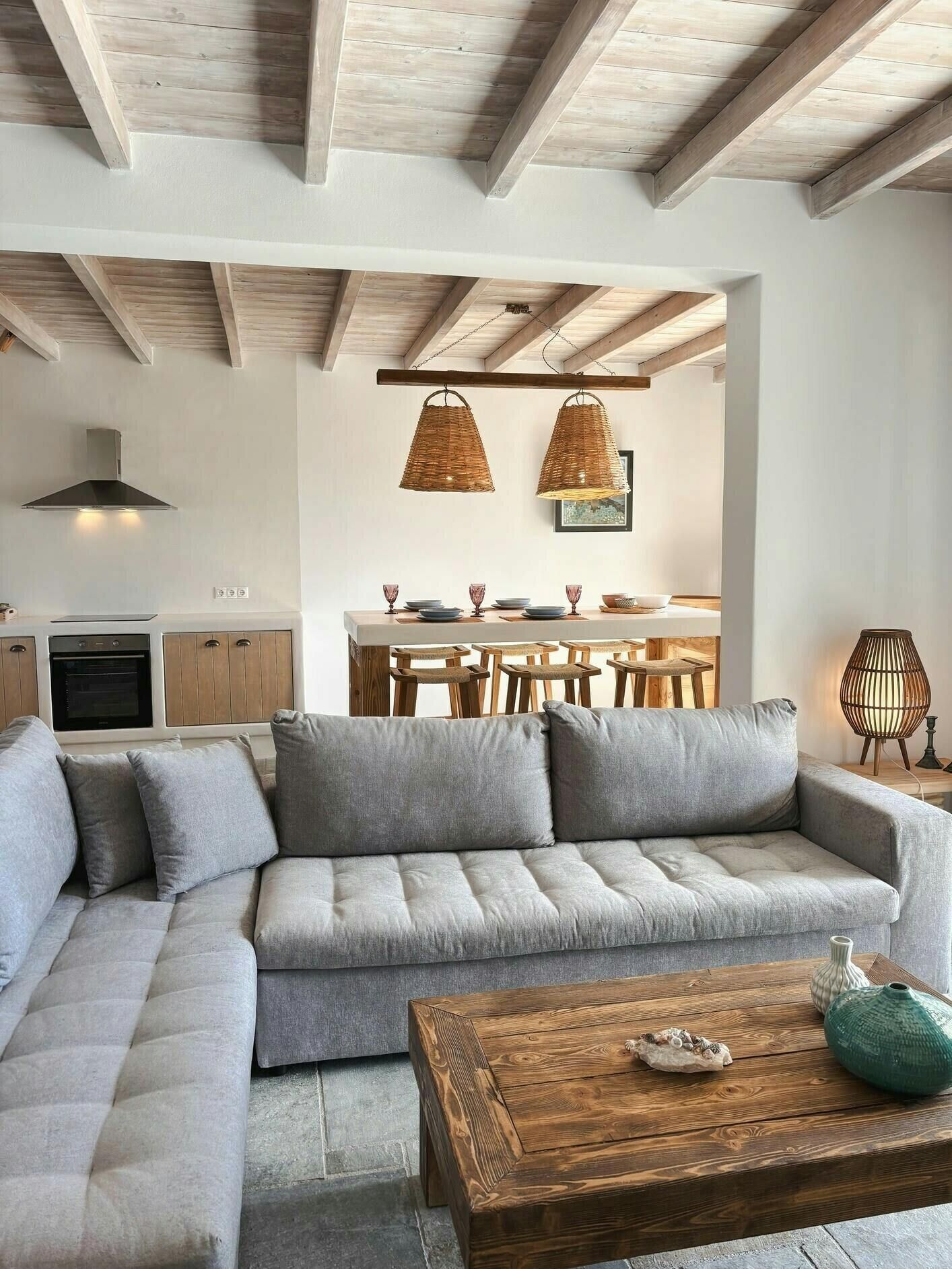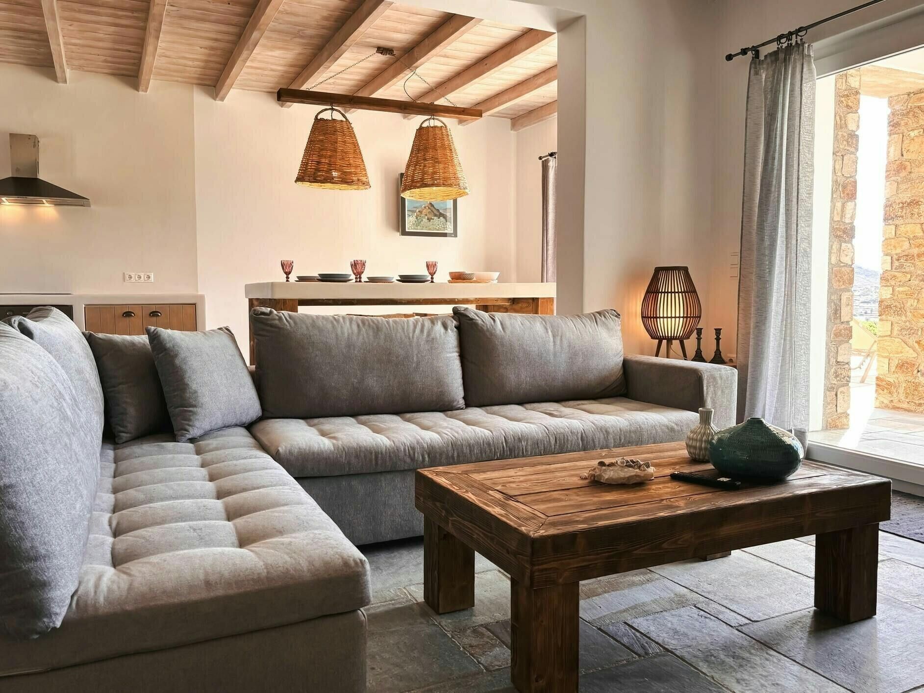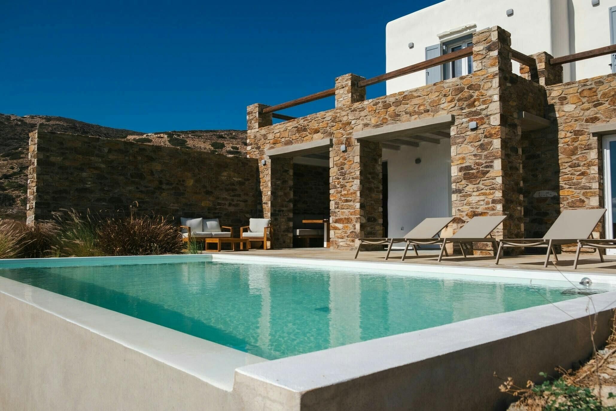 Perched in the hills of Epano Kampos, this home welcomes you to a laid-back island escape. You can stroll to Yialos Beach and Ios Port in just twenty-minutes. The famous monastery of Agios Ioannis just 15 kilometres and you’ll be surrounded by peaceful countryside. It’s worth noting the house is part of a complex, but it still feels private and you’ll be treated to a swimming pool as well as beautiful views. The rooms are simple and well suited to families with both bedrooms featuring en-suite bathrooms.