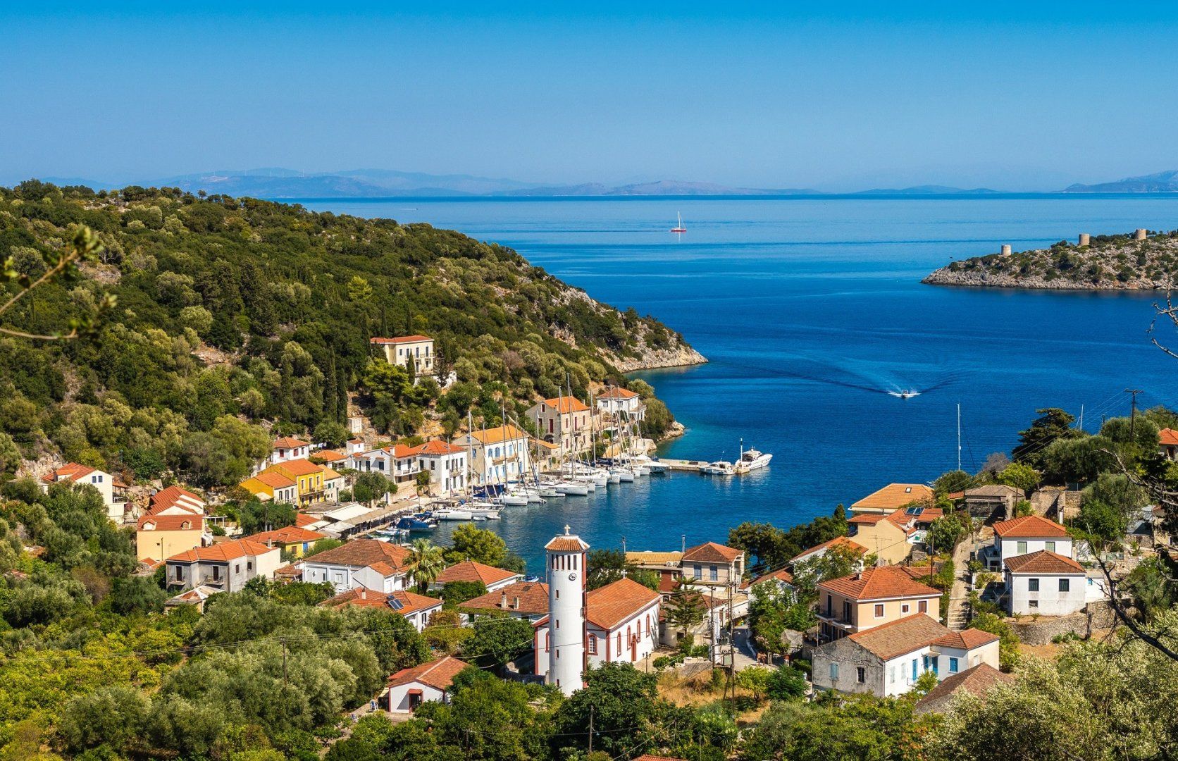 Perched on the hillside above a quiet, white-sanded bay, this villa has views for days. From the terrace, you can spot Polis Beach – a horseshoe of pristine sand and crystal water – which you can reach by private path in just a few moments. Down in the bay, you’ve also got a charming stone pier where you can charter a boat for the day. There’s a kantina here serving simple Greek food, or you can make the twenty-five-minute walk (or five-minute drive) to Stavros in the hills for a little more choice.