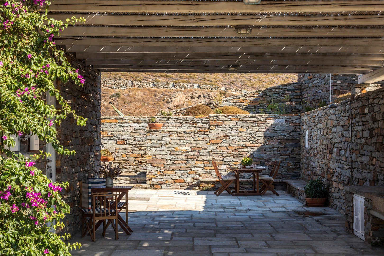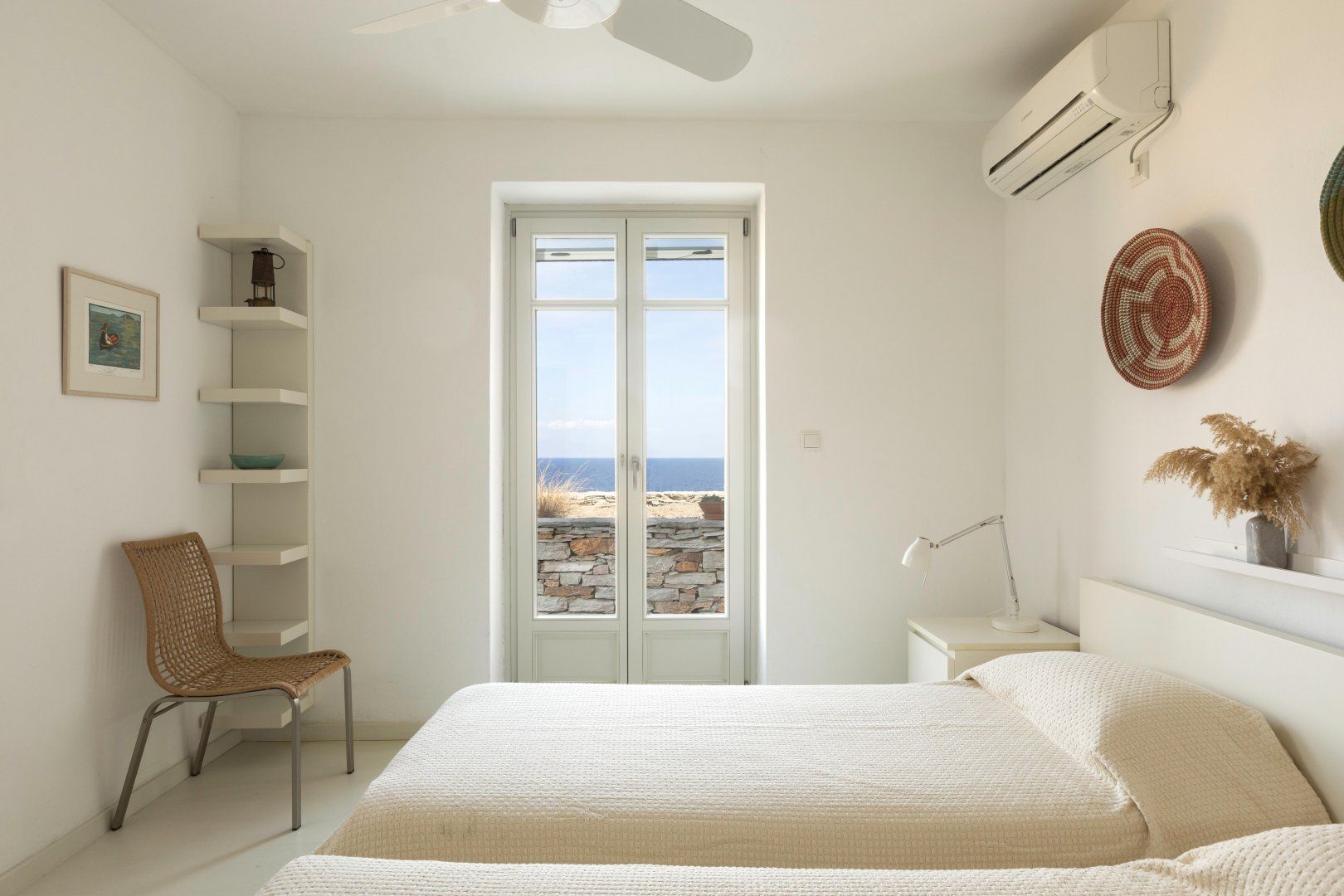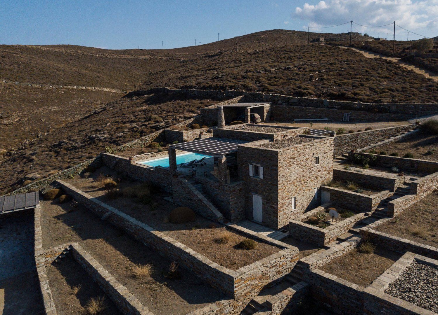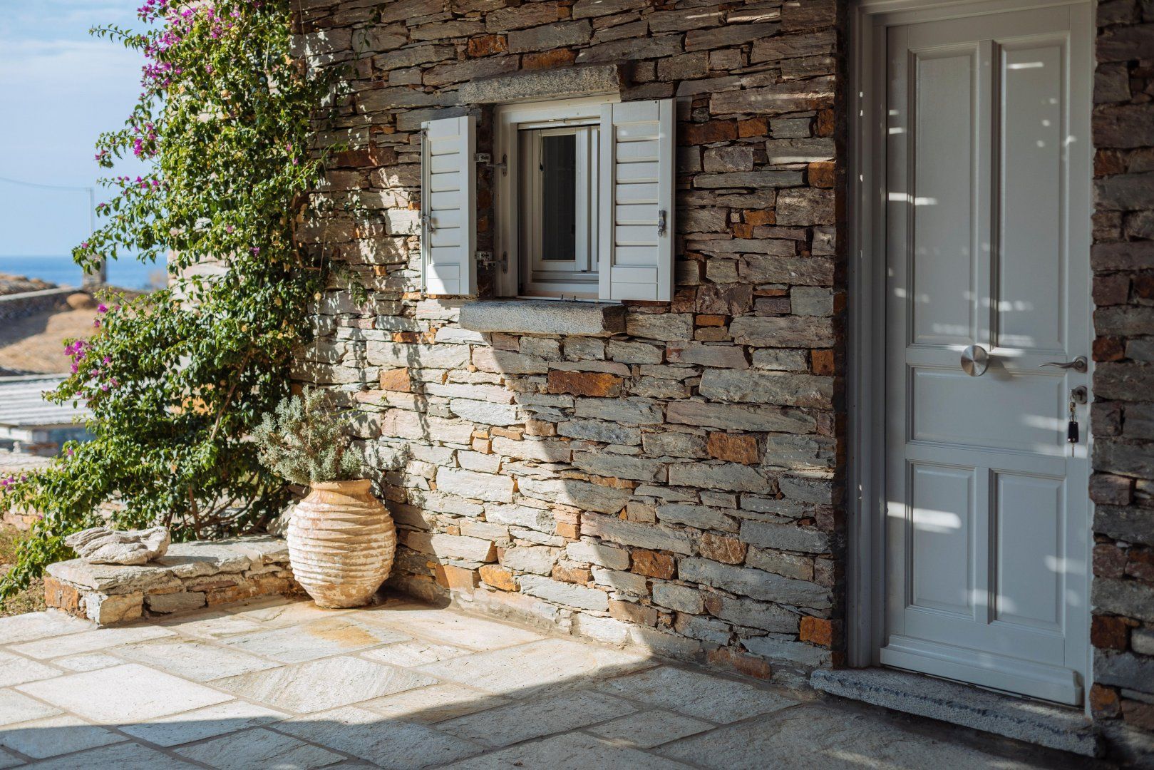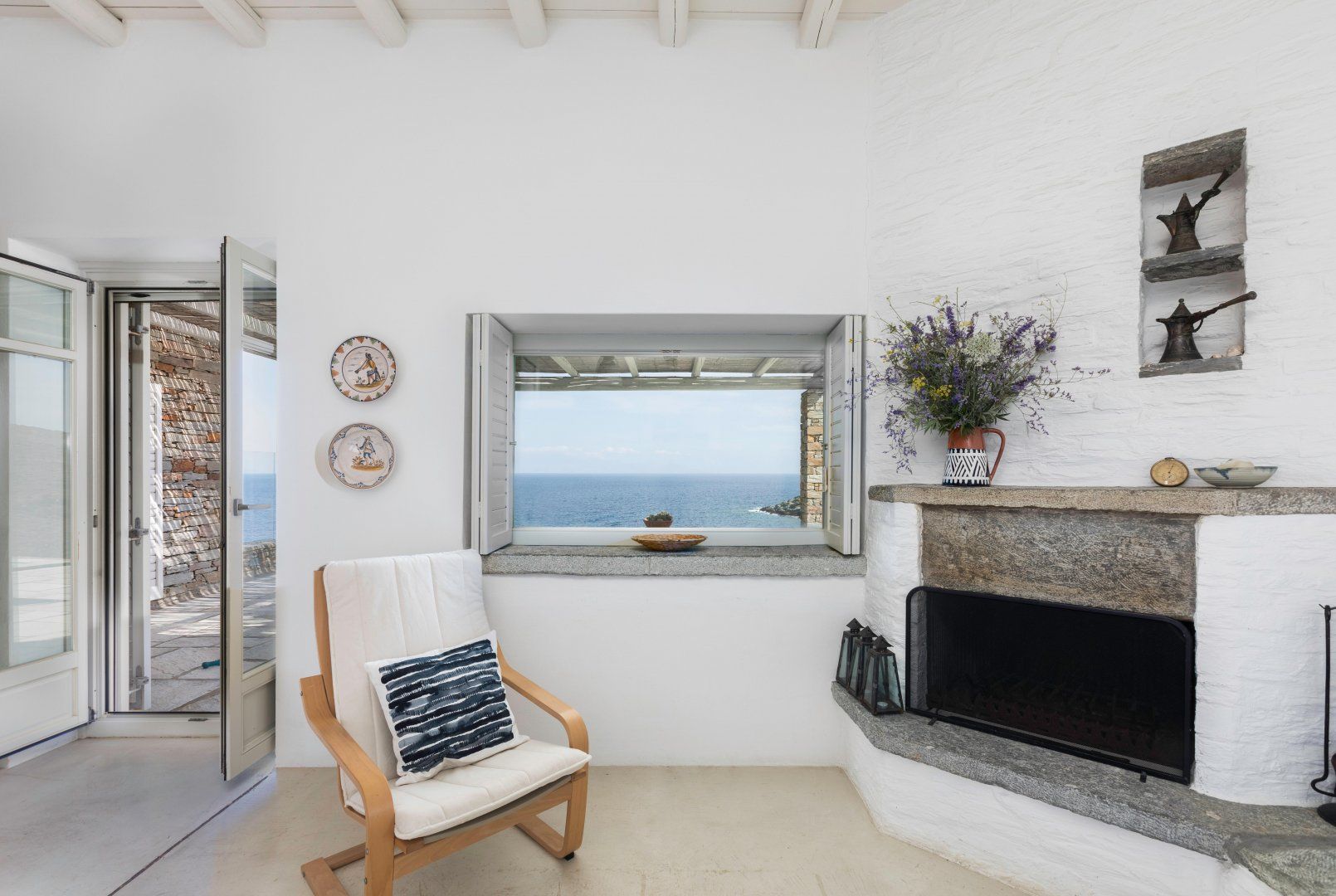 This amazing Greek villa is located on the North-East coast of the Island of Kea. The stone house looks out over the beautiful turquoise ocean with a view of the island of Euboea and the coast of Attica.