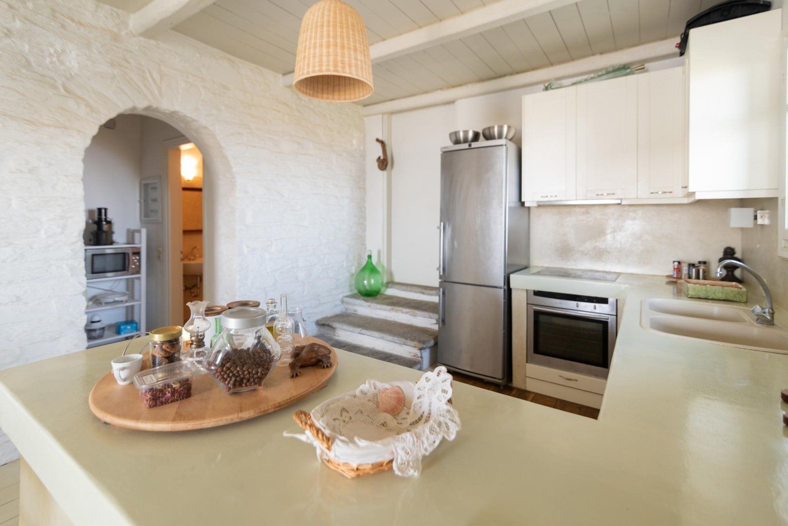 You'll feel the revitalising embrace of this home as soon as you enter – the calming palette of off-white and sage green compliments rather than competes with the beautiful surroundings. Characterful furniture sets the space apart (we're looking at the artist's easel, in particular), while painted wooden beams nod to traditional Grecian homes.