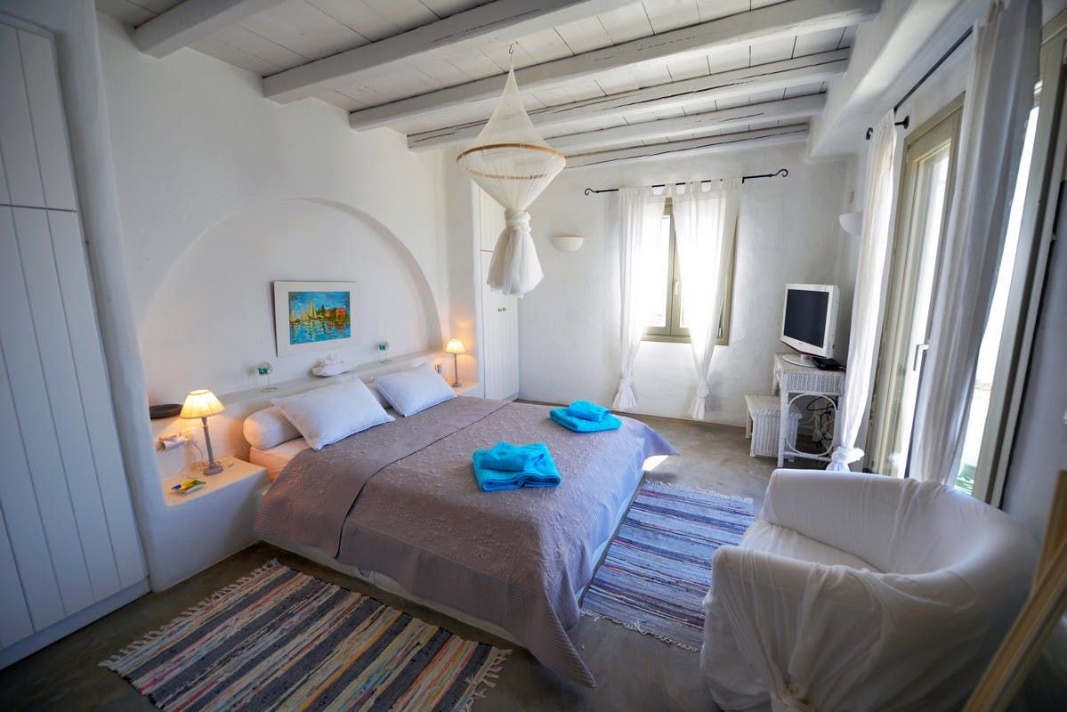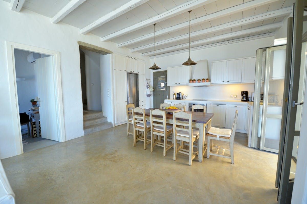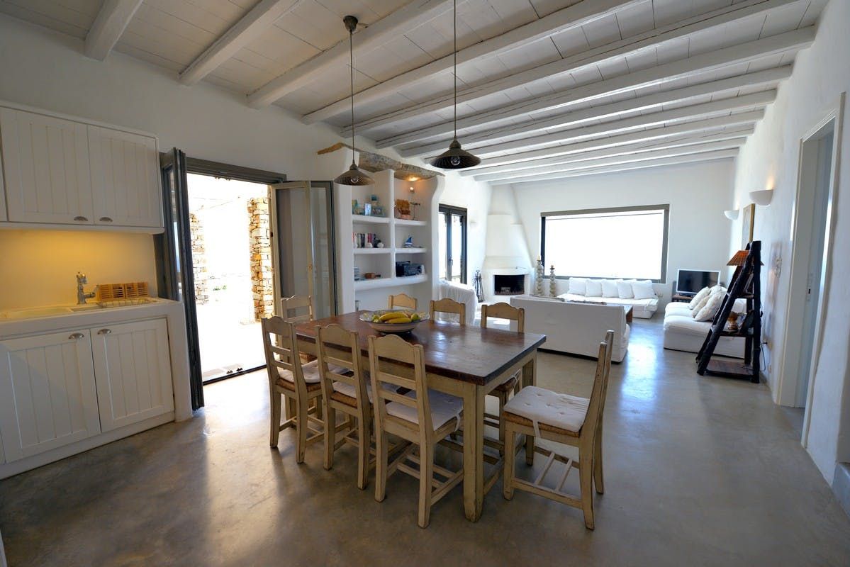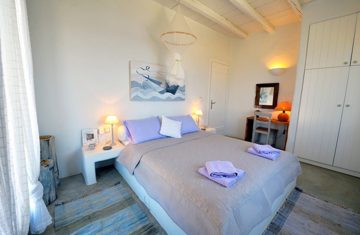 Located in the area of Mellisaki, besides the sea views, the villa sets the scene for an experience typical of the Cyclades. White-washed stone walls, exposed wooden beams, and a beachy aesthetic remind you of your gorgeous location, all while encouraging you to kick back, relax and reset in paradise.