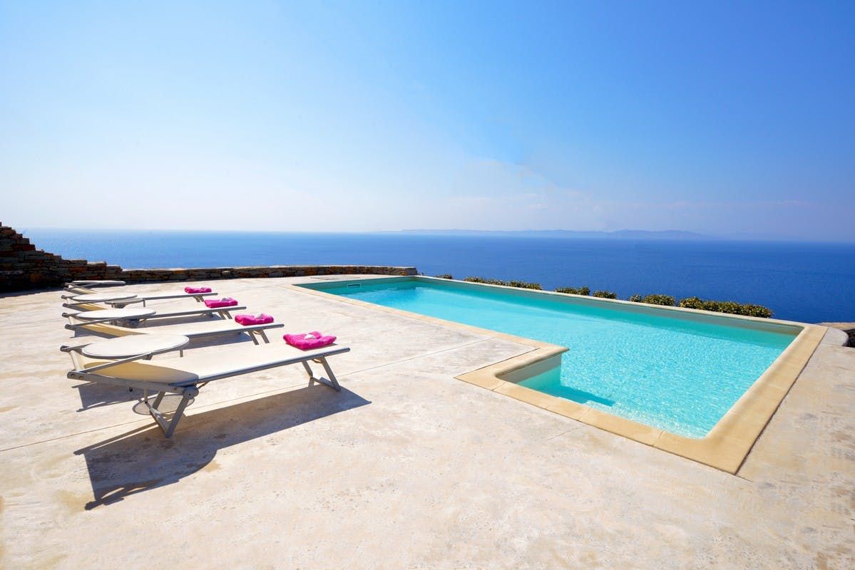 Prepare to be left jaw-dropped by the infinite blue views here. With a panoramic terrace offering 180-degree vistas overlooking the sparkling seascape – this villa in Kea invites guests to indulge in its utterly blissful setting equipped with an array of home luxuries.