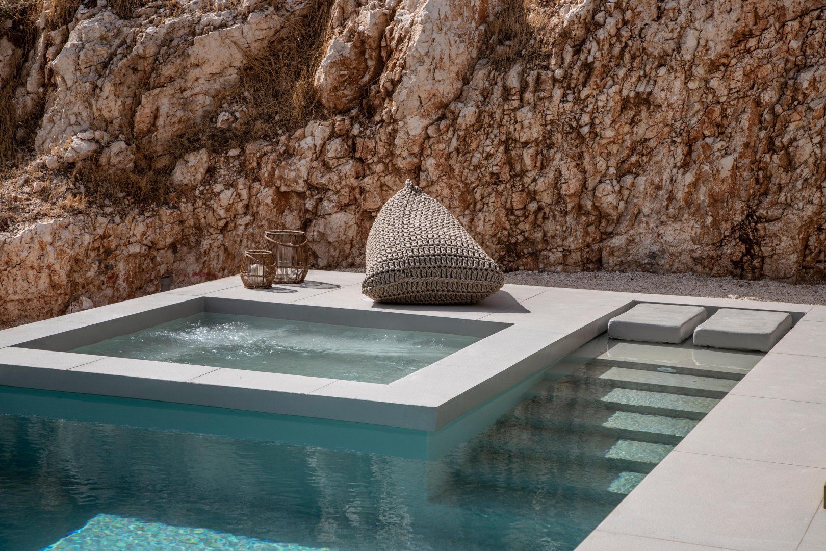 Outside, the pergola shaded dining area is the ideal spot to tuck into your complimentary breakfast and overlooks the crystalline infinity pool and jacuzzi. There's even a discrete outdoor shower nestled in the villa's stone walls, perfect for cooling off after a trip to the beach. With ample seating, including a plush outdoor lounge space and fire-pit nestled at pool height, you'll never want to leave this elegant pocket of paradise.