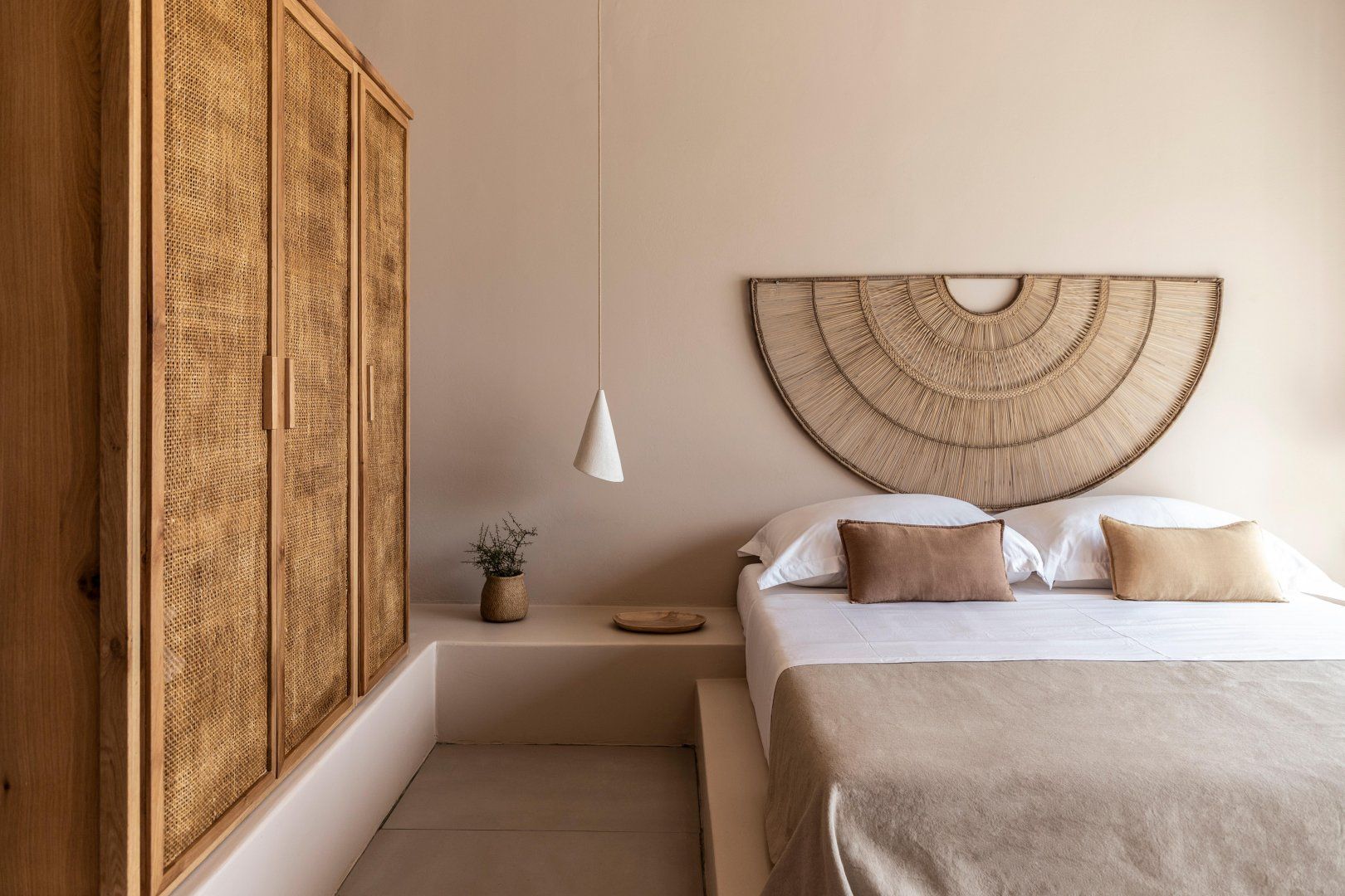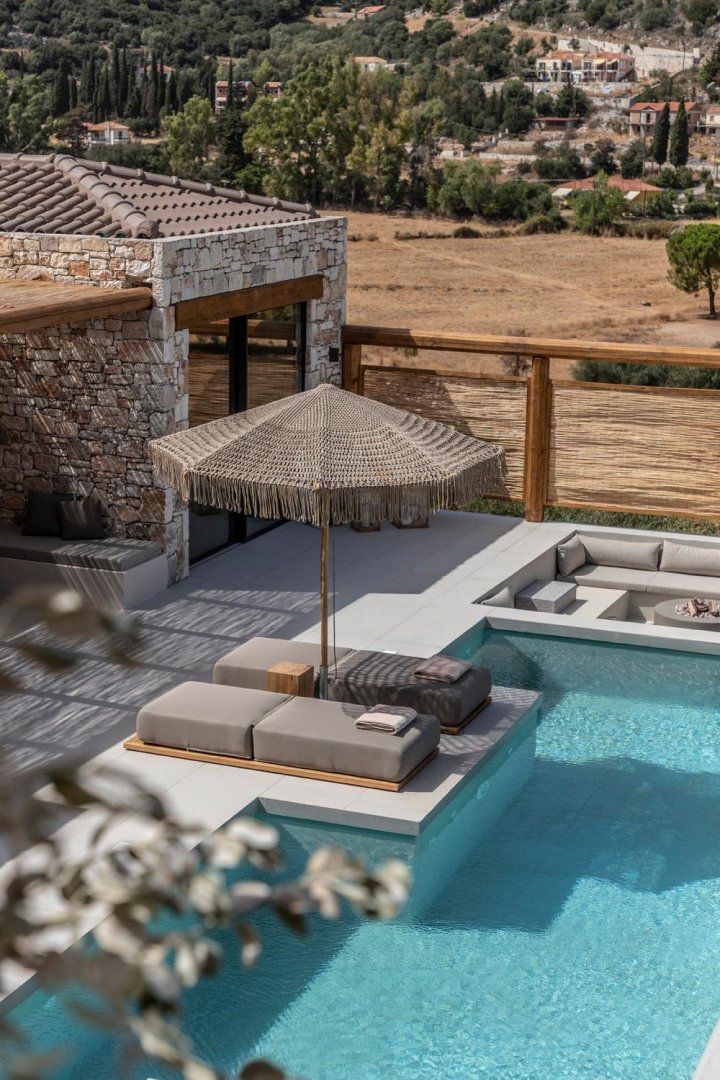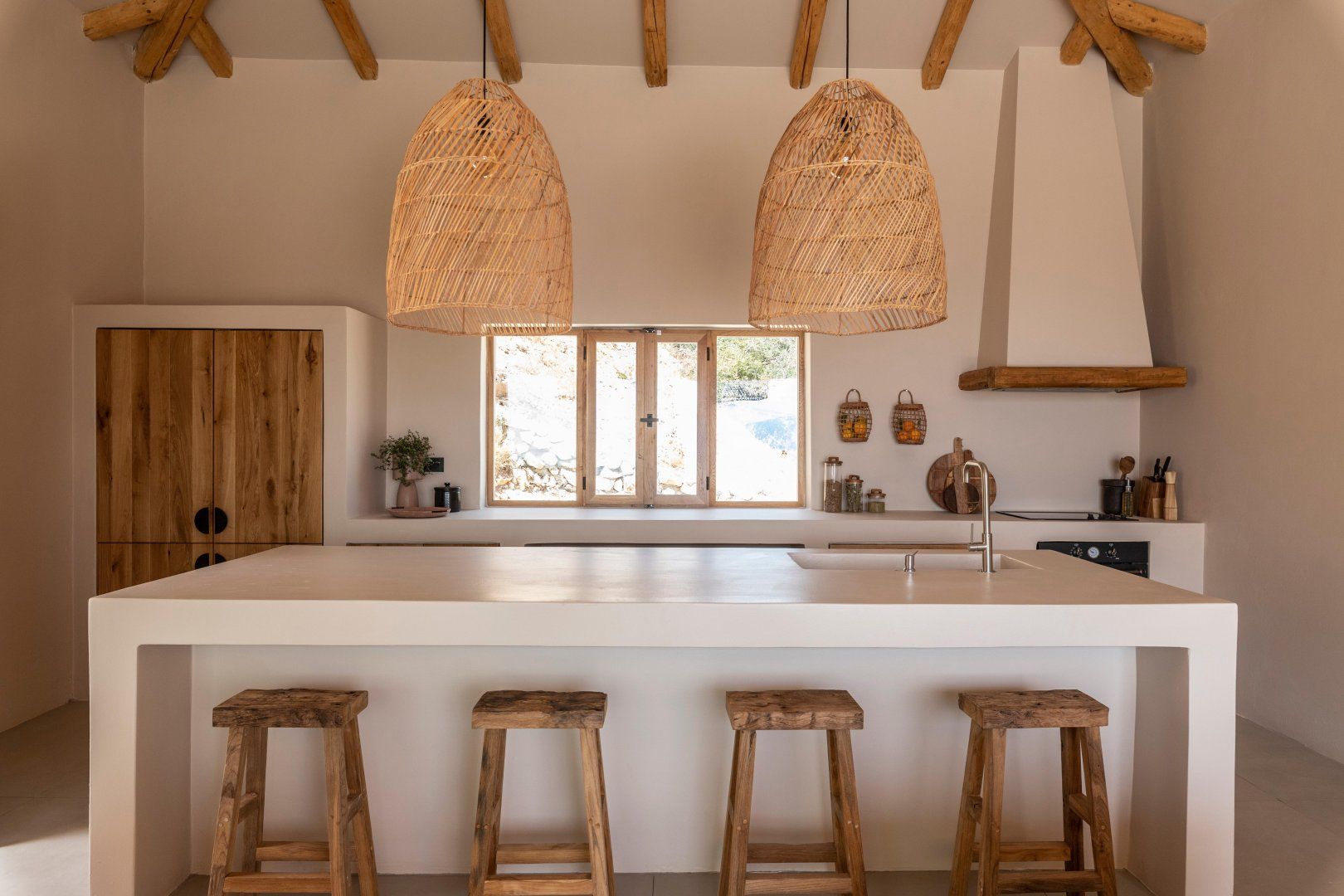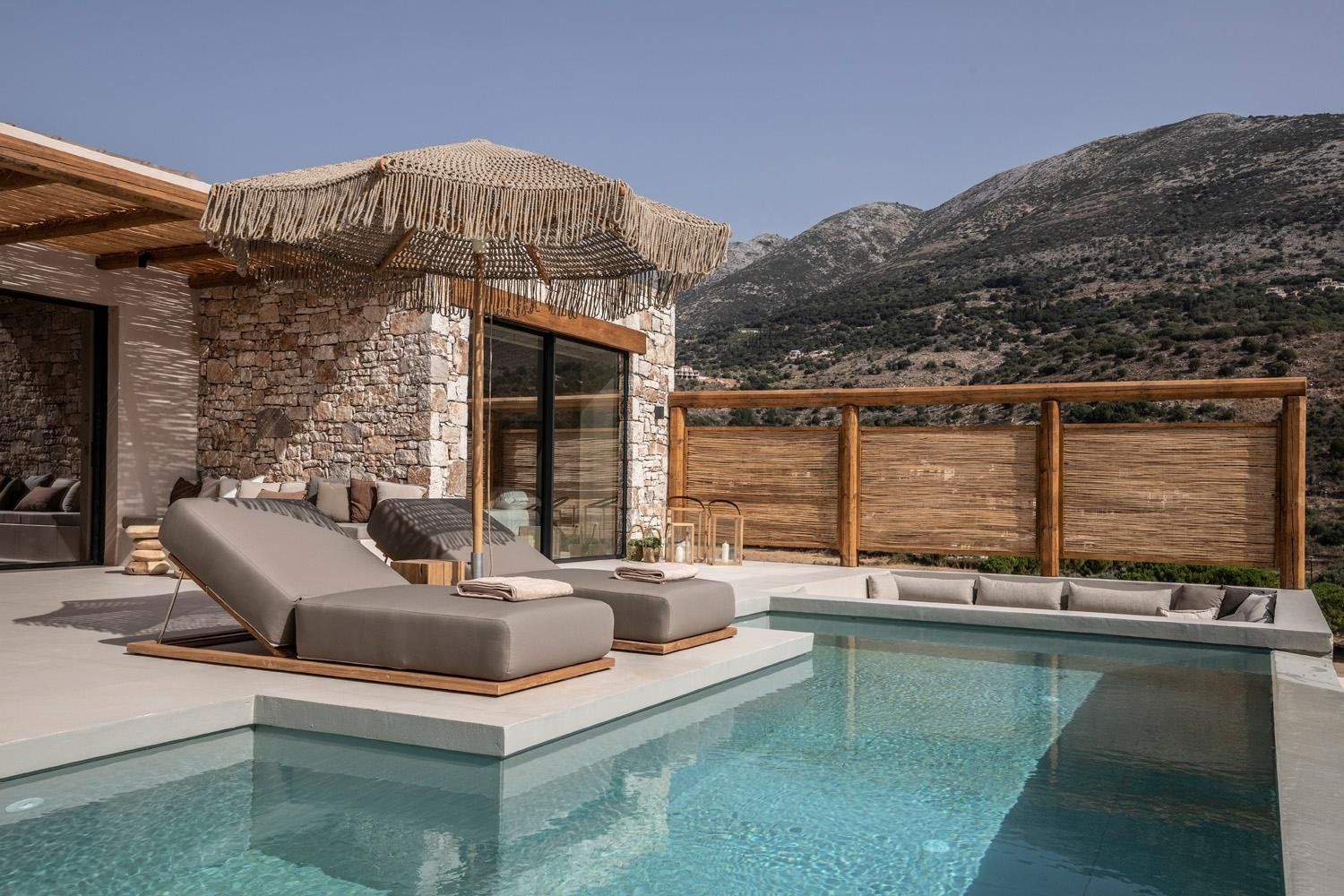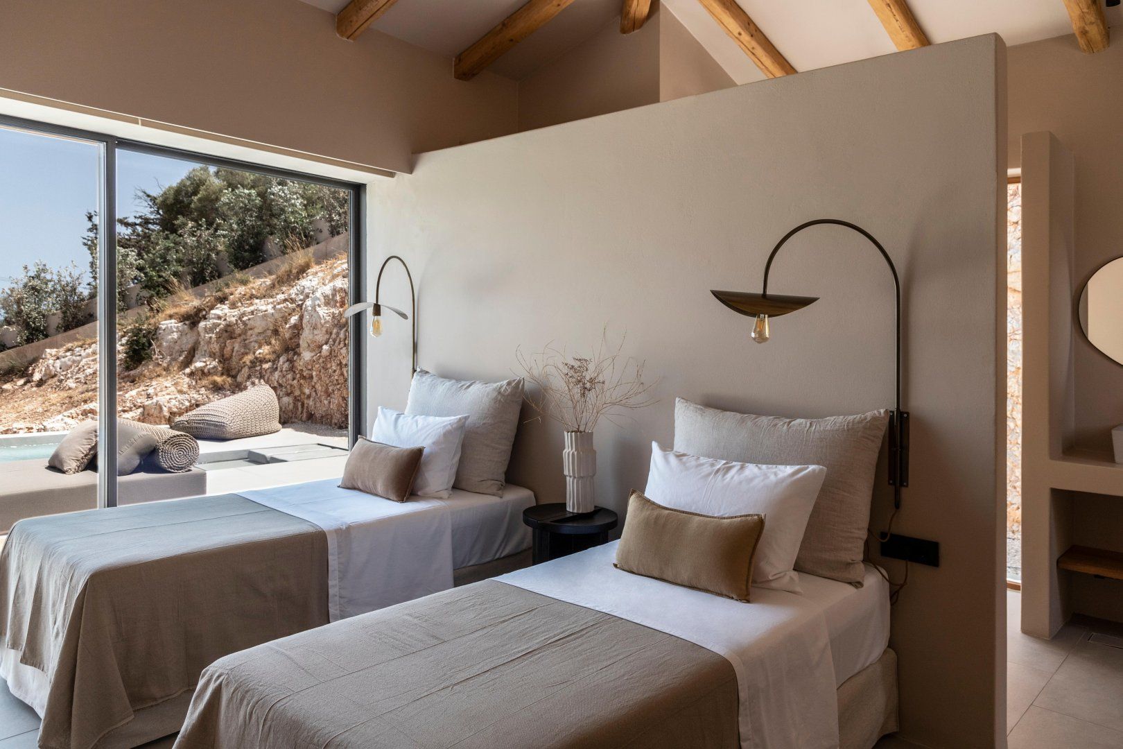 Built using local stone, the home is an ode to the designer's lifelong infatuation with the island. Every detail works to celebrate Cephalonia's enchanting landscape. Interiors are cloaked in a neutral colour palette of creamy beiges and slate greys, creating a calming canvas. Meanwhile, warm timber beams and earthy linens complement the lush foliage nearby. Though each room offers stunning views, the outdoor terrace is the property's masterpiece. From the open-plan kitchen and lounge, open the large sliding doors and enjoy sweeping verandas of the sparkling sea and charming rooftops below. You'll love spending peaceful mornings here, coffee in hand, soaking up the soft rising sun.