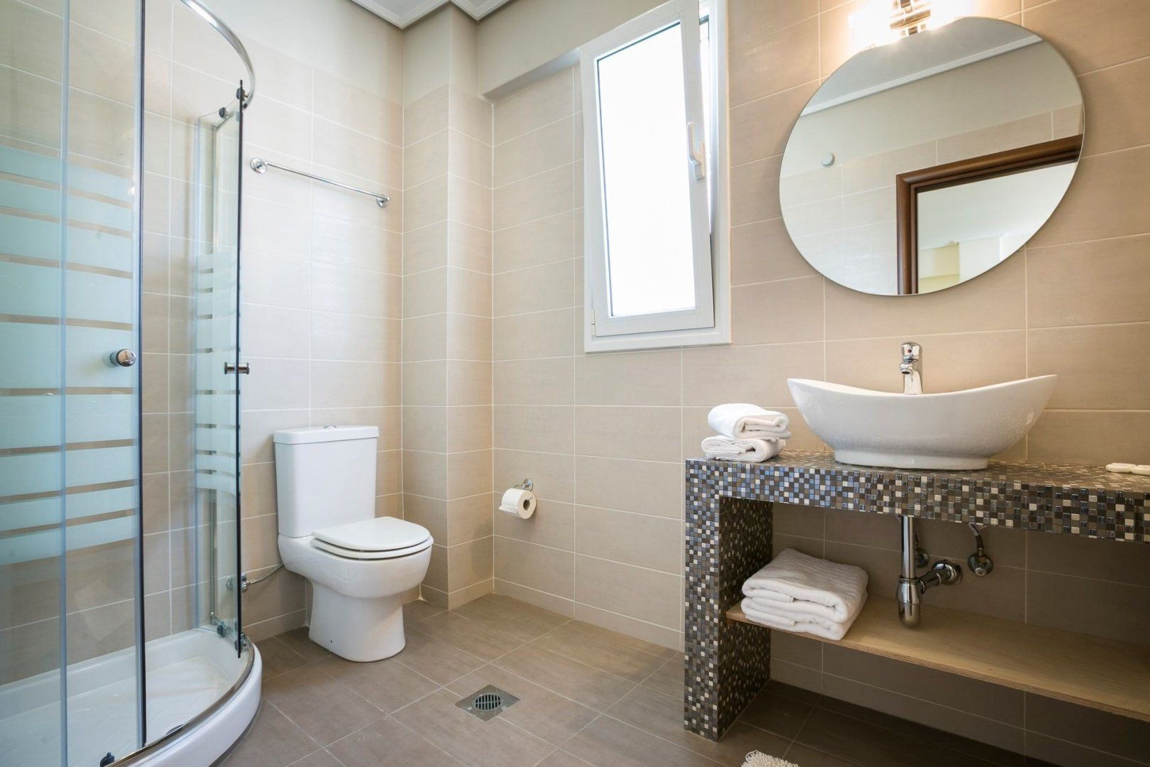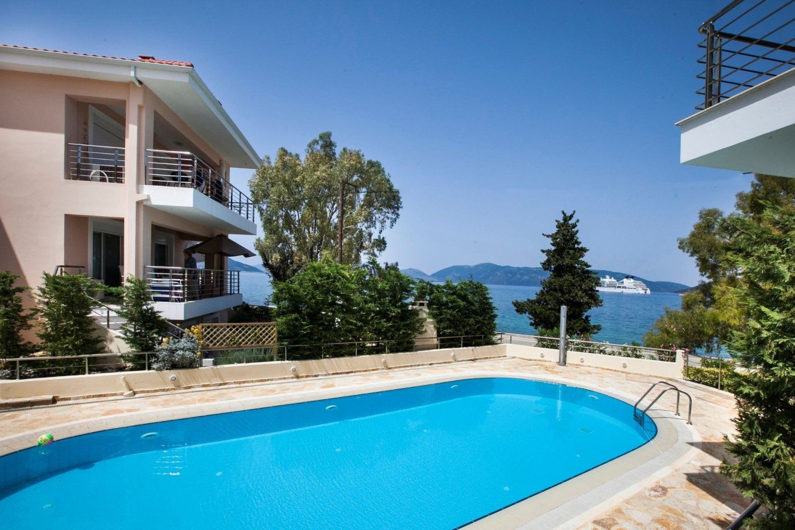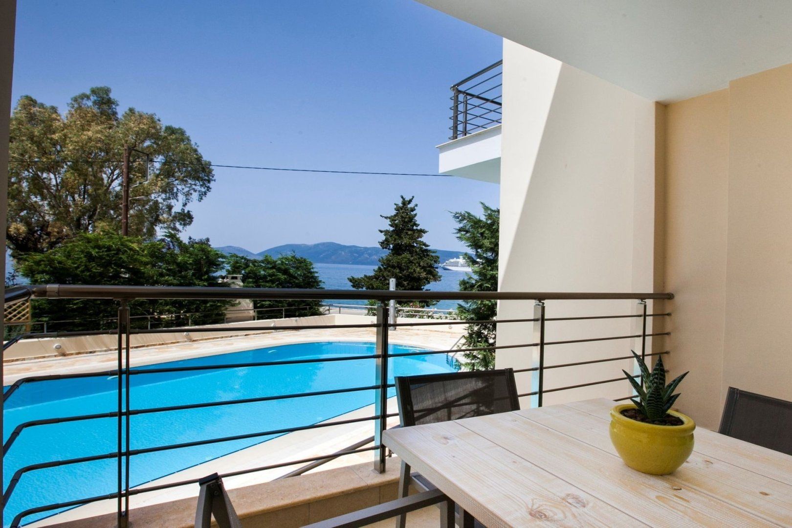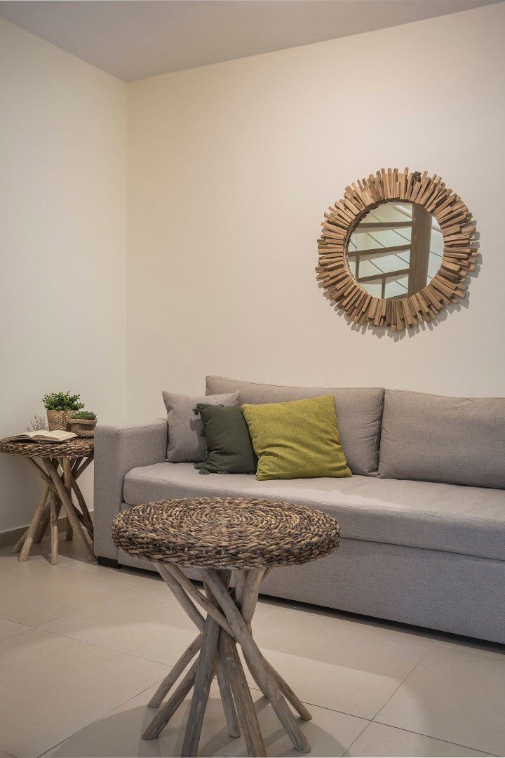 Pour yourself a glass of local wine and step outside to admire the vista. From your sandy-hued home, it would only make sense to have the sea alongside. While the residents’ swimming pool below is the first port of call, the Ionian Sea itself is just a little further in the distance. We recommend gazing out at these azure tones while nibbling olives on the decking.
