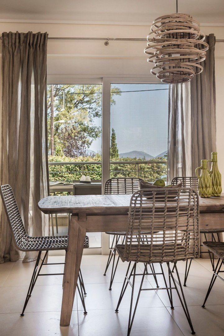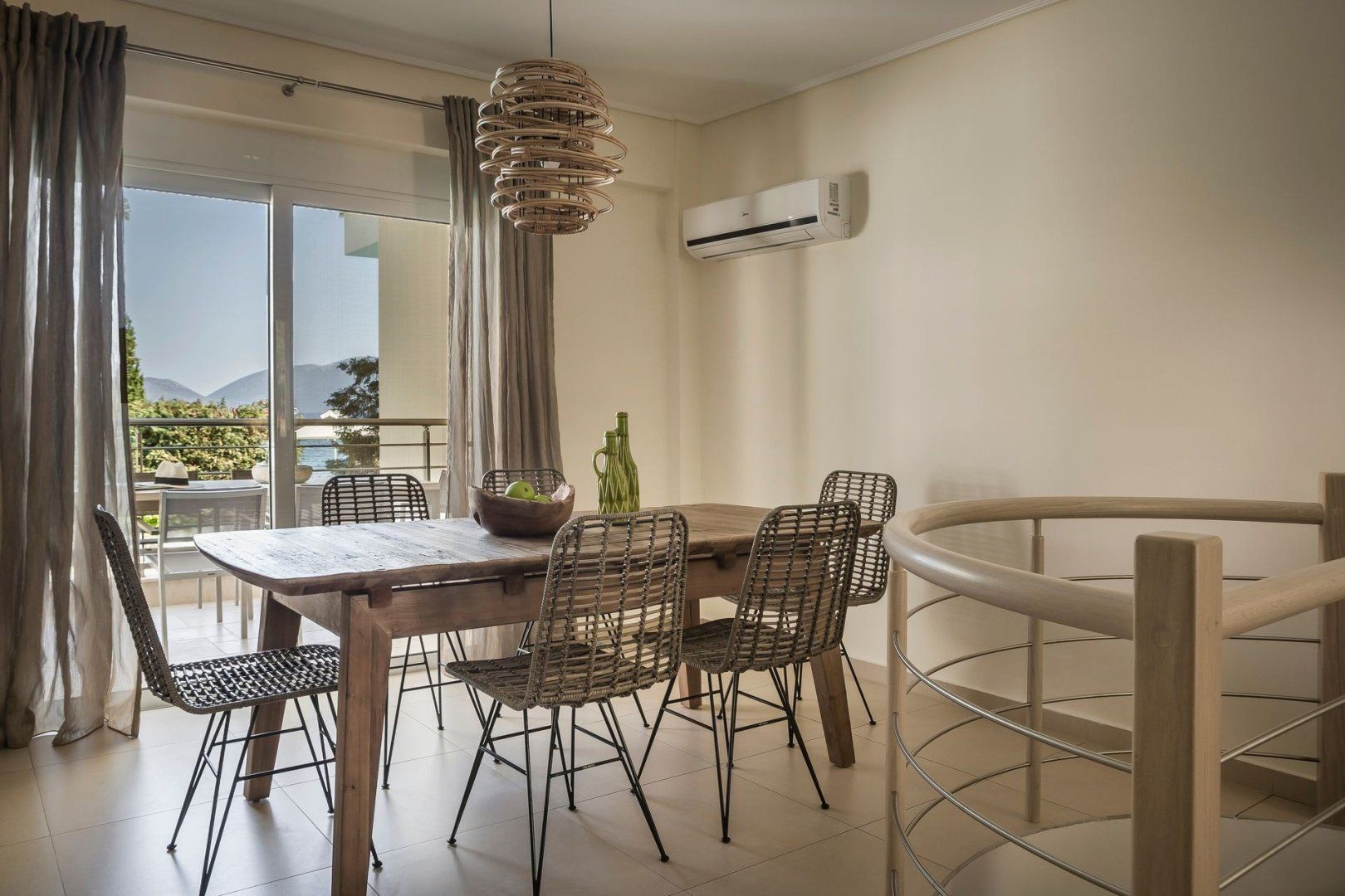Merging into the organic scenery of this island, the home offers a calming decor of sandy tones, reminiscent of nearby beaches. Wicker and wood furniture add to this natural vibe, which continues from the dining space into the bedrooms. Rope-framed mirrors and solid log stools put even more emphasis on this rustic, beachside theme – as does the fabulous view from the terrace.