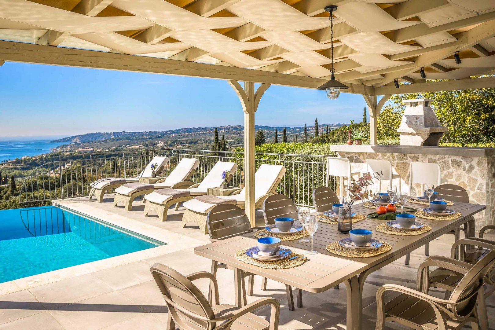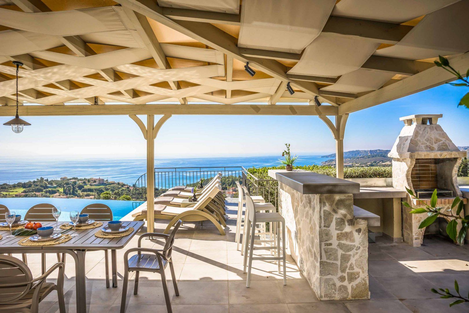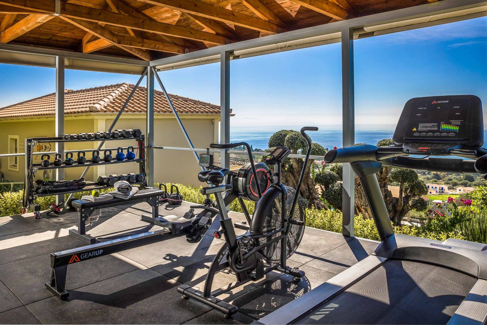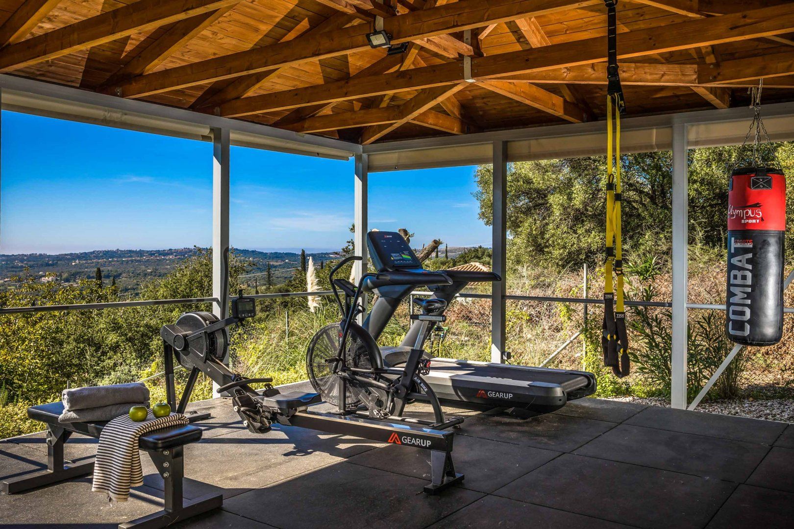 Nestled in the Kefalonian countryside above a small track leading down to Trapezaki beach, this villa has endless panoramas of the sweeping Mediterranean coastline. Set in a great location, you'll reach Trapezaki in just a short walk and its host of shops and restaurants serving up delicious local delicacies. Or why not grill up a feast back at the villa with the wonderful brick barbecue and wood-fired oven. Inside, you won’t be short of sea views with all ensuite bedrooms leading out to the terrace or upper floor balcony. Looking to work up a sweat before a dip in the infinity pool? Follow a short path to the air gymnasium shared with the villa next door.