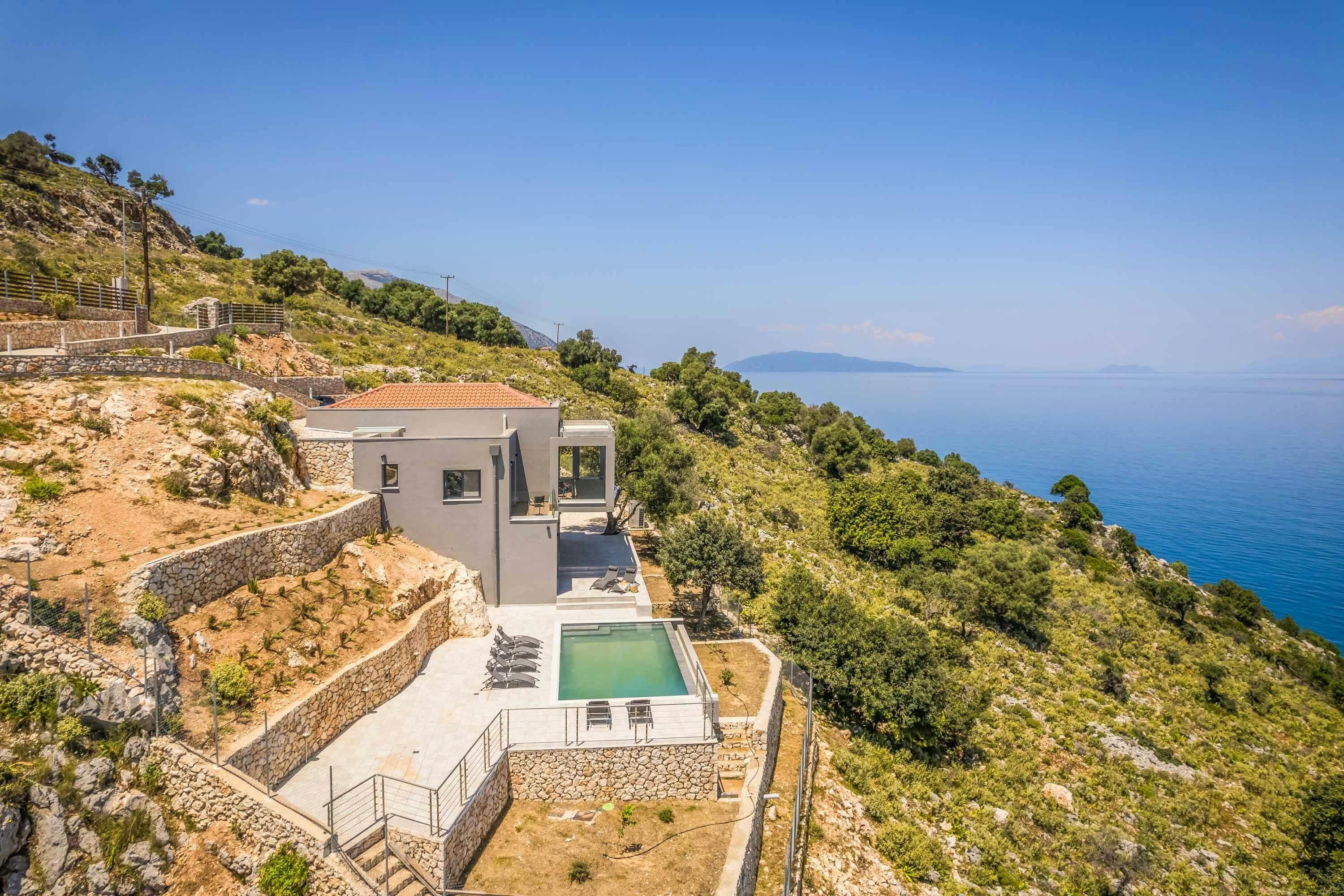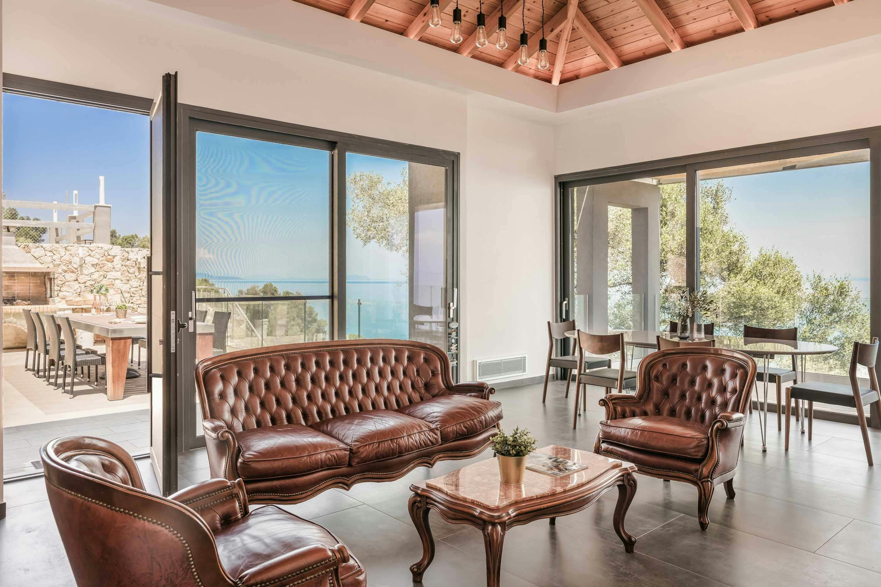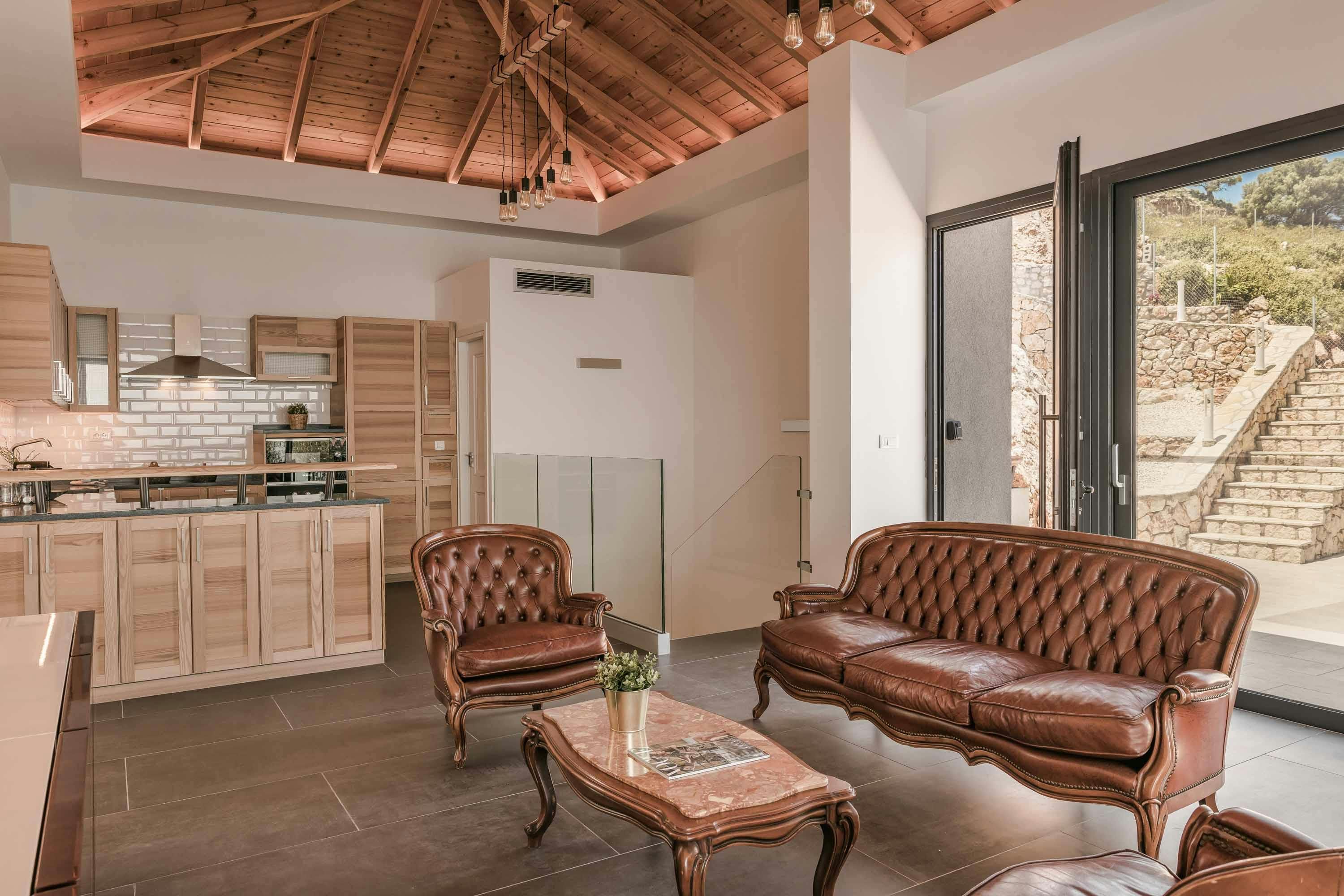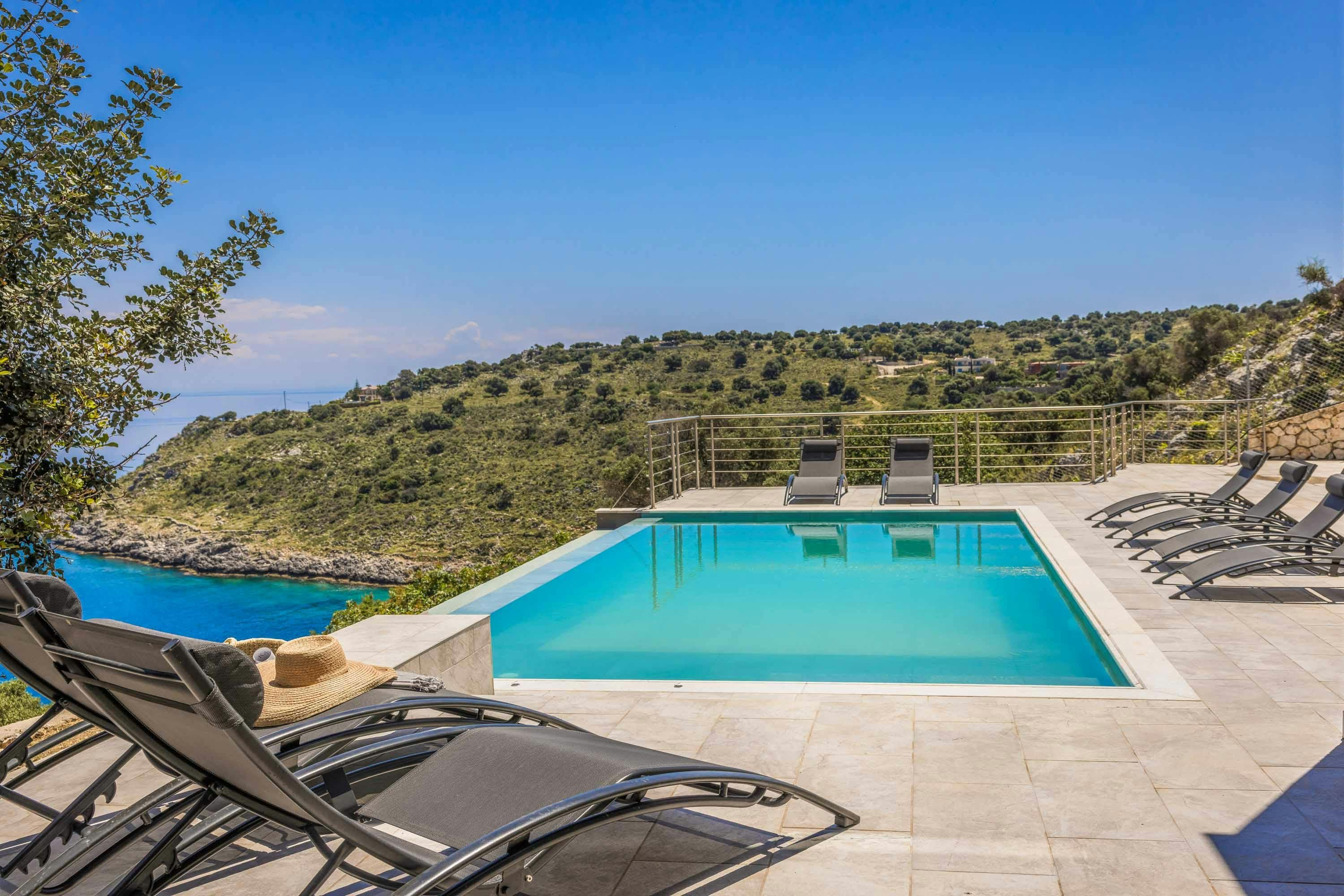 Set into the steep Skala cliffs, this villa has enviable Ionian Sea views from the multi-level terrace area and infinity pool. There’s a large brick-built barbecue for cooking alfresco lunches and dinners as well. Set over two floors, there are vistas from every room, too. And we love that every bedroom has its own terrace or balcony. Location-wise, well, you are just a short drive along the cliff tops from the main resort town of Skala, with its range of restaurants, shops, and one of the sandiest beaches on the island.