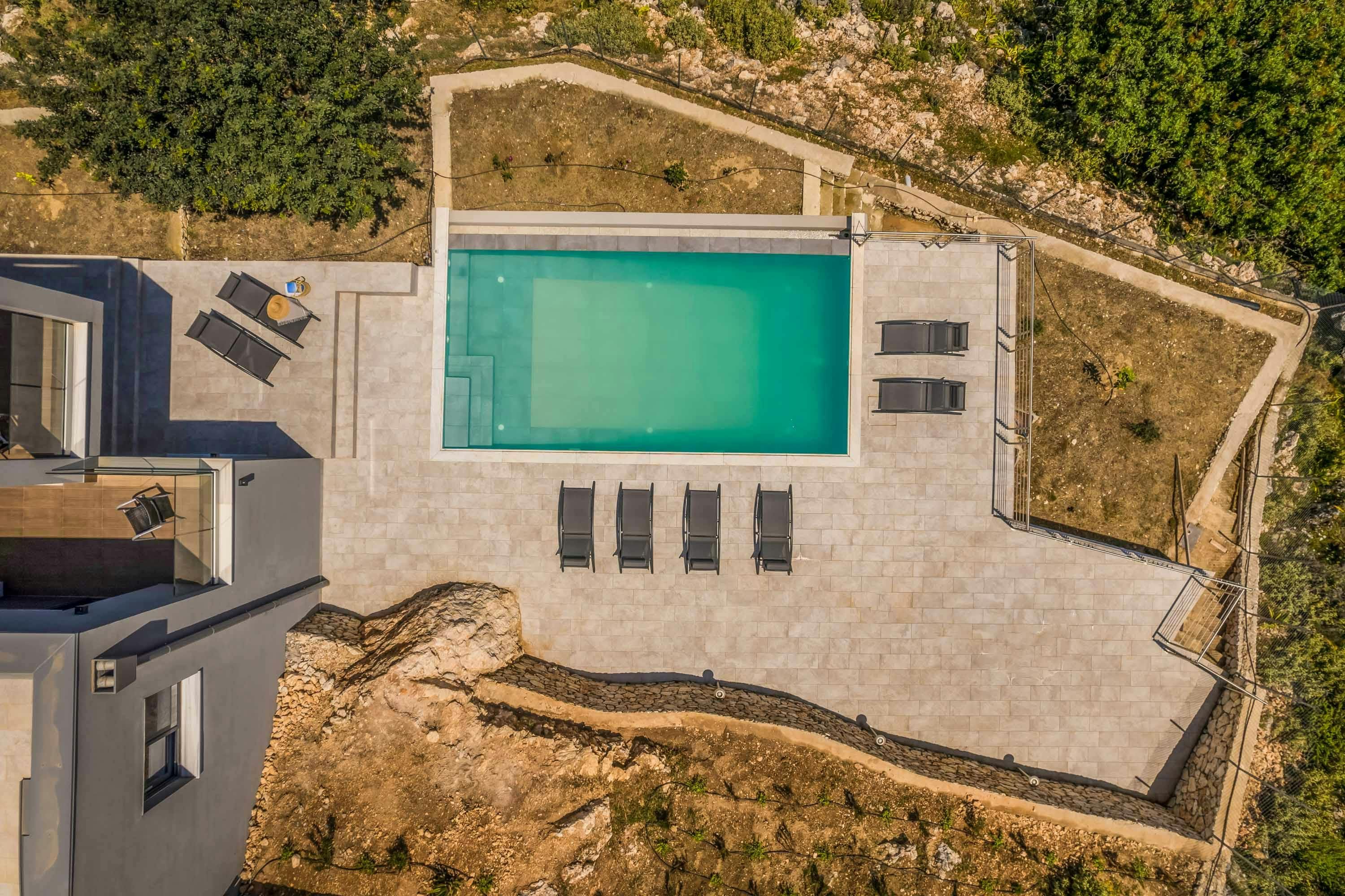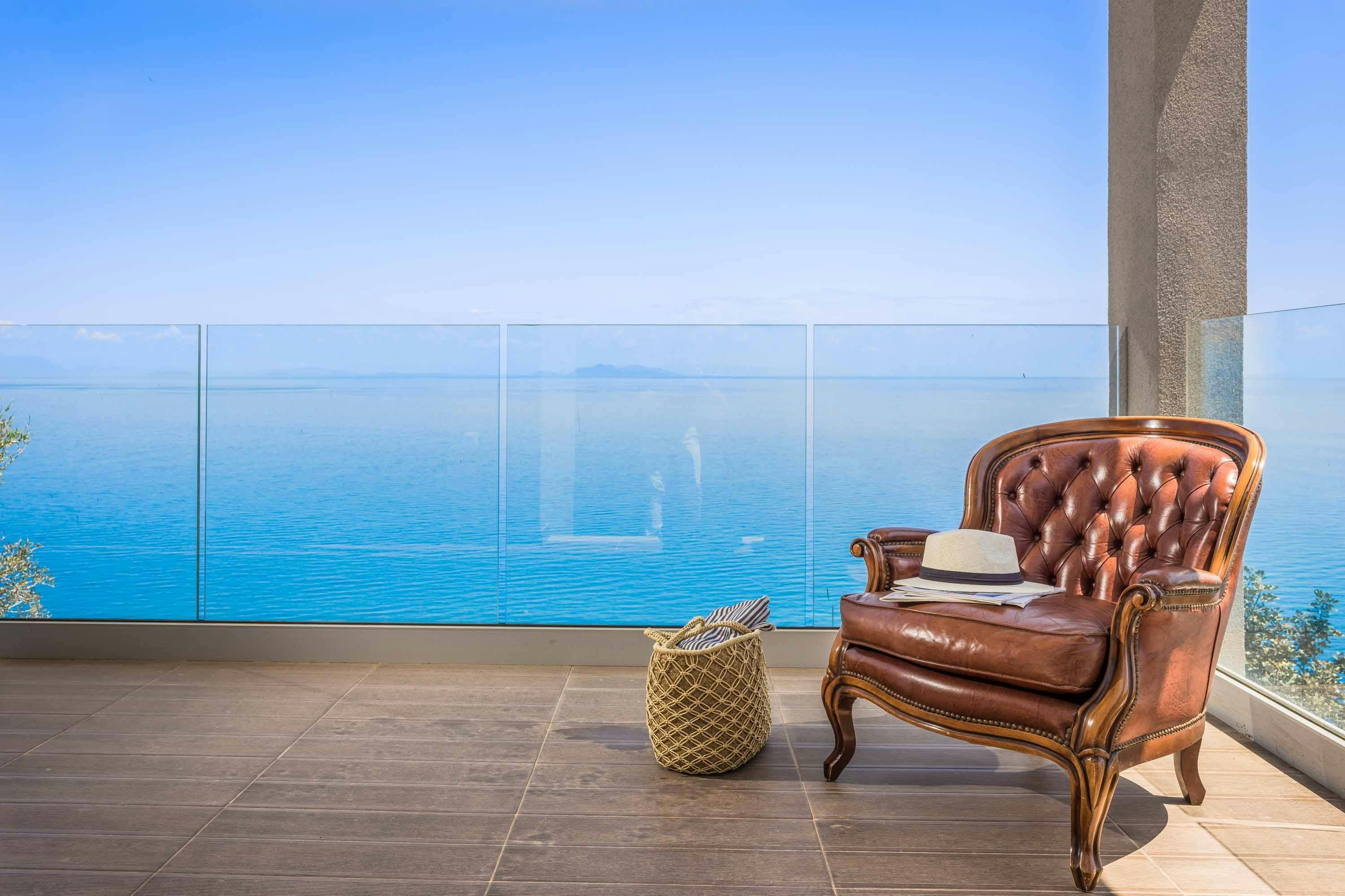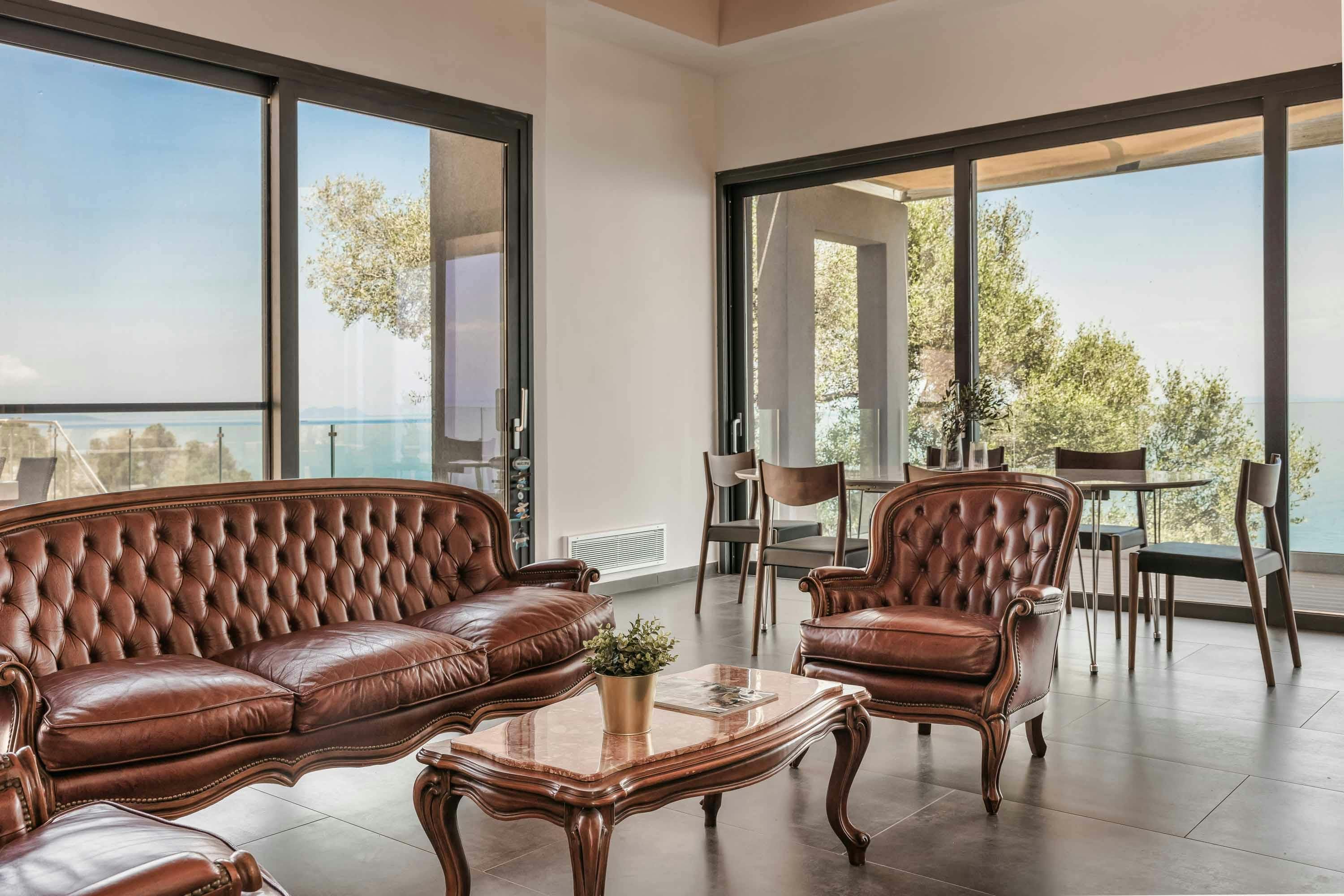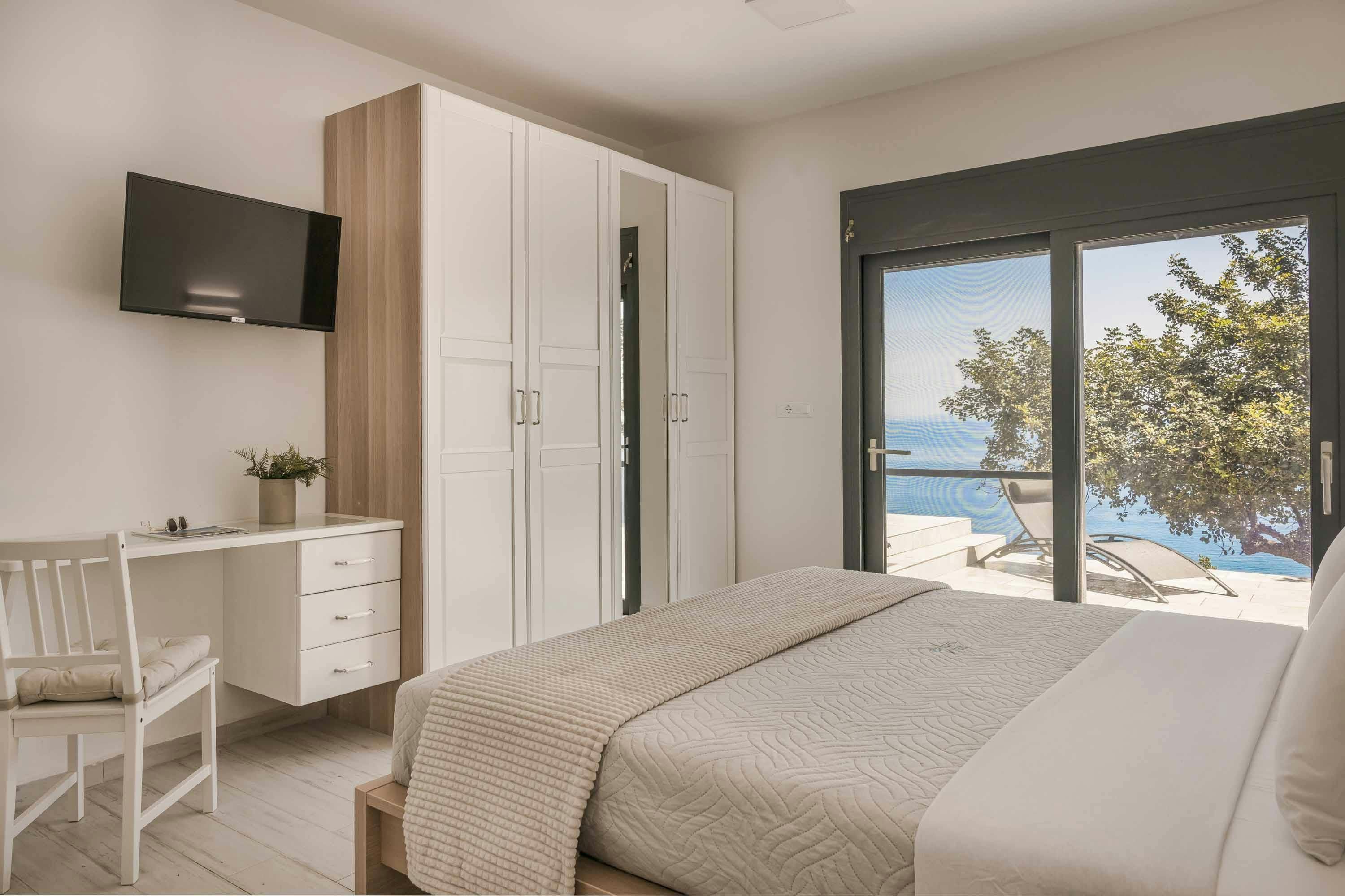 Set into the steep Skala cliffs, this villa has enviable Ionian Sea views from the multi-level terrace area and infinity pool. There’s a large brick-built barbecue for cooking alfresco lunches and dinners as well. Set over two floors, there are vistas from every room, too. And we love that every bedroom has its own terrace or balcony. Location-wise, well, you are just a short drive along the cliff tops from the main resort town of Skala, with its range of restaurants, shops, and one of the sandiest beaches on the island.