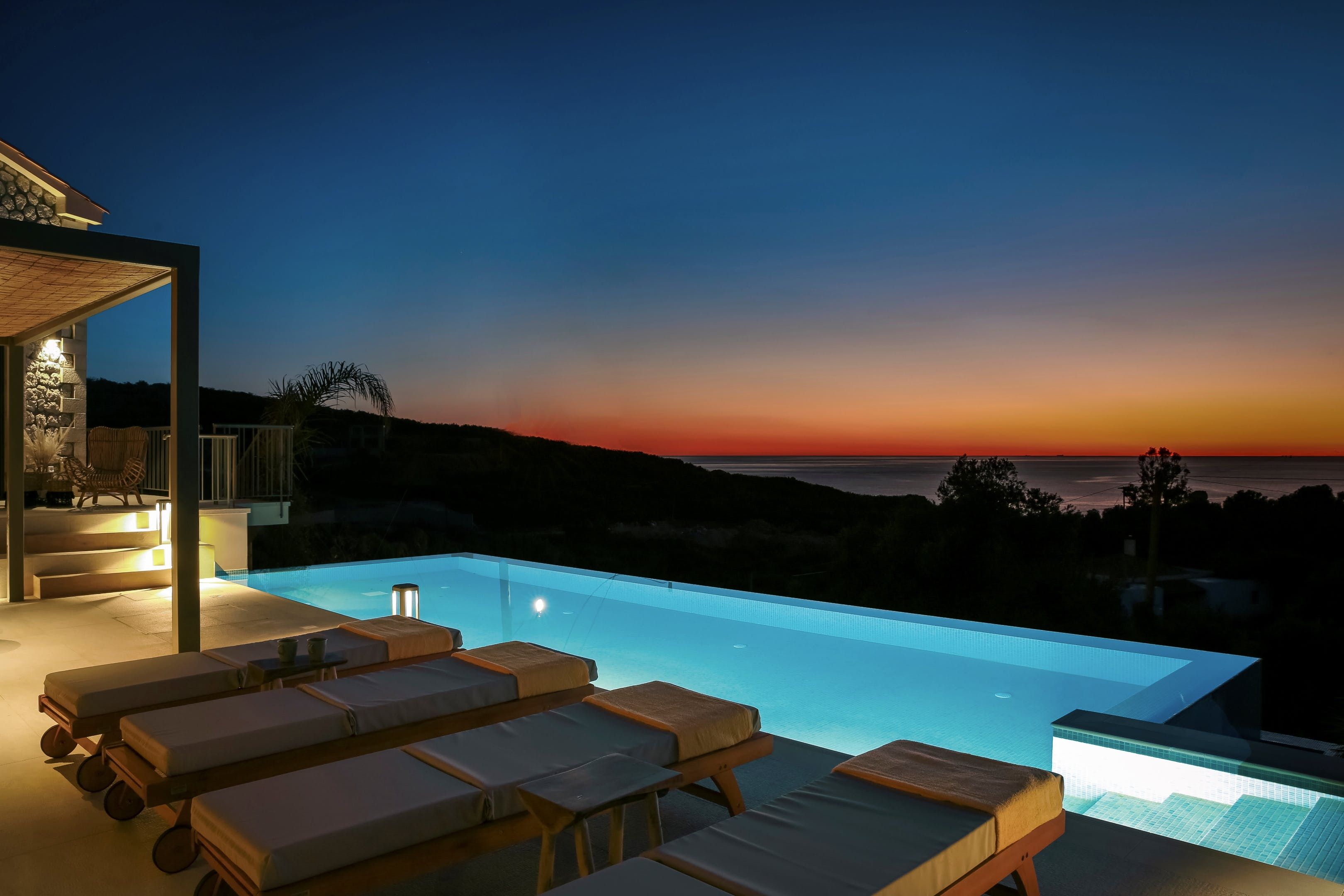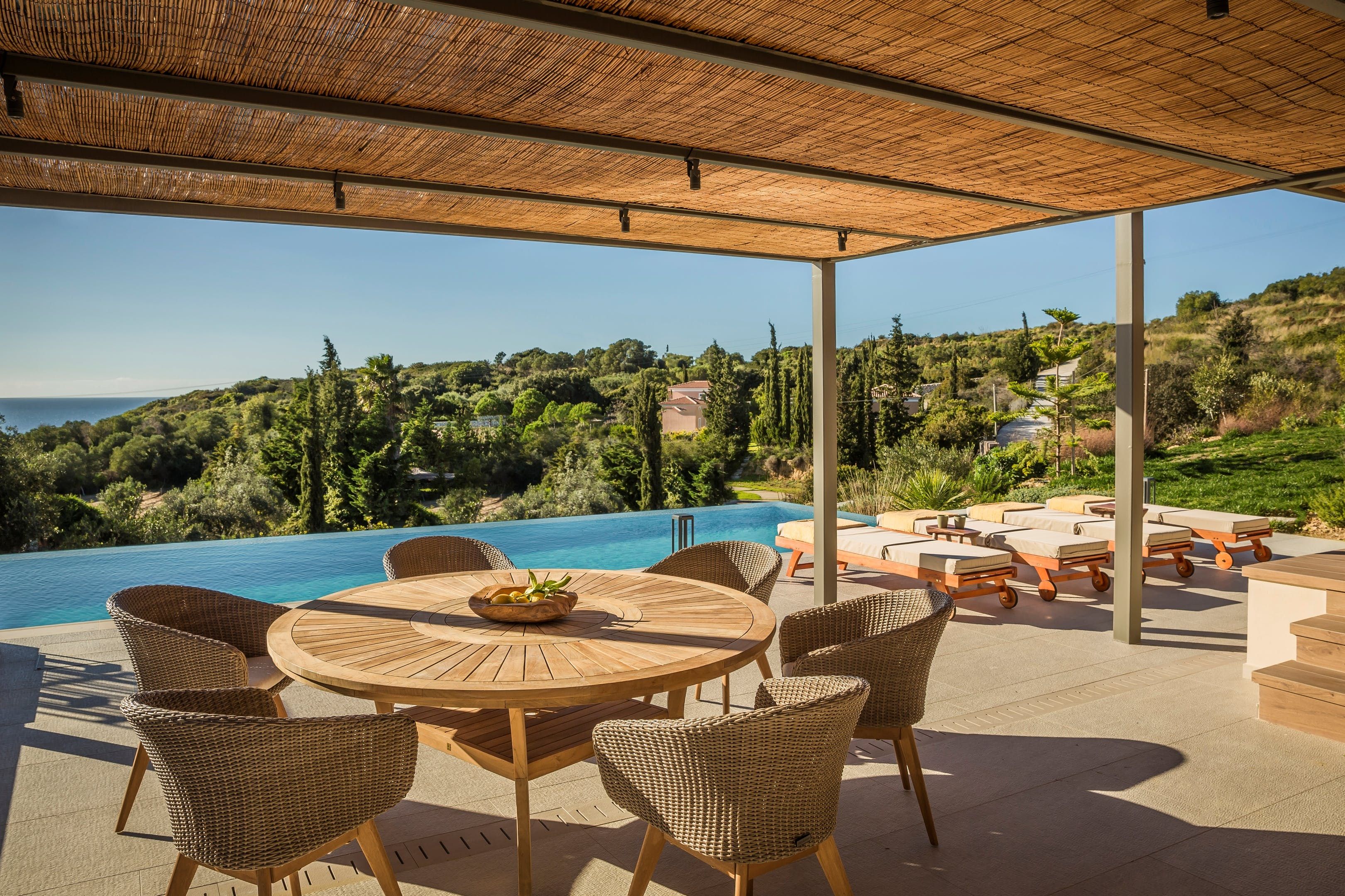 Outside, the villa’s magic really starts to show. A spacious terrace leads to the inviting infinity pool, which looks out over the lush land below and beyond to the sea. Dining under the pergola is delightful – with a breeze dancing through your hair and the views stretched out before you, it’s impossible not to relax. Another slightly raised space under a pergola boasts comfortable sofas – this is where you’ll want to watch the sun sink in the sky each evening.