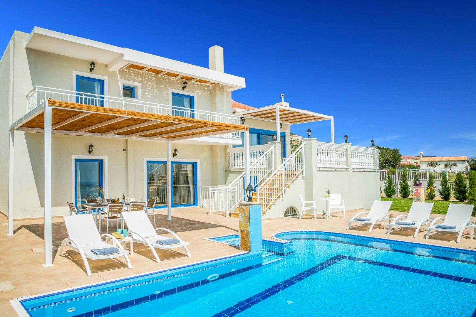 Just outside Skala and sitting above a charming fishing harbour is this traditional Kefalonian villa. There are opportunities for rockpooling and swimming off the rocky bay beneath, whilst the finer sands of Skala Beach are just 1.2km away (we suggest driving in the warmer season). The villa itself has all the mod cons you need, though some parts feel slightly dated in style. With a large terrace overlooking the Ionian, an alfresco dining area and a pool, we think you’re all set for a memorable stay on Greece’s largest Ionian island.