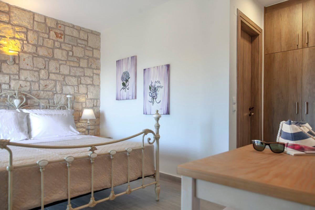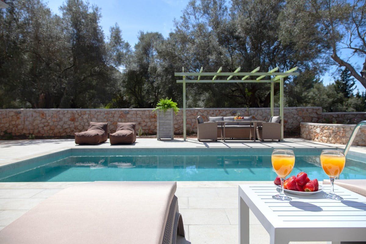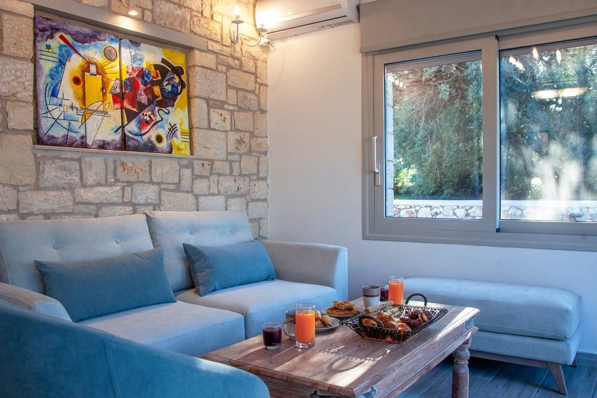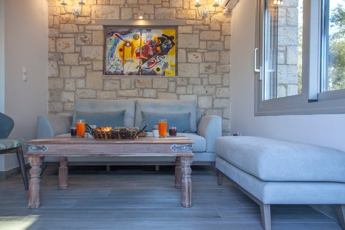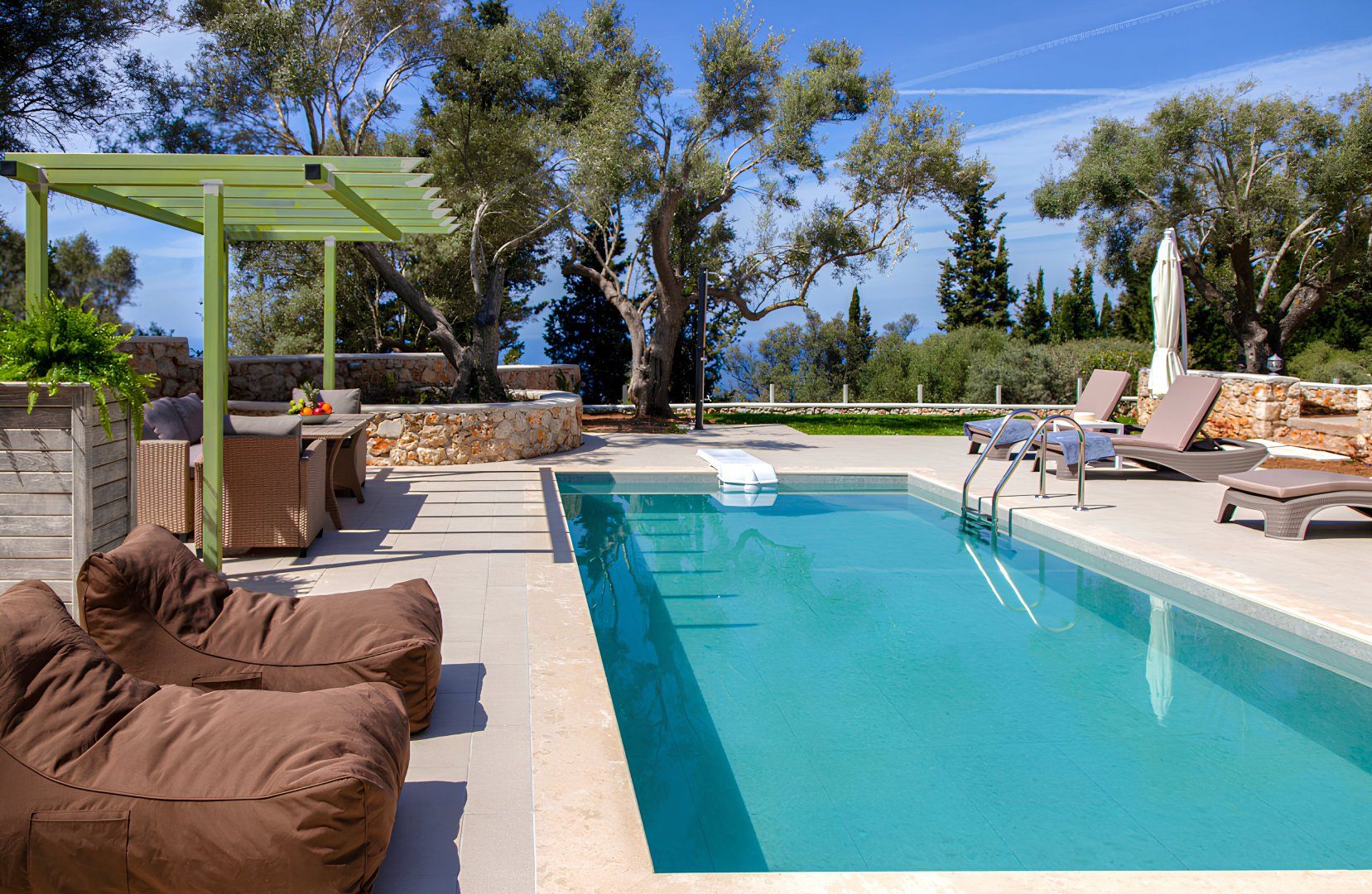 You'll find this villa only twenty minutes from Lefkada Town and seven from Pefkoulia Beach. It's a great location, close to the action but still tucked away for guests who want a bit more peace and quiet. The Ionian Sea views are pretty hard to be, too. Our favourite spot to admire them is the balcony, but the private pool also offers a glimpse of the scenery. The interior is contemporary, with stone walls and beamed ceilings to give it a bit of character. Upstairs, the snug mezzanine-level twin room is ideal for older children, but as the only two full bathrooms here are en-suites, guests in this bedroom will have to share.