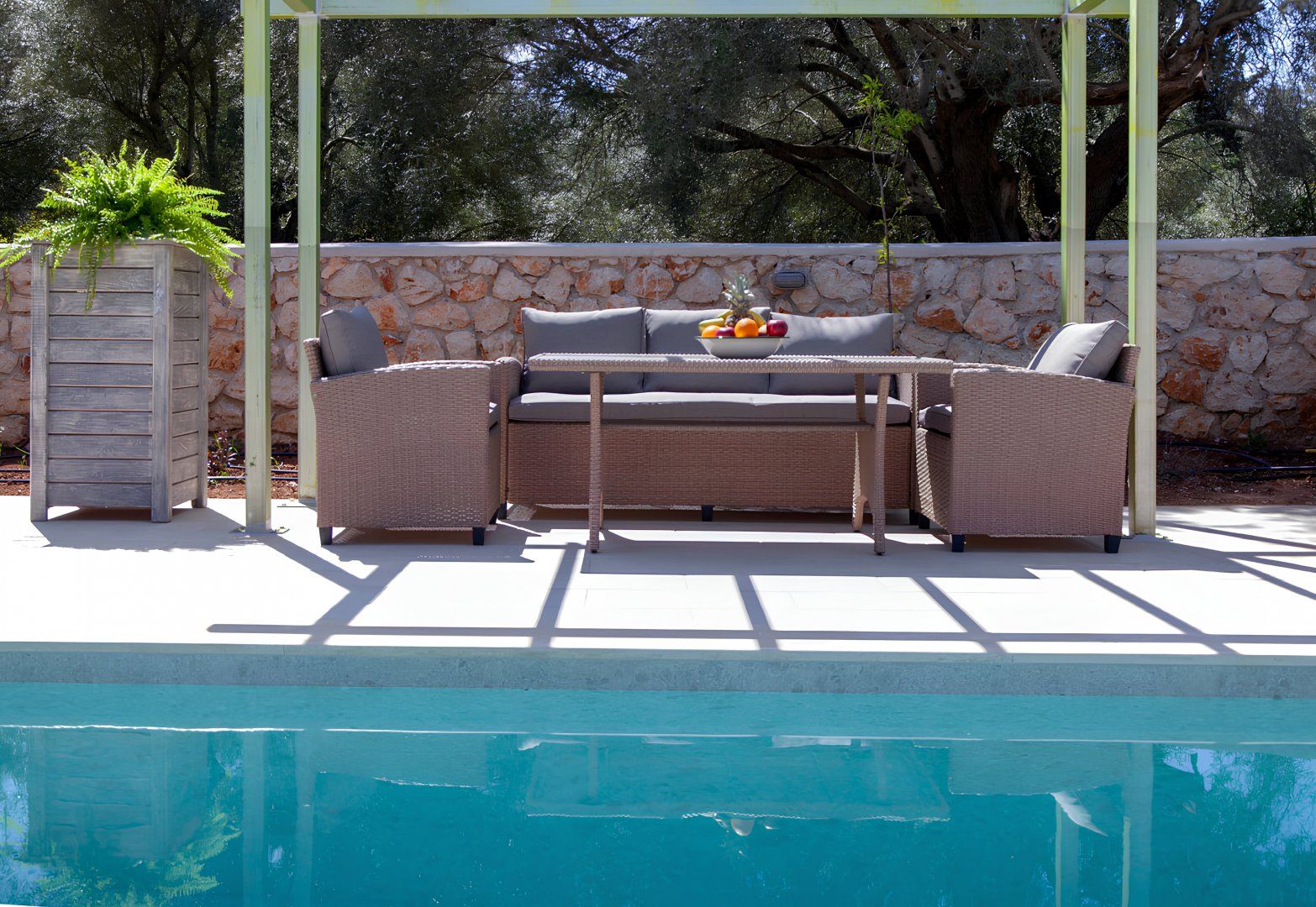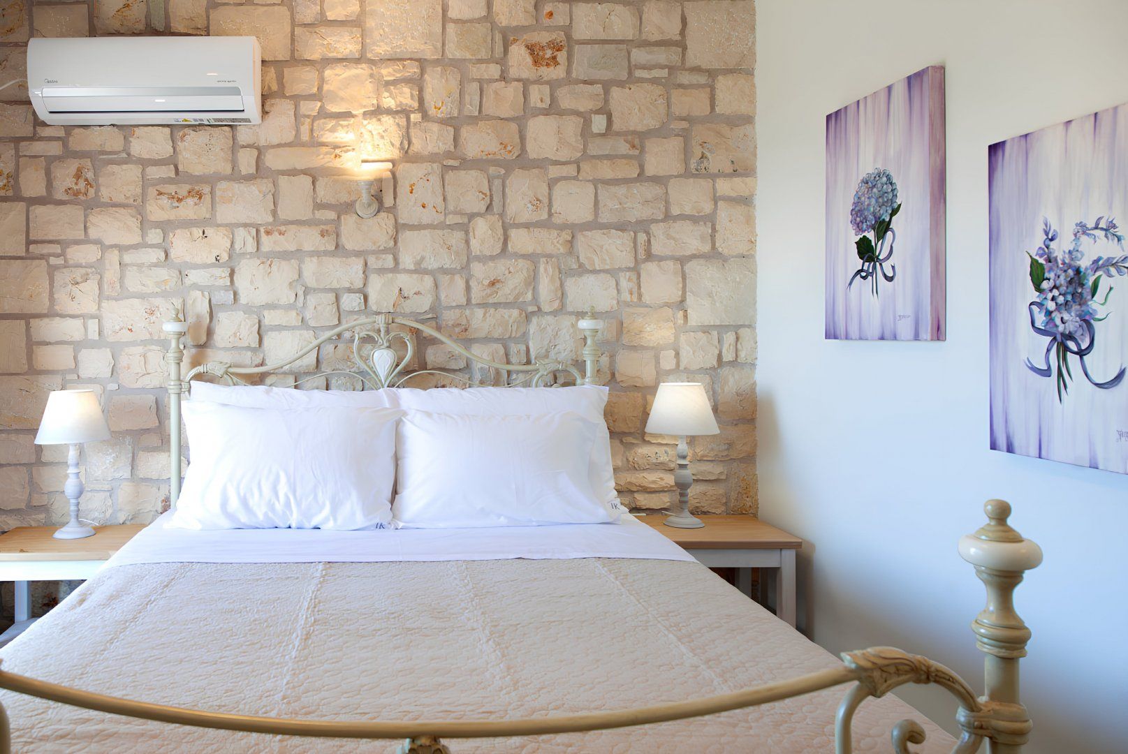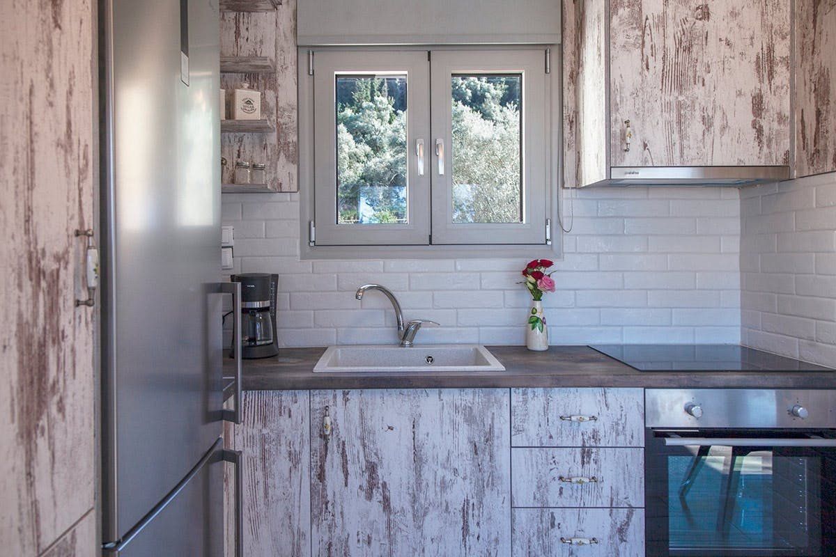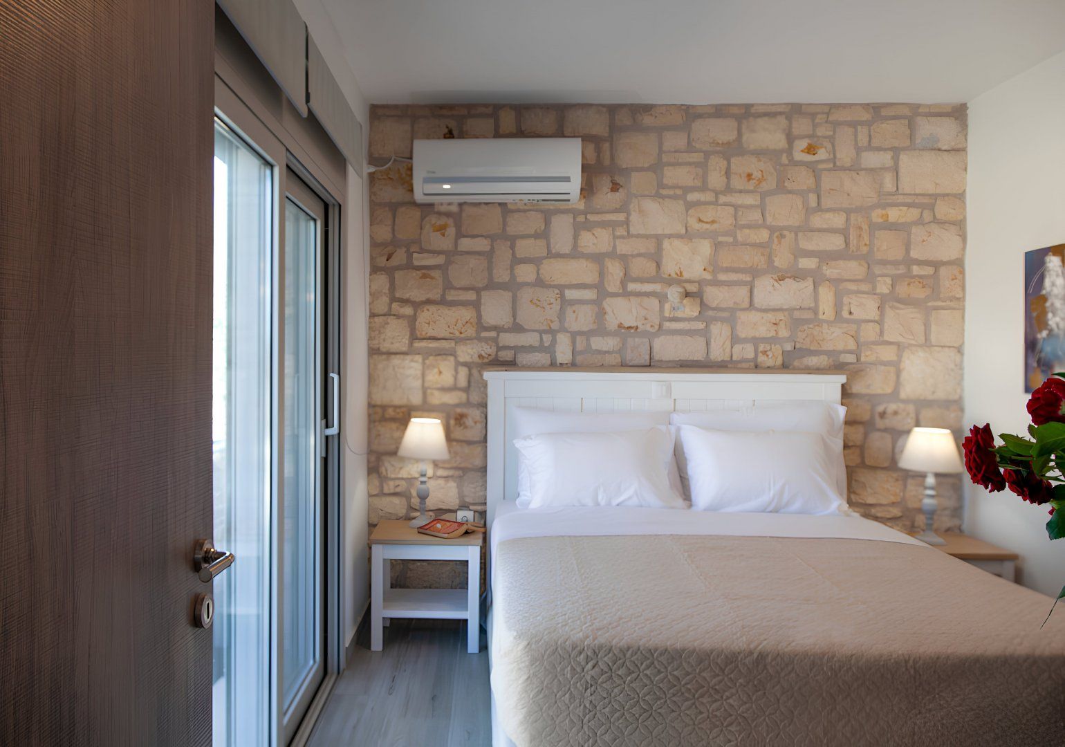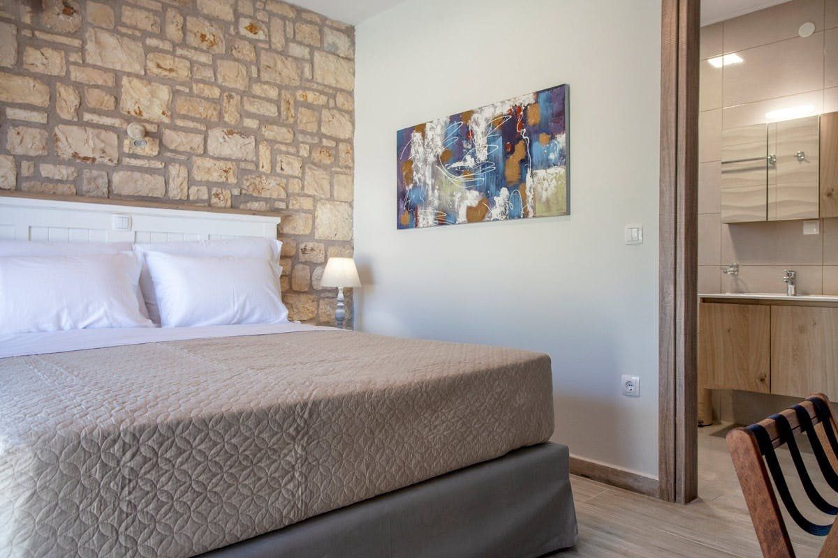 You'll find this villa only twenty minutes from Lefkada Town and seven from Pefkoulia Beach. It's a great location, close to the action but still tucked away for guests who want a bit more peace and quiet. The Ionian Sea views are pretty hard to be, too. Our favourite spot to admire them is the balcony, but the private pool also offers a glimpse of the scenery. The interior is contemporary, with stone walls and beamed ceilings to give it a bit of character. Upstairs, the snug mezzanine-level twin room is ideal for older children, but as the only two full bathrooms here are en-suites, guests in this bedroom will have to share.