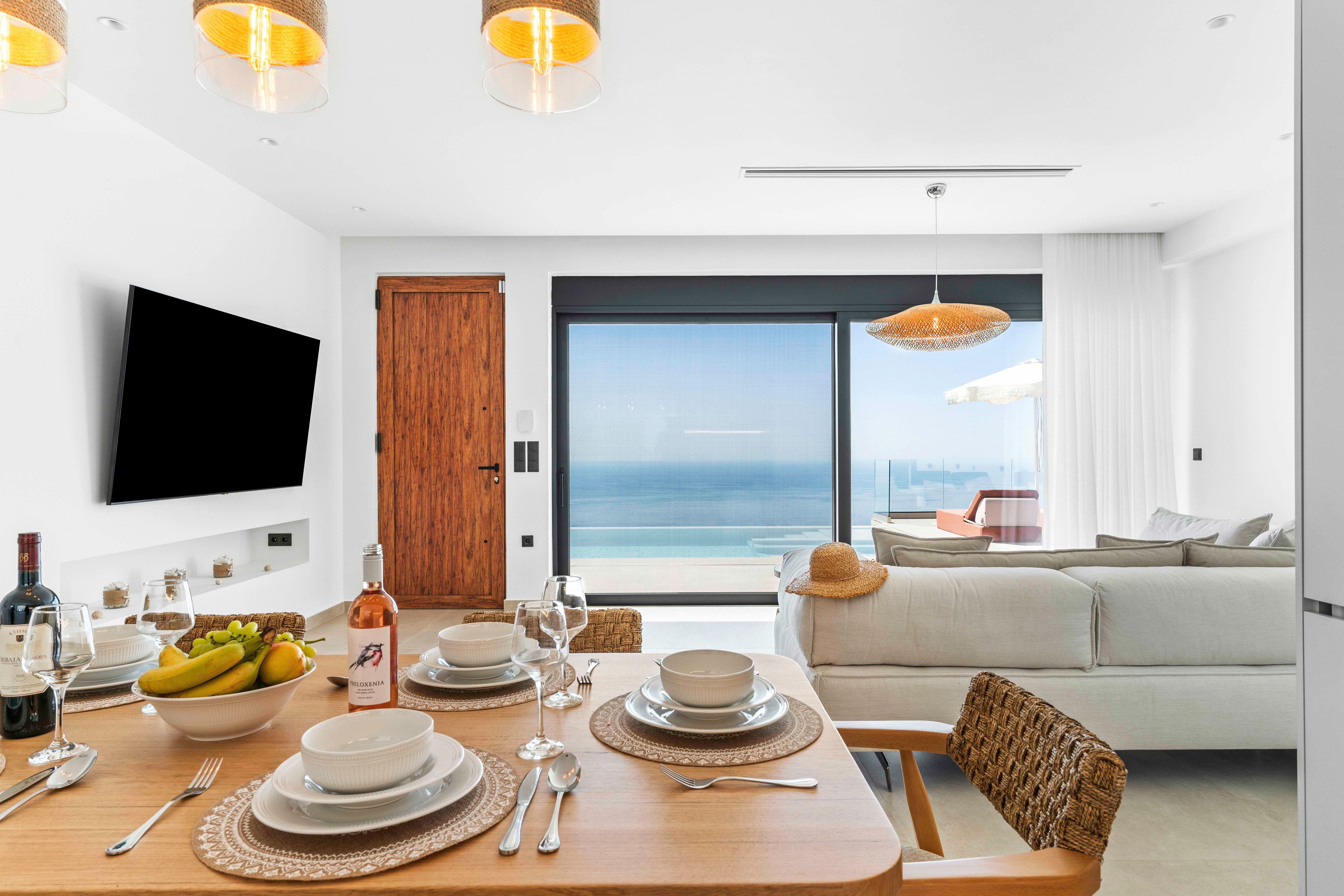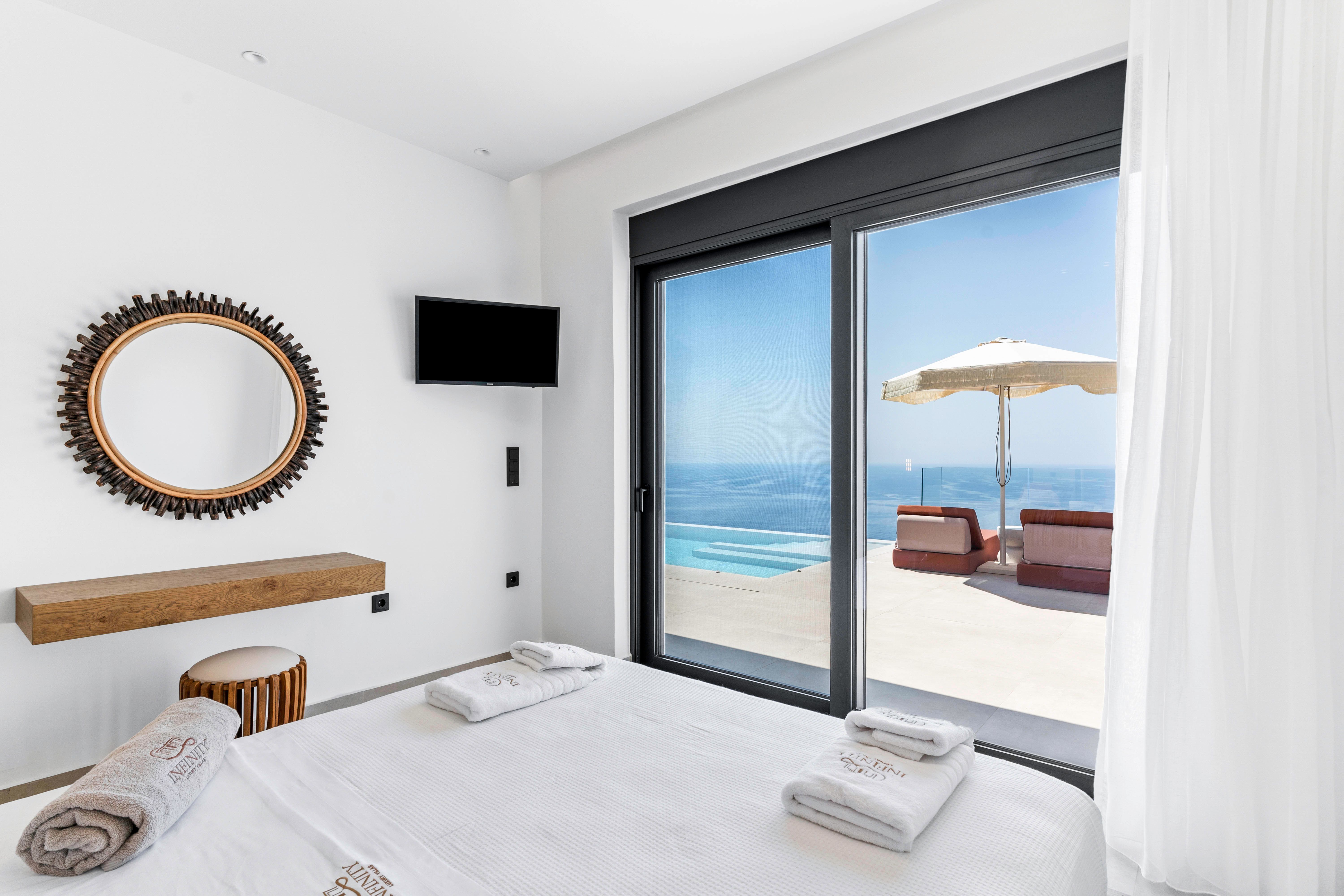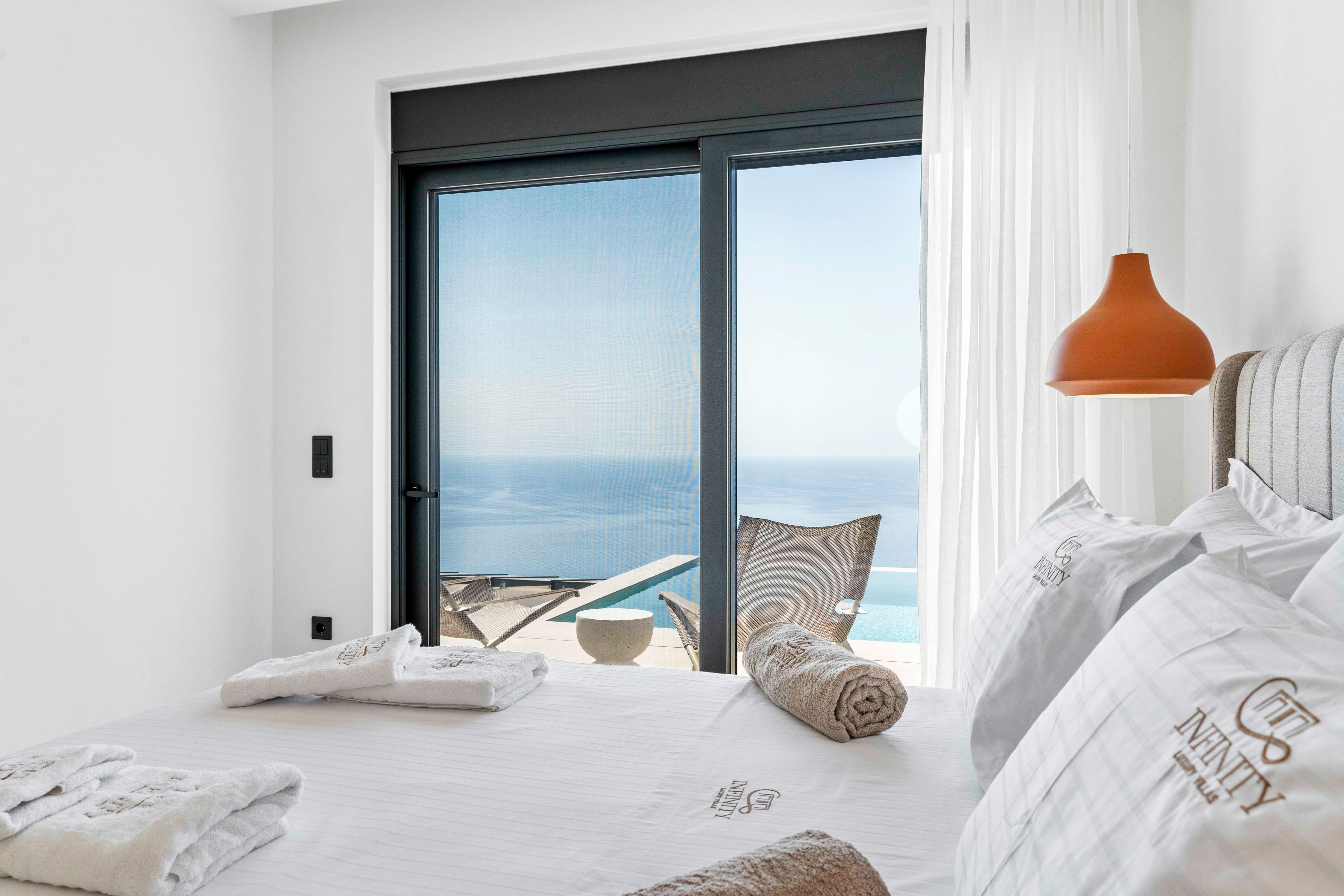 Whether you’re lounging in the living room or by the infinity pool, this villa’s views of the Ionian Sea are pretty spectacular. Outside, you can relax on sunbeds, chill in the built-in seating area, or cook and dine at the terrace, all while soaking in the scenery. Inside, the open-plan living space is compact but practical, with a sofa bed that can accommodate an extra guest for an extra fee. Local restaurants are a short drive away, we would recommend hiring a car to explore this area and the nearby village of Athani, as well as the renowned beaches of Porto Katsiki, Egremni, and Gialos.