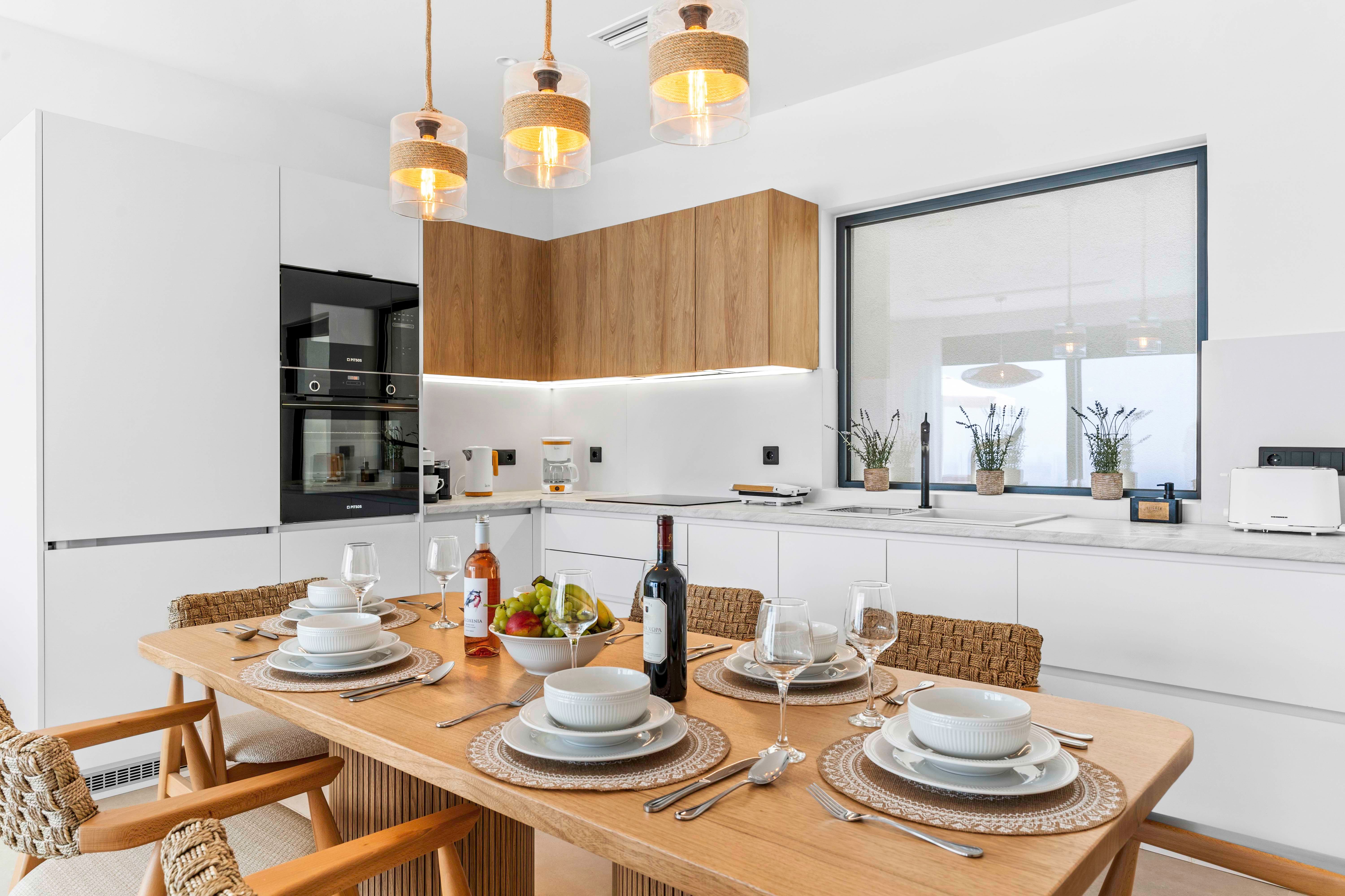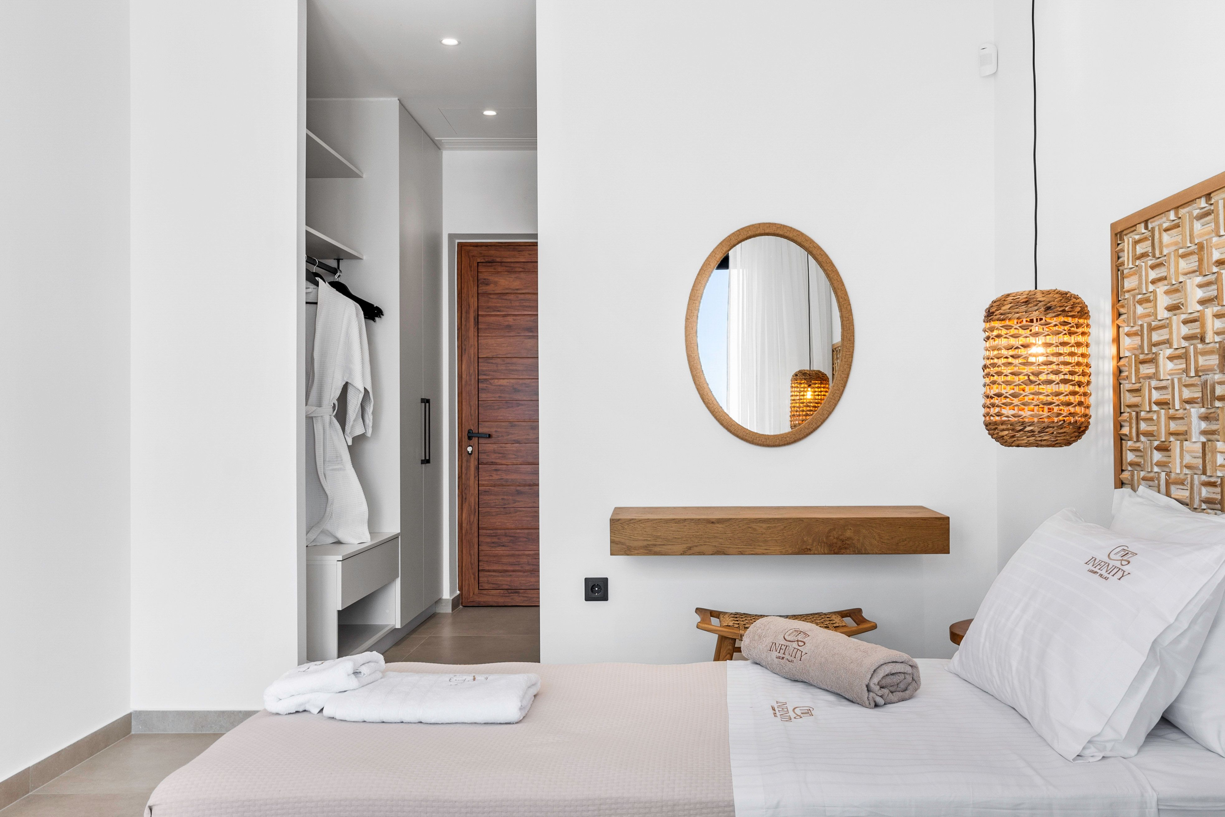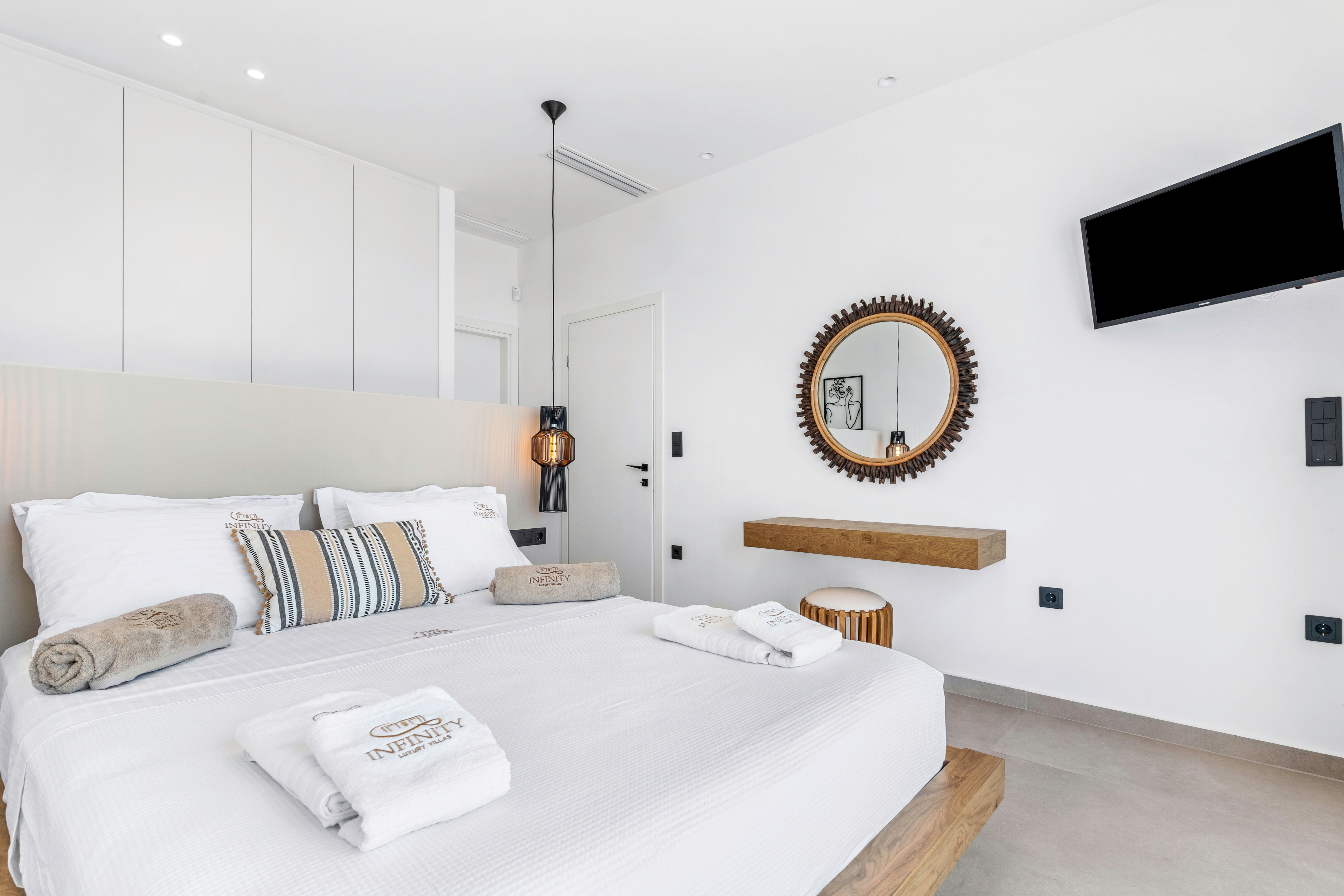 Whether you’re lounging in the living room or by the infinity pool, this villa’s views of the Ionian Sea are pretty spectacular. Outside, you can relax on sunbeds, chill in the built-in seating area, or cook and dine at the terrace, all while soaking in the scenery. Inside, the open-plan living space is compact but practical, with a sofa bed that can accommodate an extra guest for an extra fee. Local restaurants are a short drive away, we would recommend hiring a car to explore this area and the nearby village of Athani, as well as the renowned beaches of Porto Katsiki, Egremni, and Gialos.