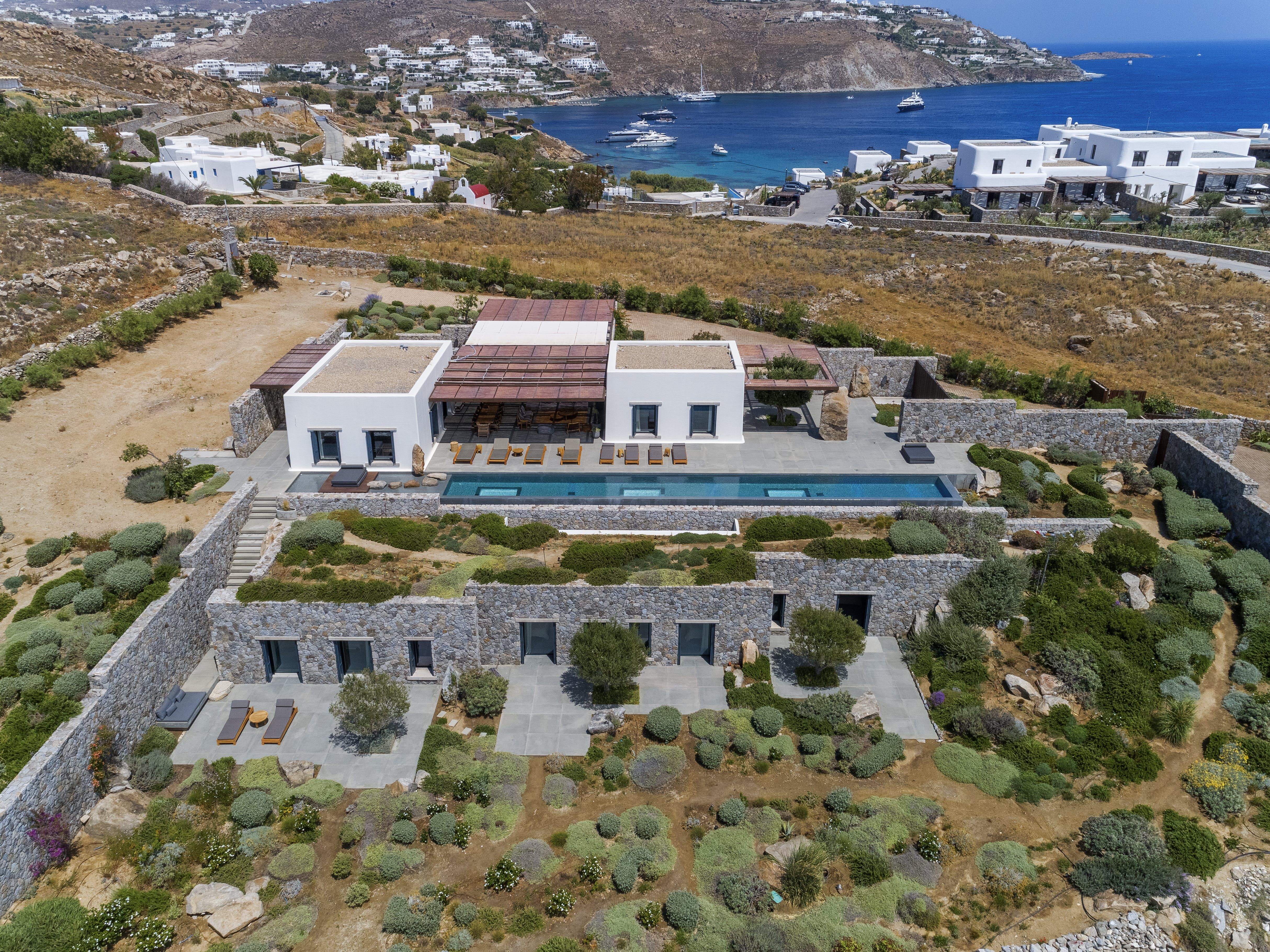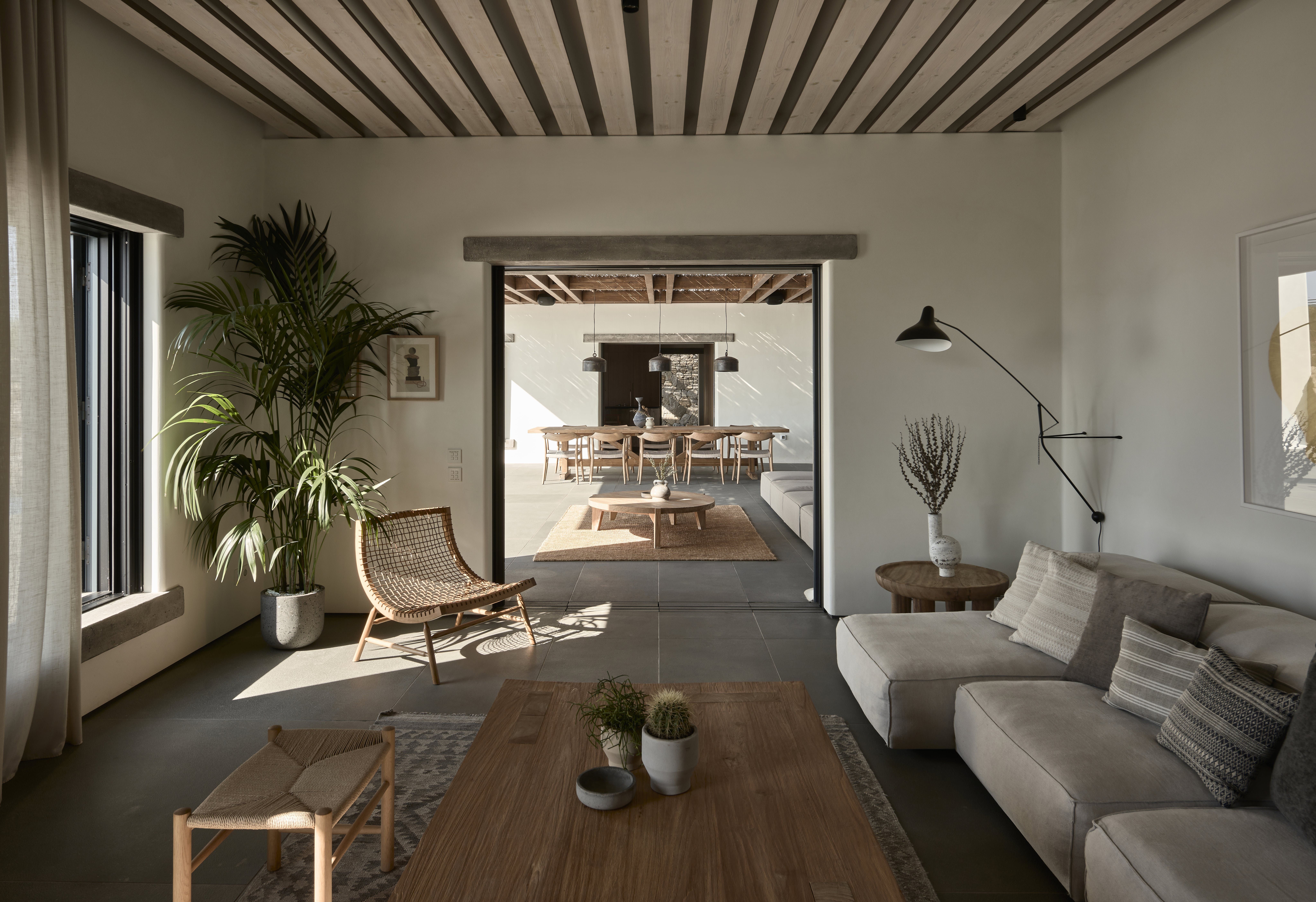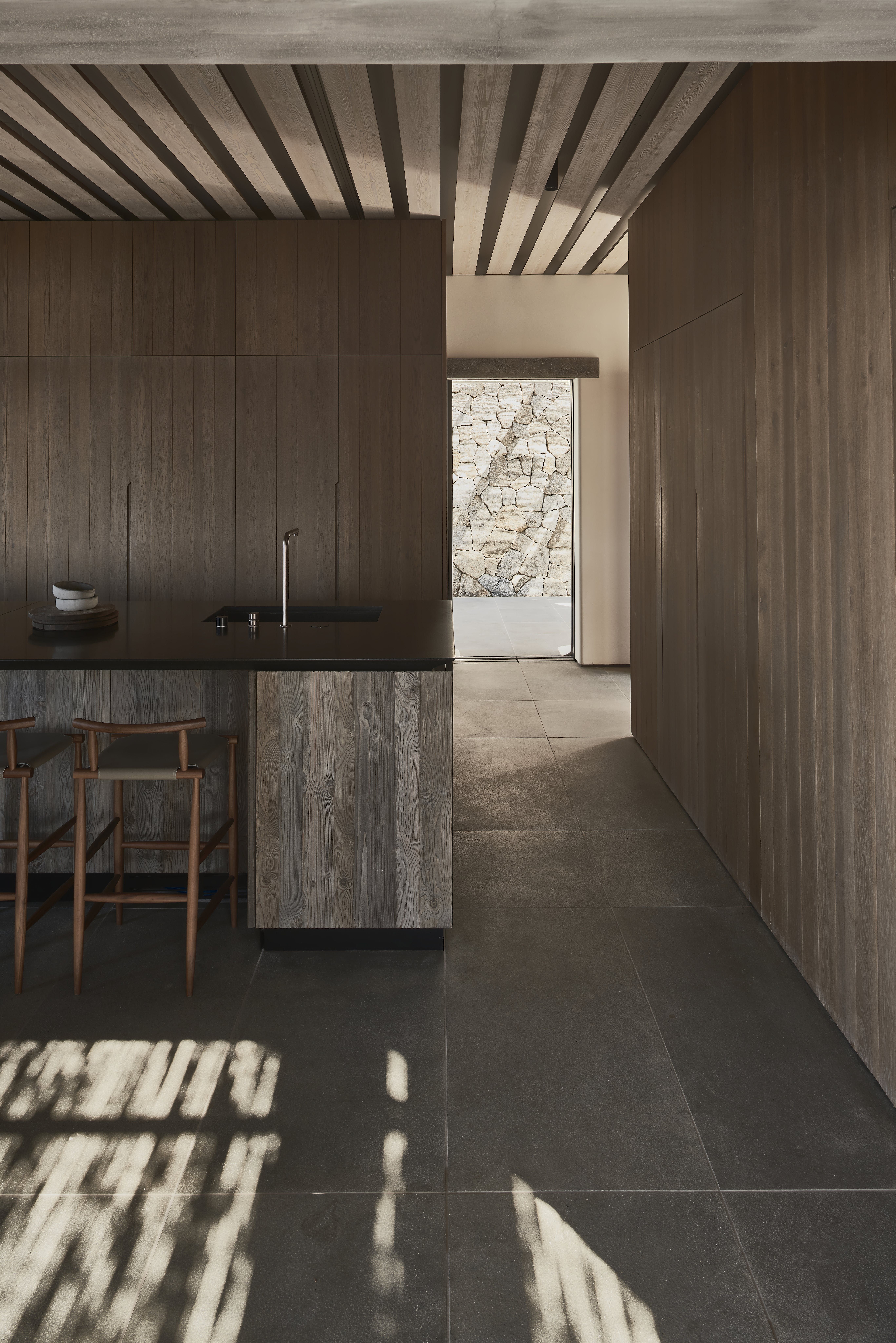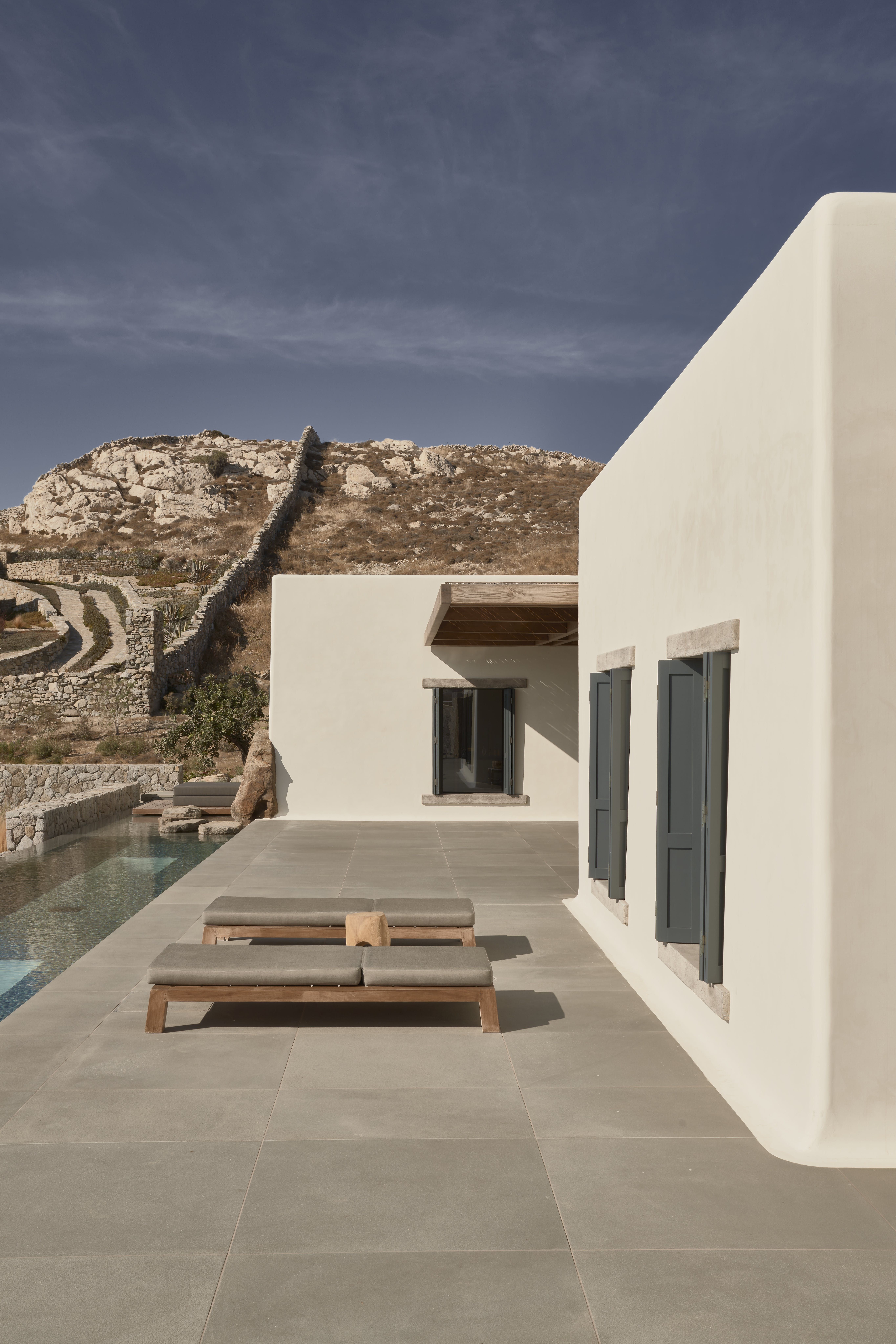 Almost entirely hidden from view, this home has an exclusive setting. Sitting behind hand-built stone walls dug from the site – there's a traditional island vernacular palette of materials such as lime-wash, stone, and wood.