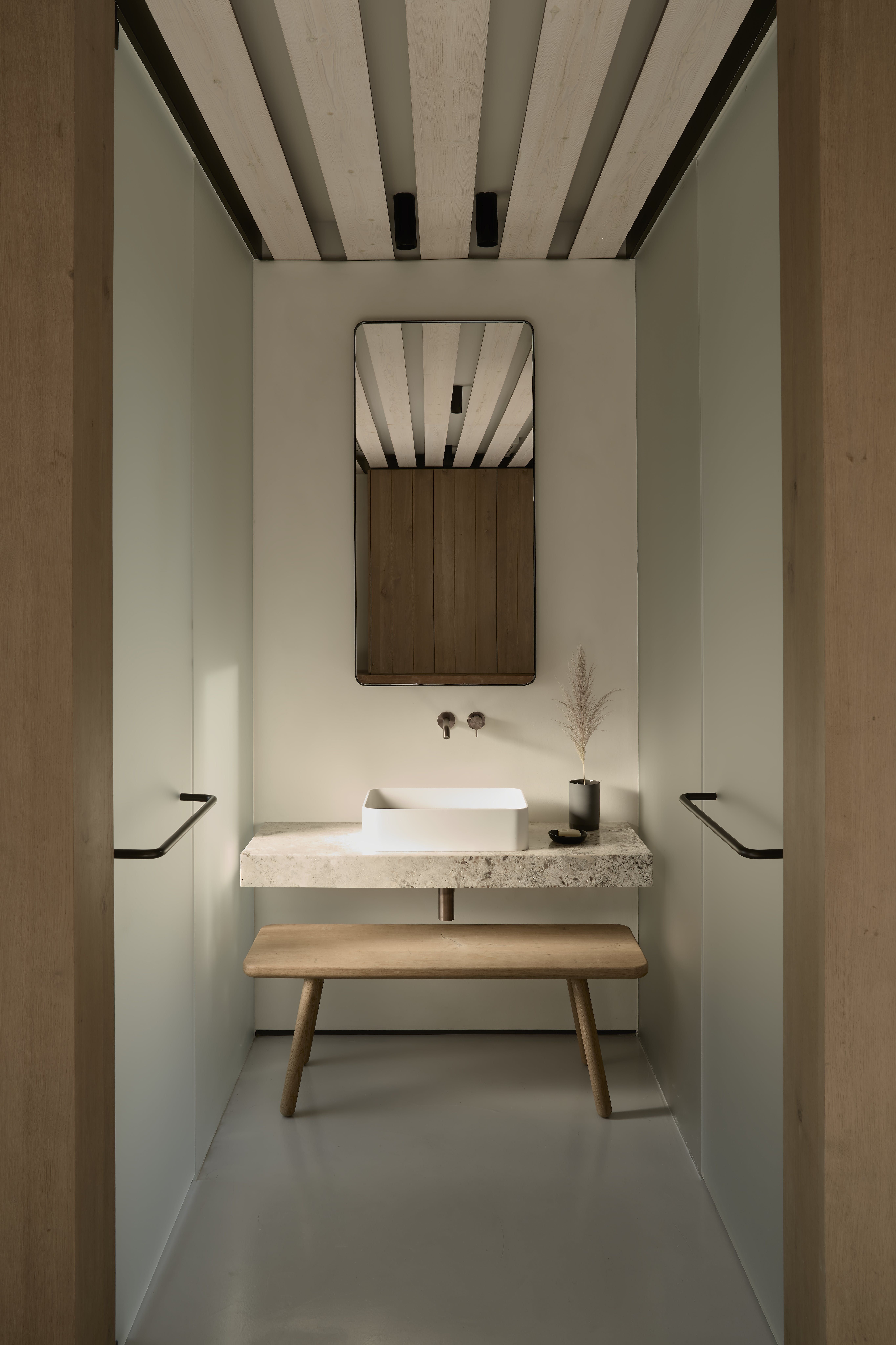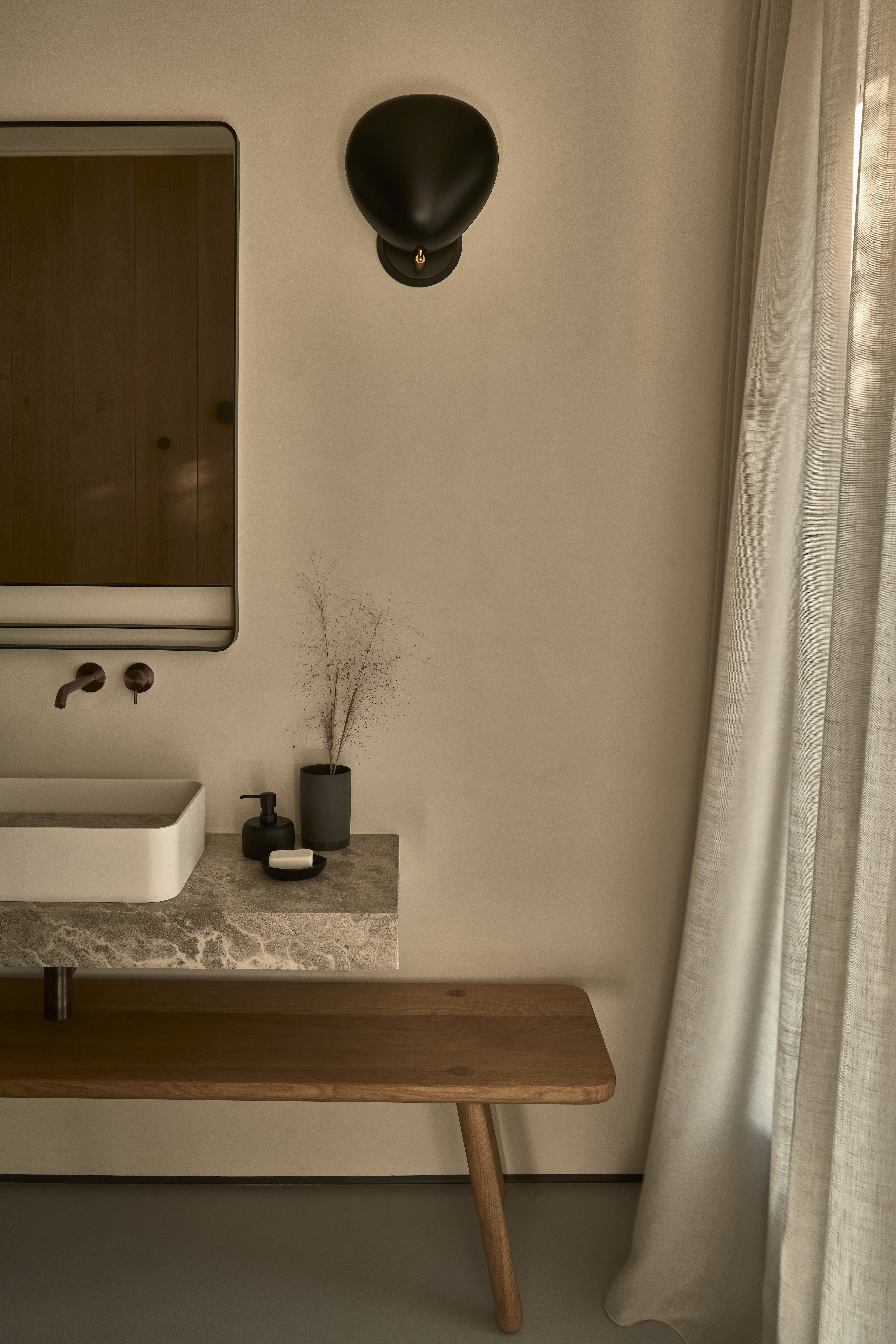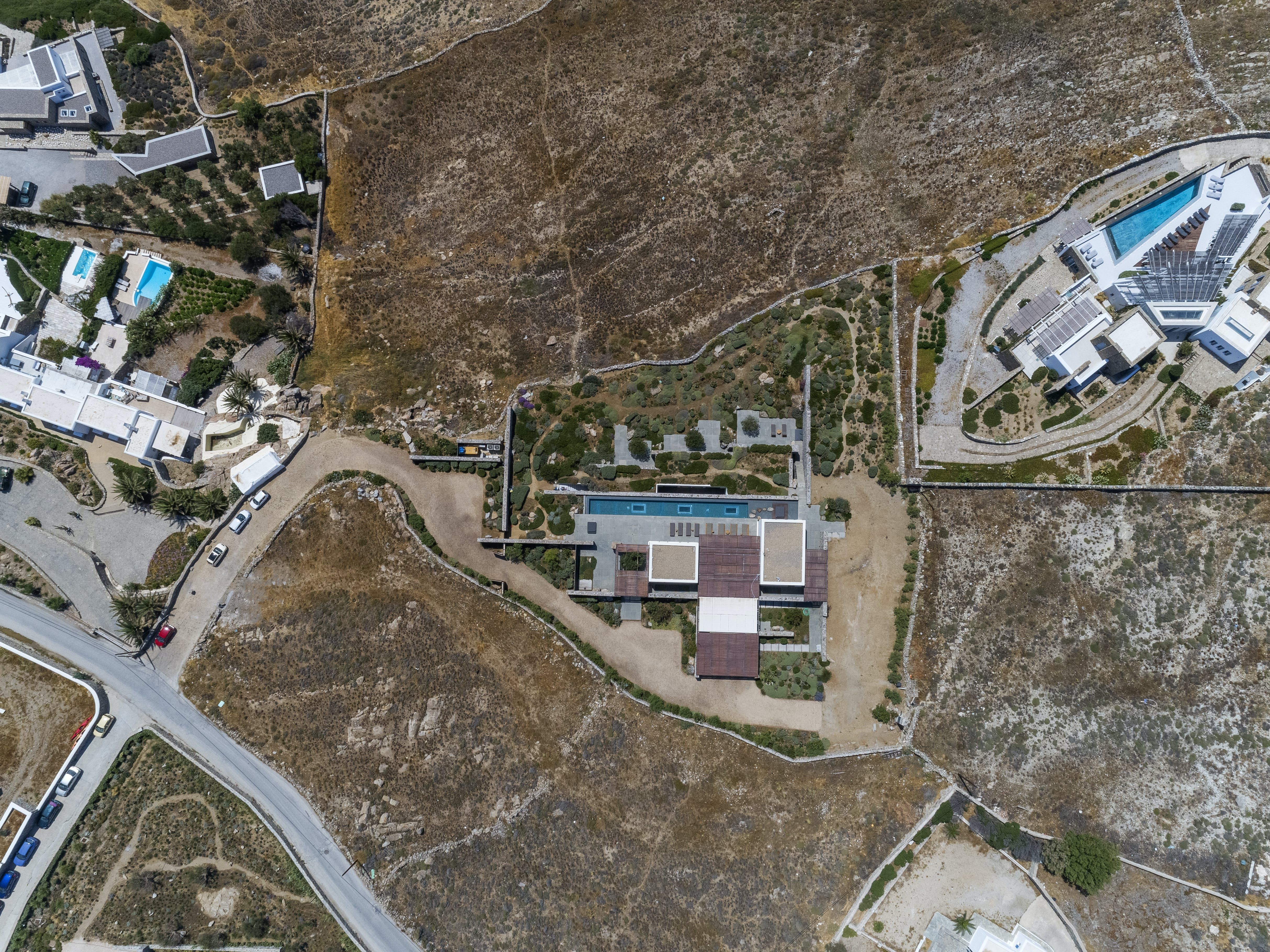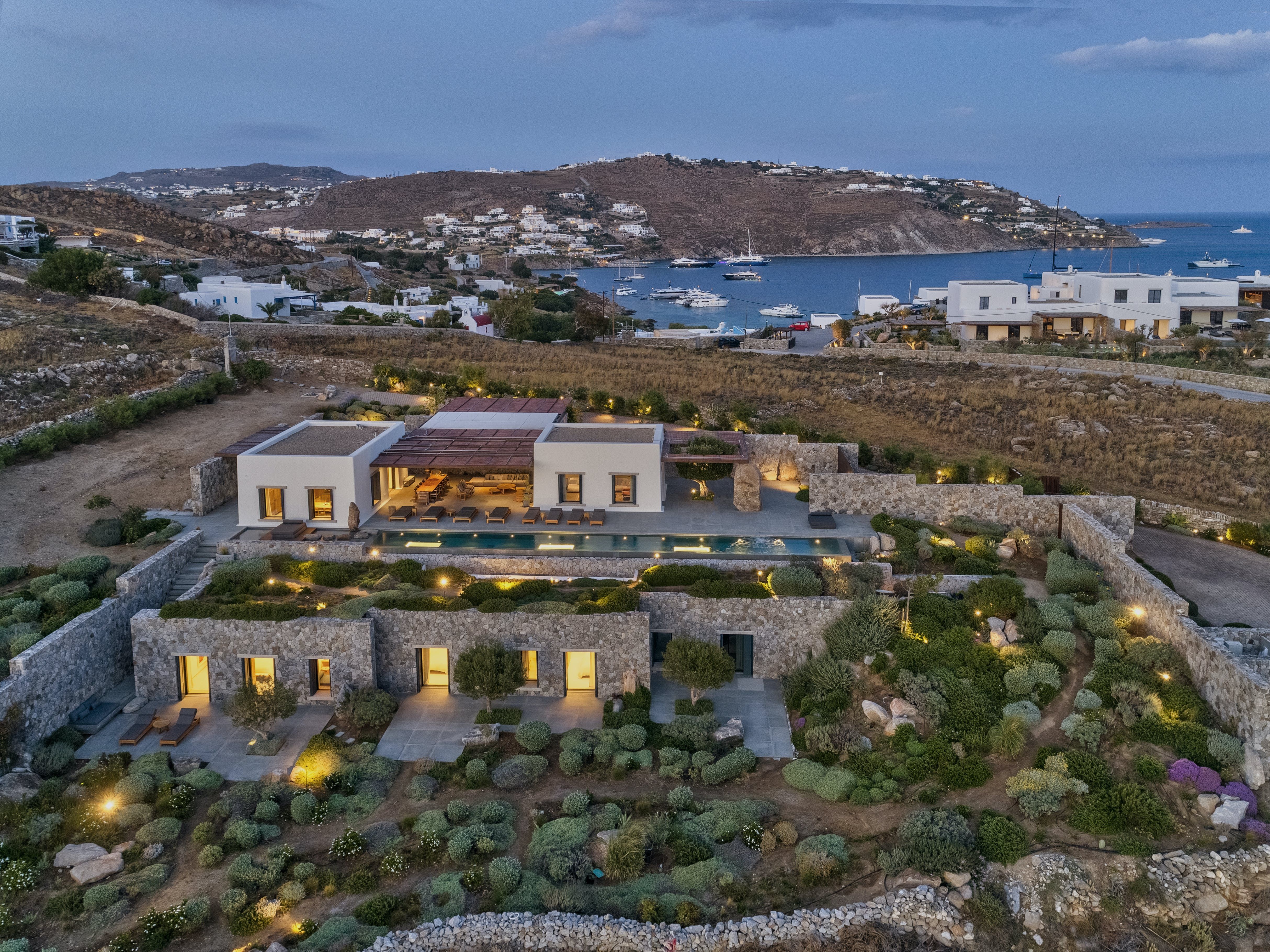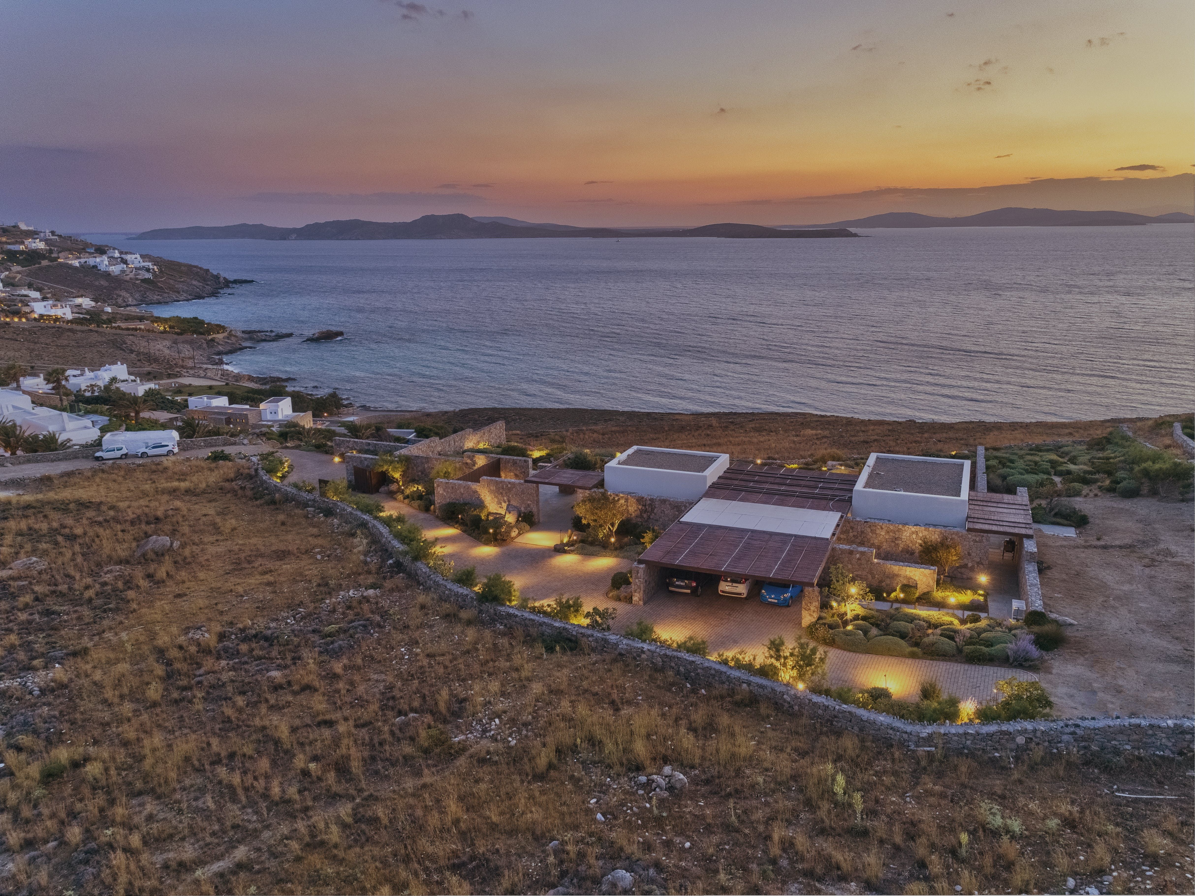 Almost entirely hidden from view, this home has an exclusive setting. Sitting behind hand-built stone walls dug from the site – there's a traditional island vernacular palette of materials such as lime-wash, stone, and wood.