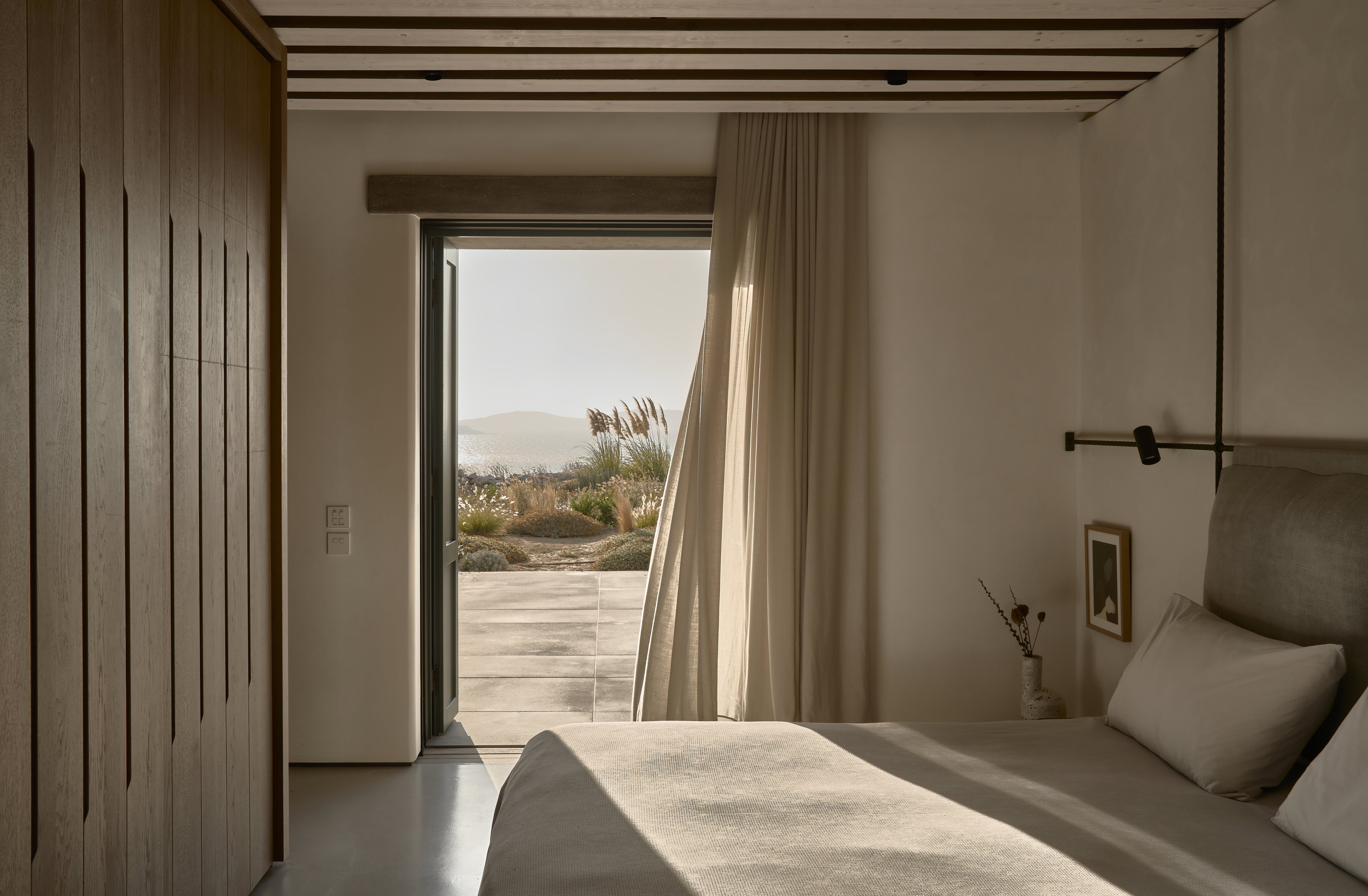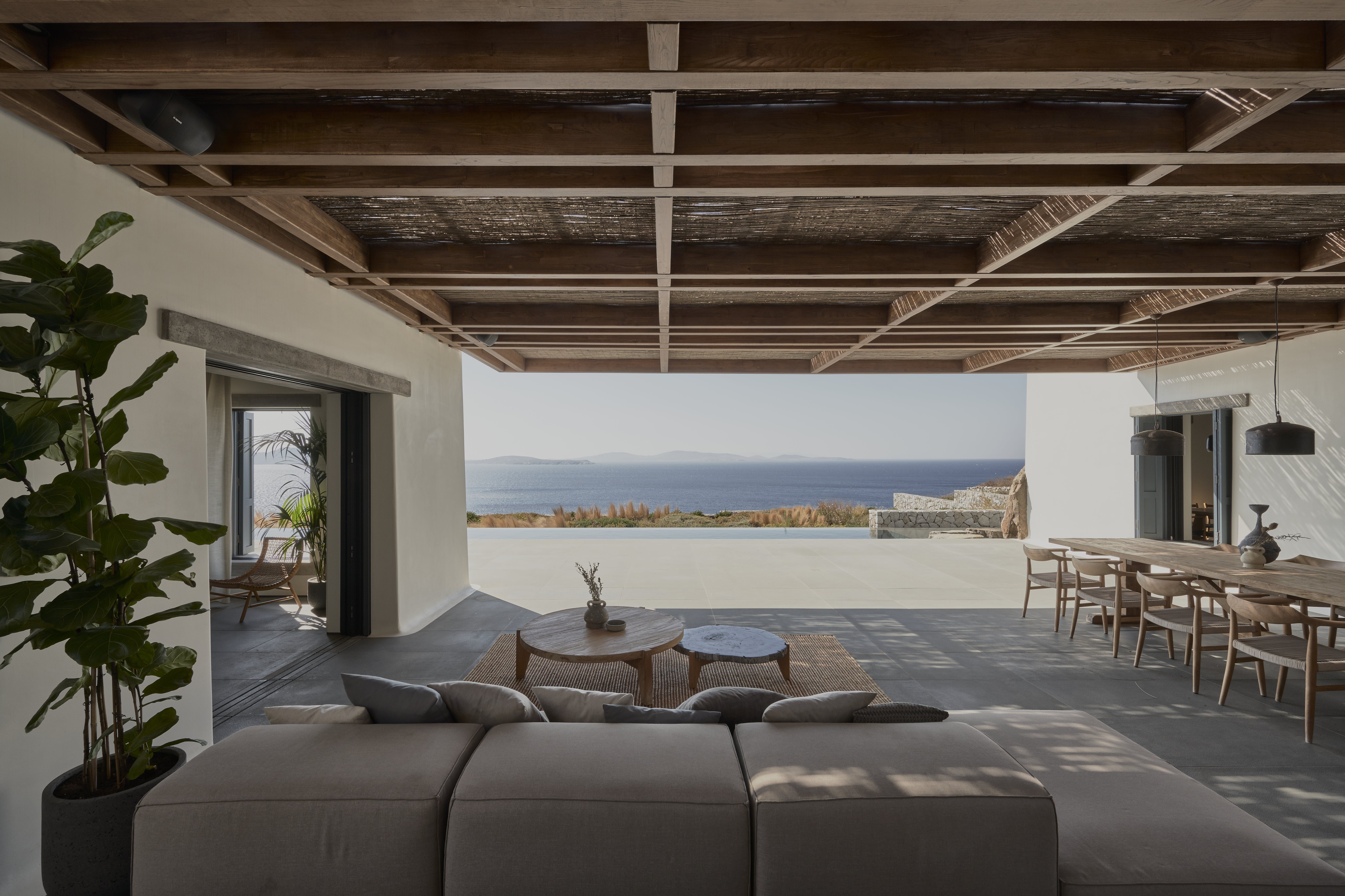 This home has been designed for laid-back summer living – lounge by the infinity pool or enjoy some cocktails in one of the many stylish seating areas. Neolithic-like standing stones support chestnut-wood pergolas casting beautiful shadows and giving shelter from the hot Mykonos sun. The rough-hewn boulders are a recurring feature, anchoring this home in the landscape – you'll find them scattered inside this villa and around the pool. We particularly love the ones that form stepping stones through the shallow water to the main outdoor living area.