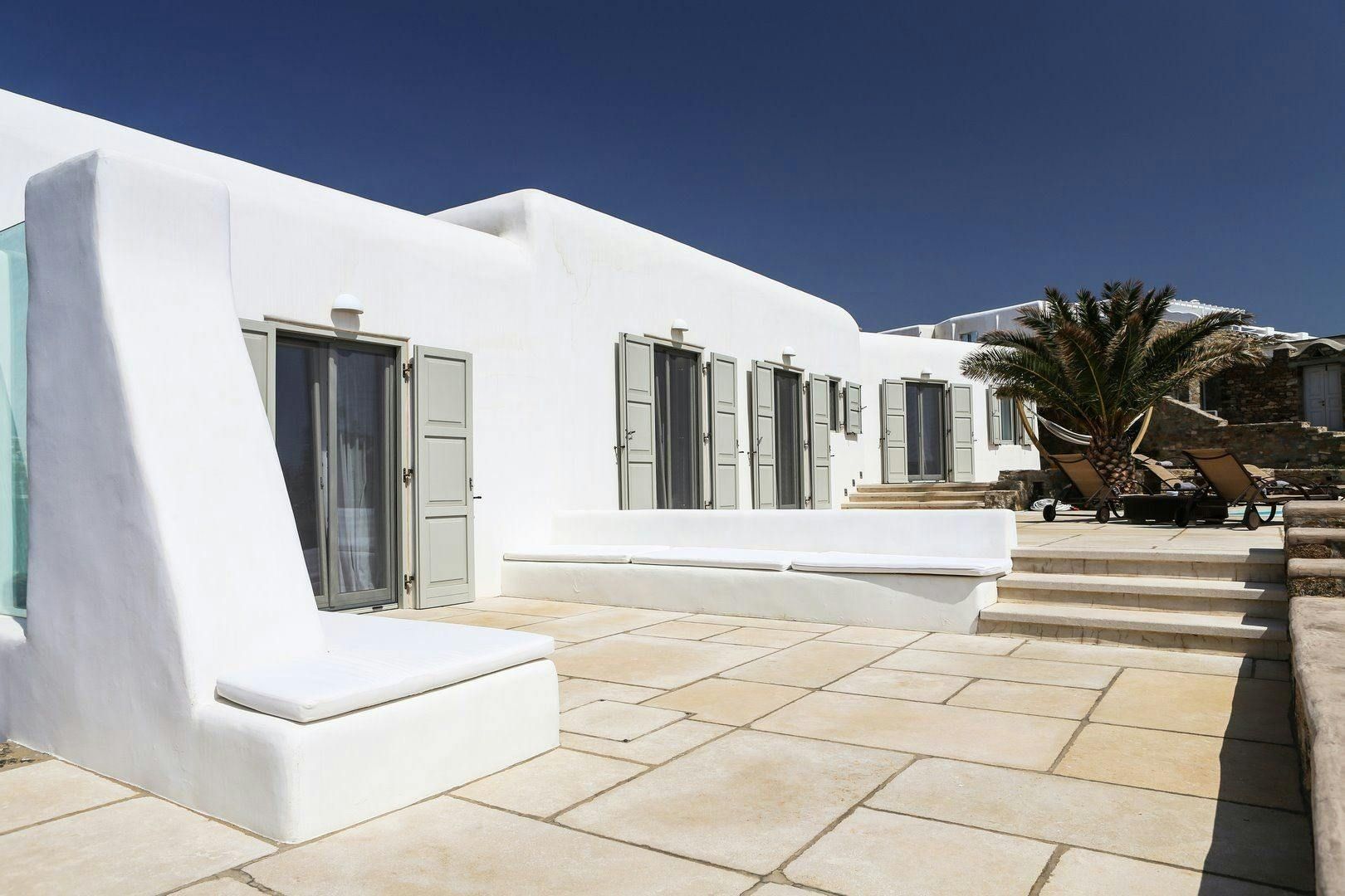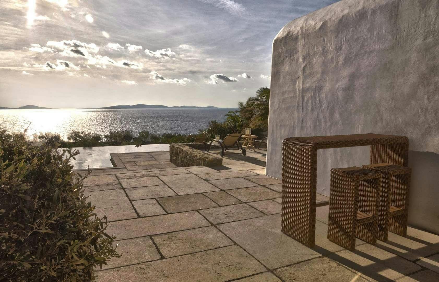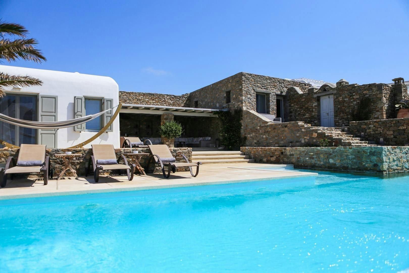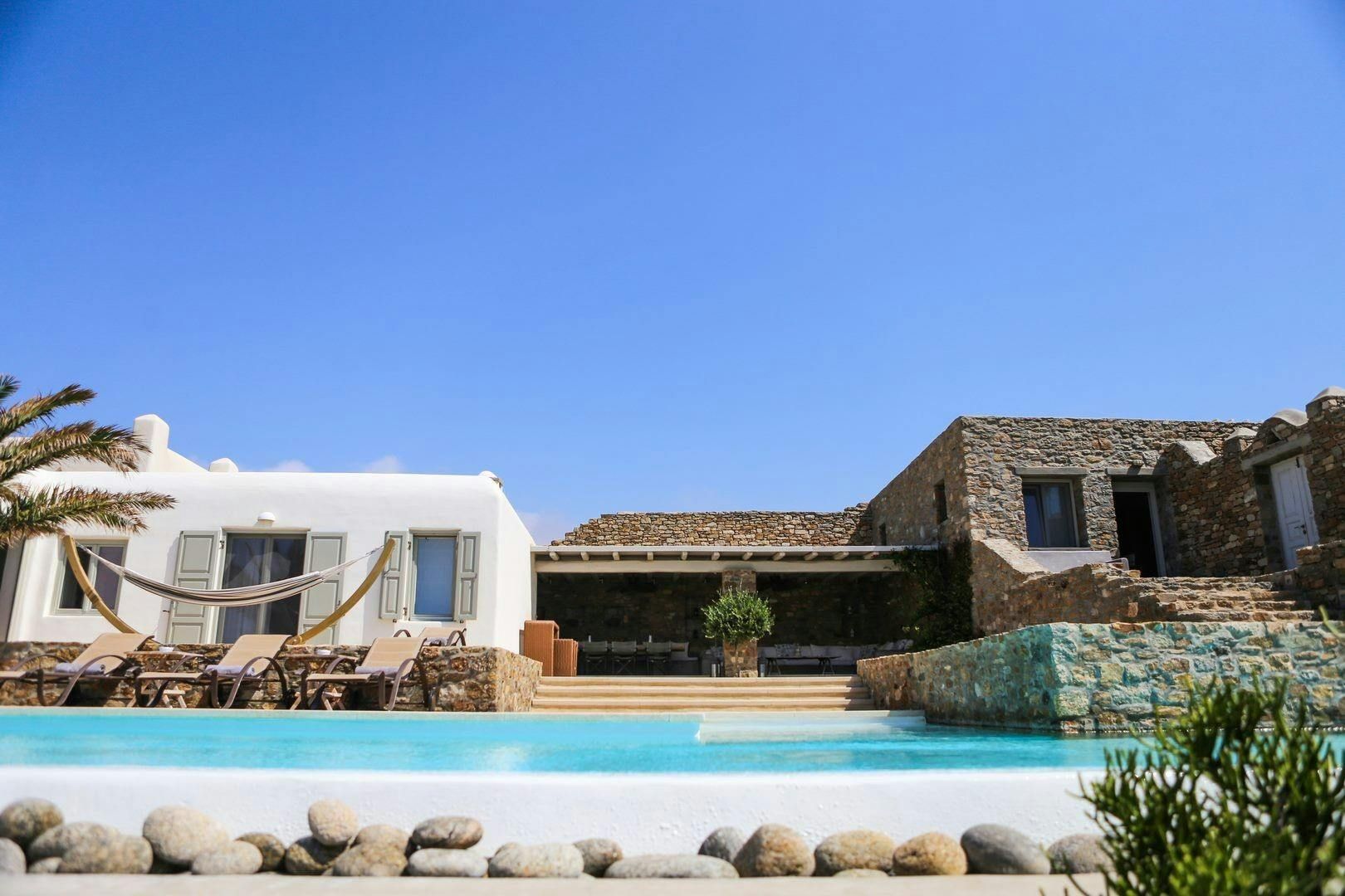 Only 600 metres from Agios Stefanos Beach, this sea-facing home consists of a main house and four separate guesthouses – prioritising privacy for your group. How about a barbecue after playing on the private football field? You can even hire a chef to take over the kitchen. While the pool terrace offers easy appeal, the low platform beds won't suit everyone. This villa is a fifteen-minute drive from the bustling Mykonos Town, and the concierge can point you towards the best bars.