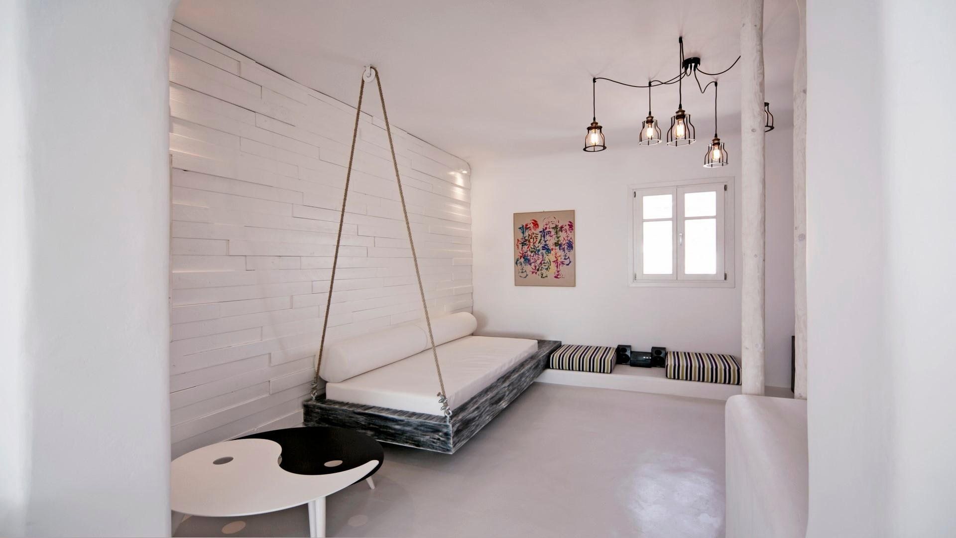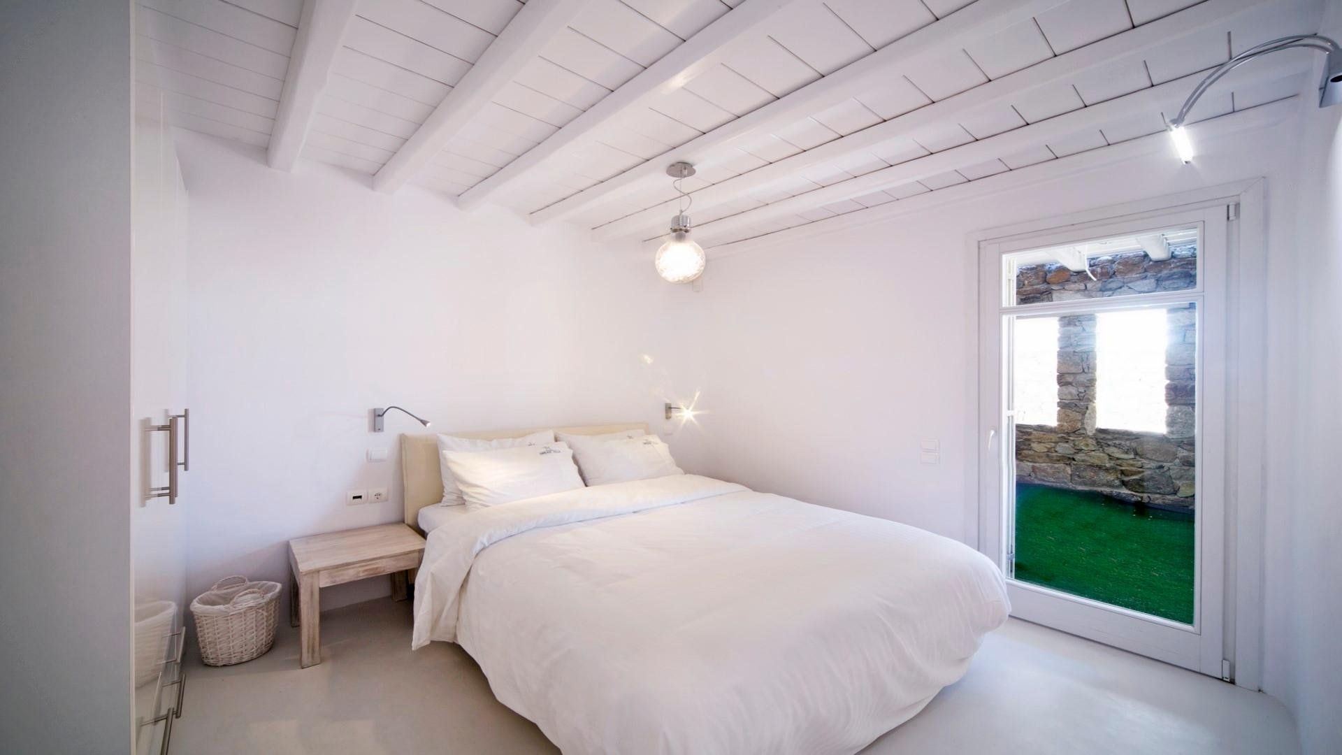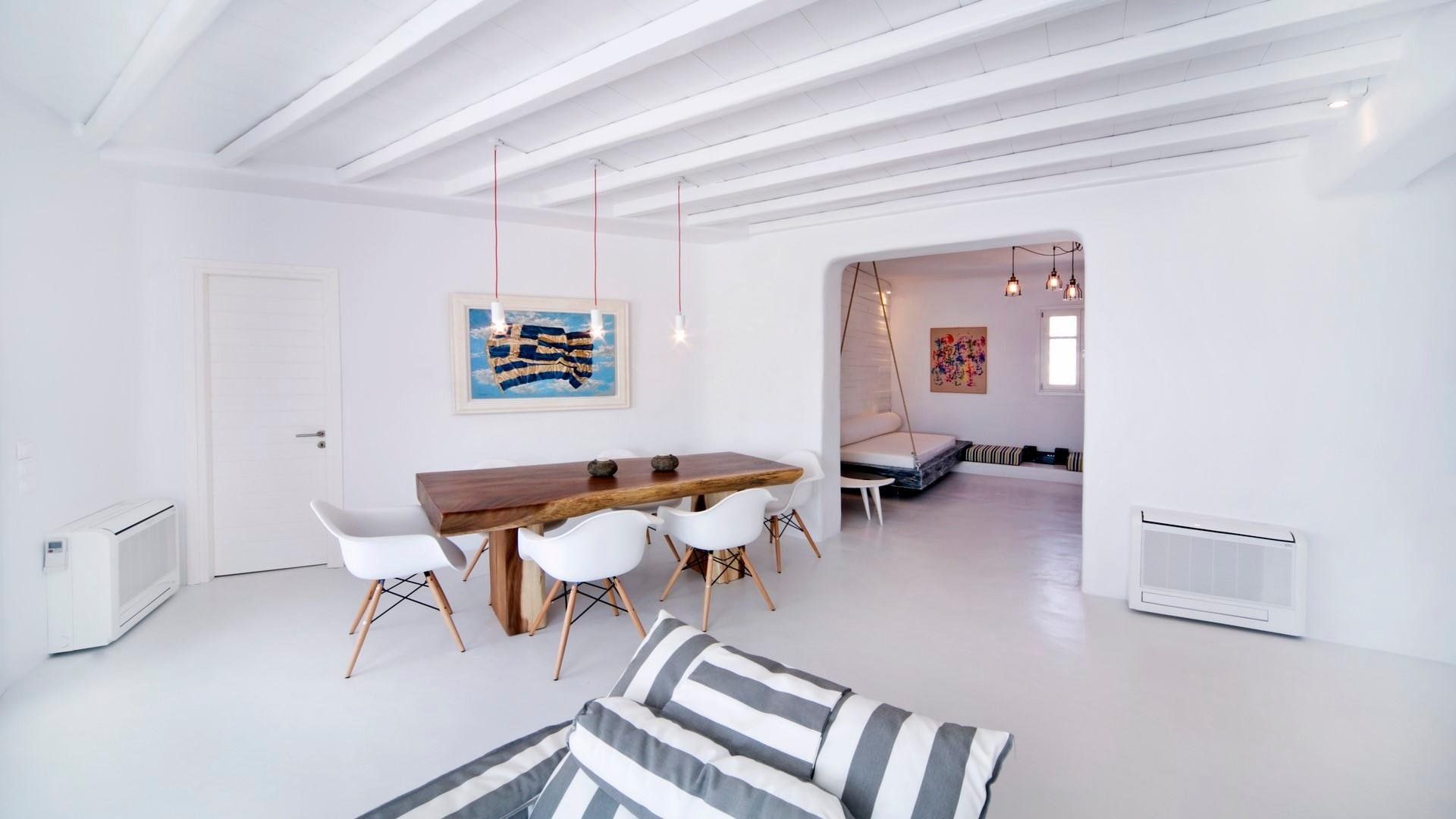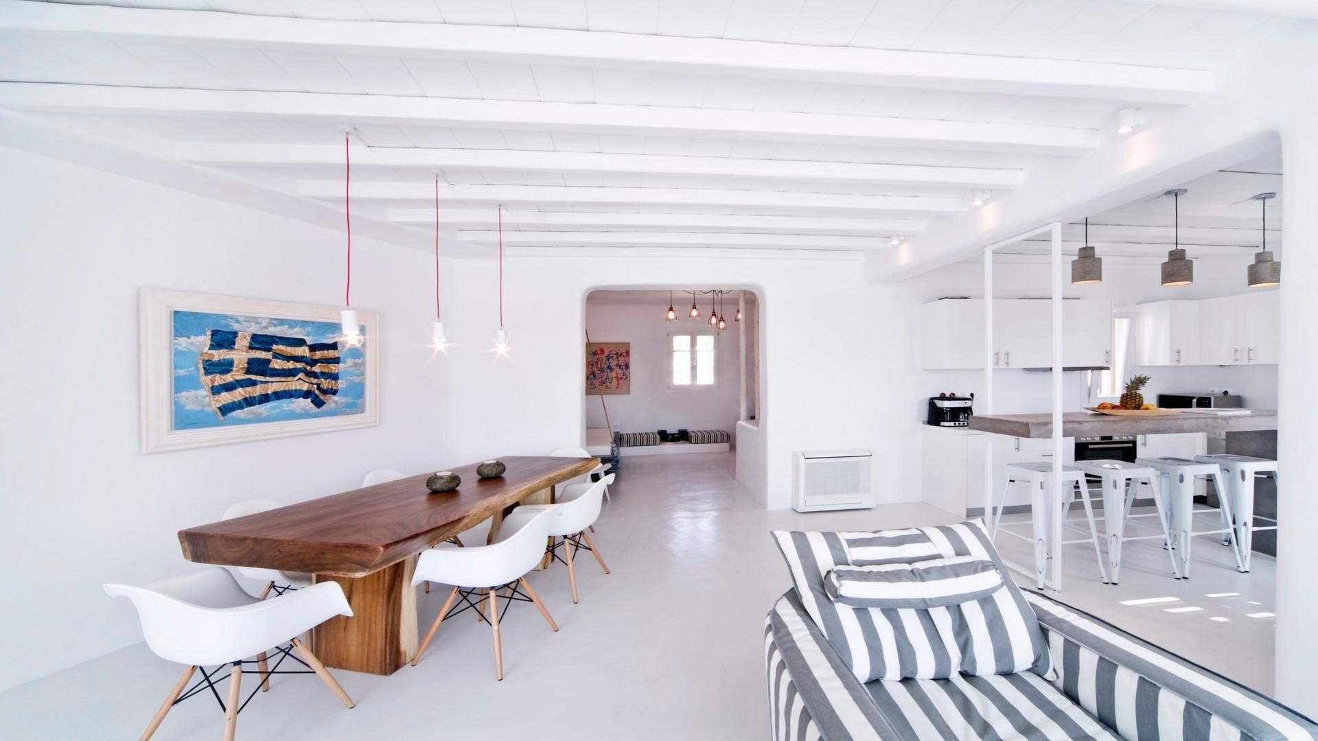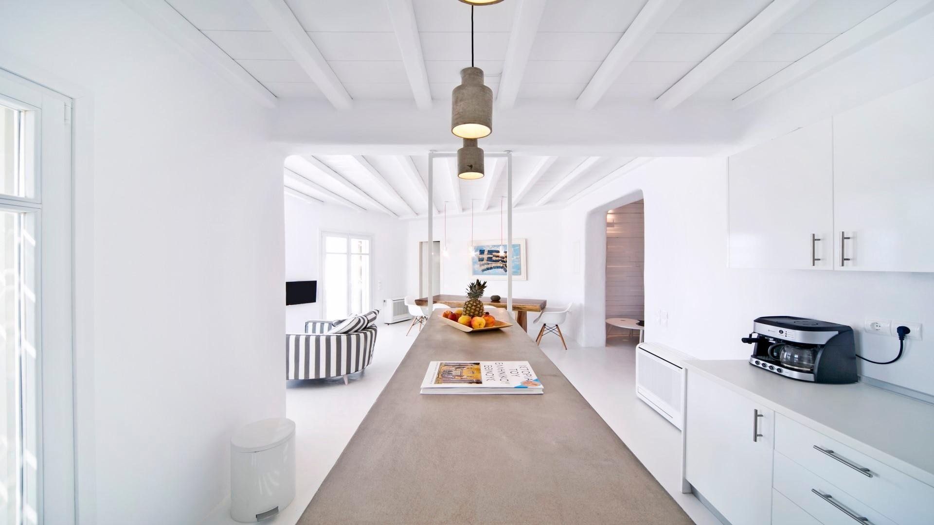 Designed with the surrounding natural environment in mind, the space aligns perfectly with the Mkykonian landscape and permits guests to unplug and tune in with the home's blissful setting.
