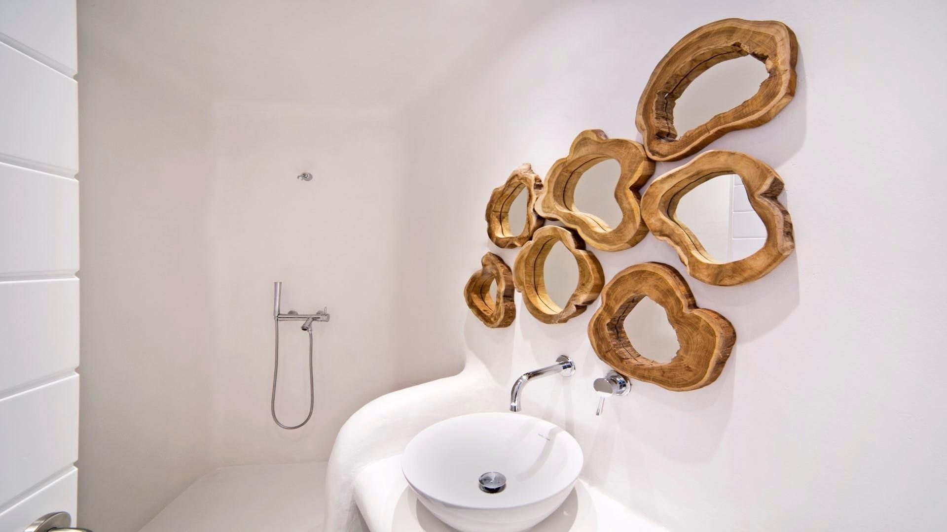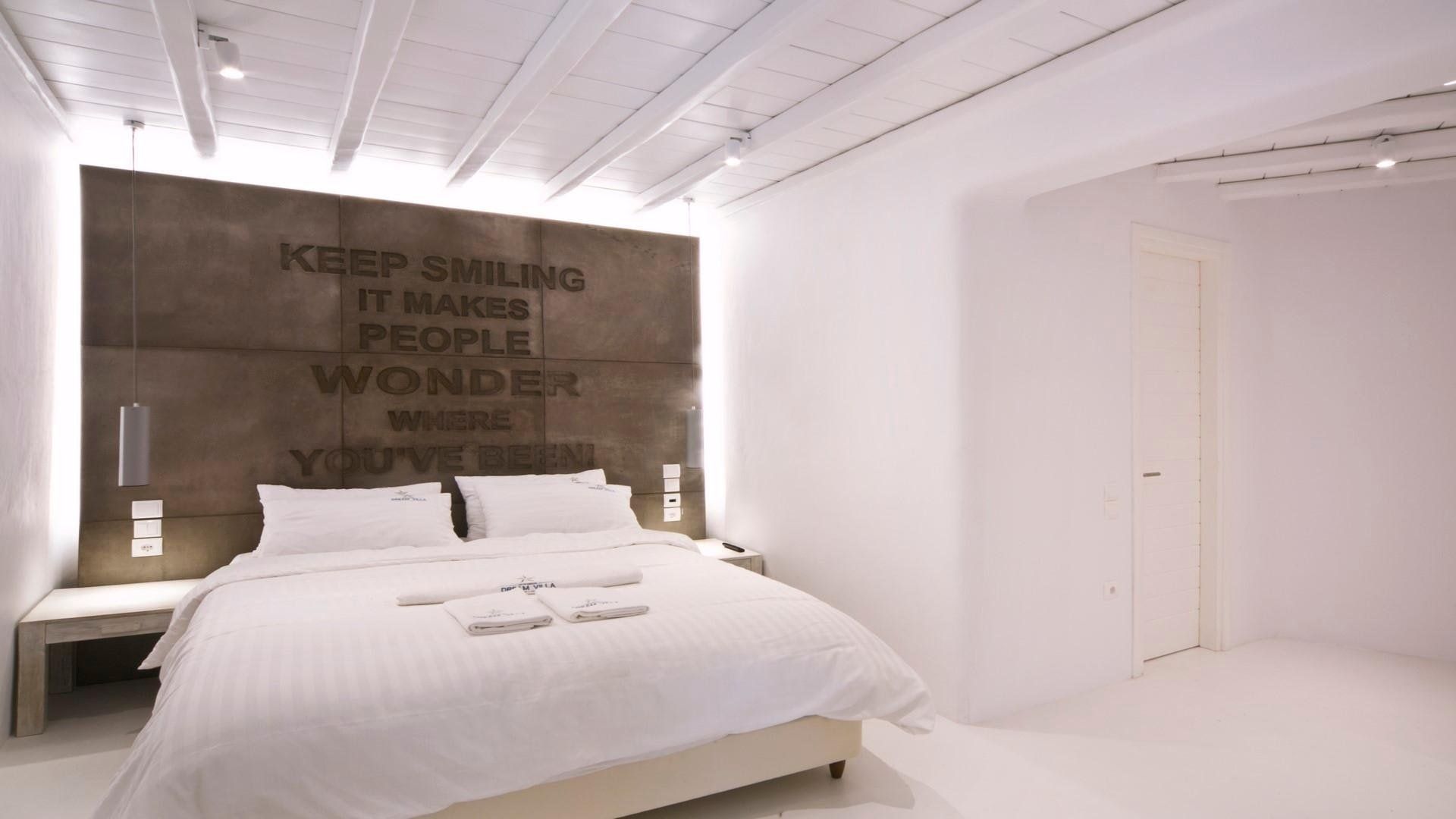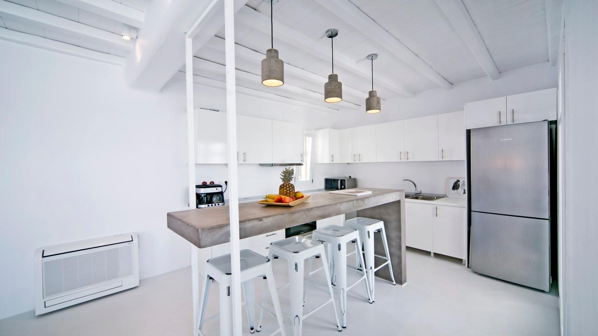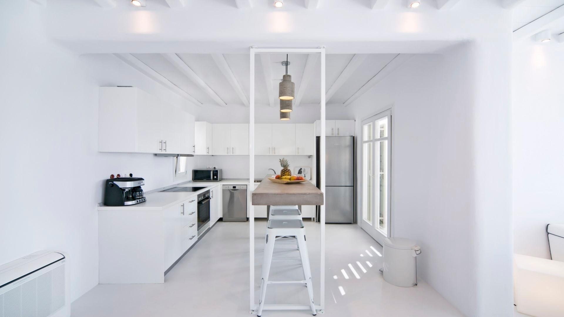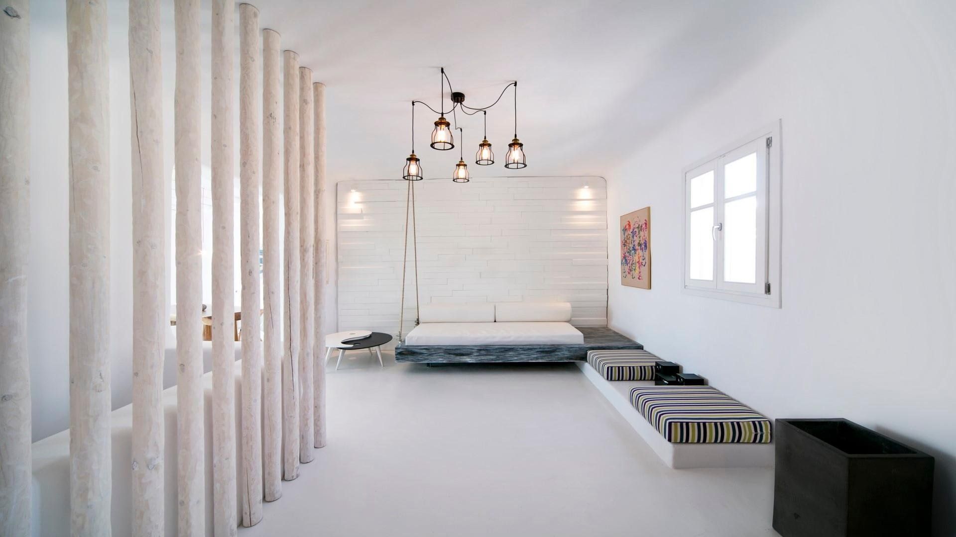 Designed with the surrounding natural environment in mind, the space aligns perfectly with the Mkykonian landscape and permits guests to unplug and tune in with the home's blissful setting.