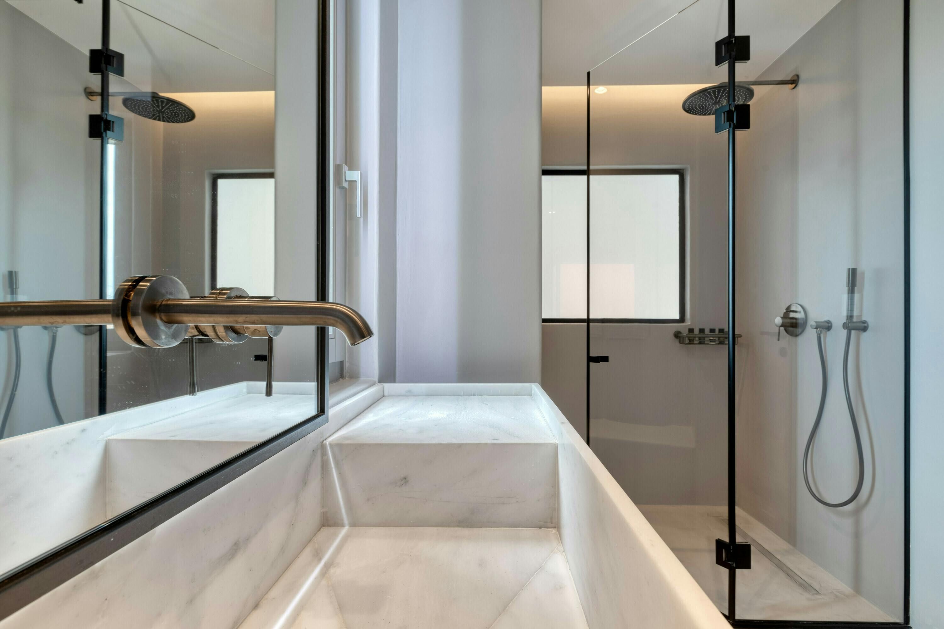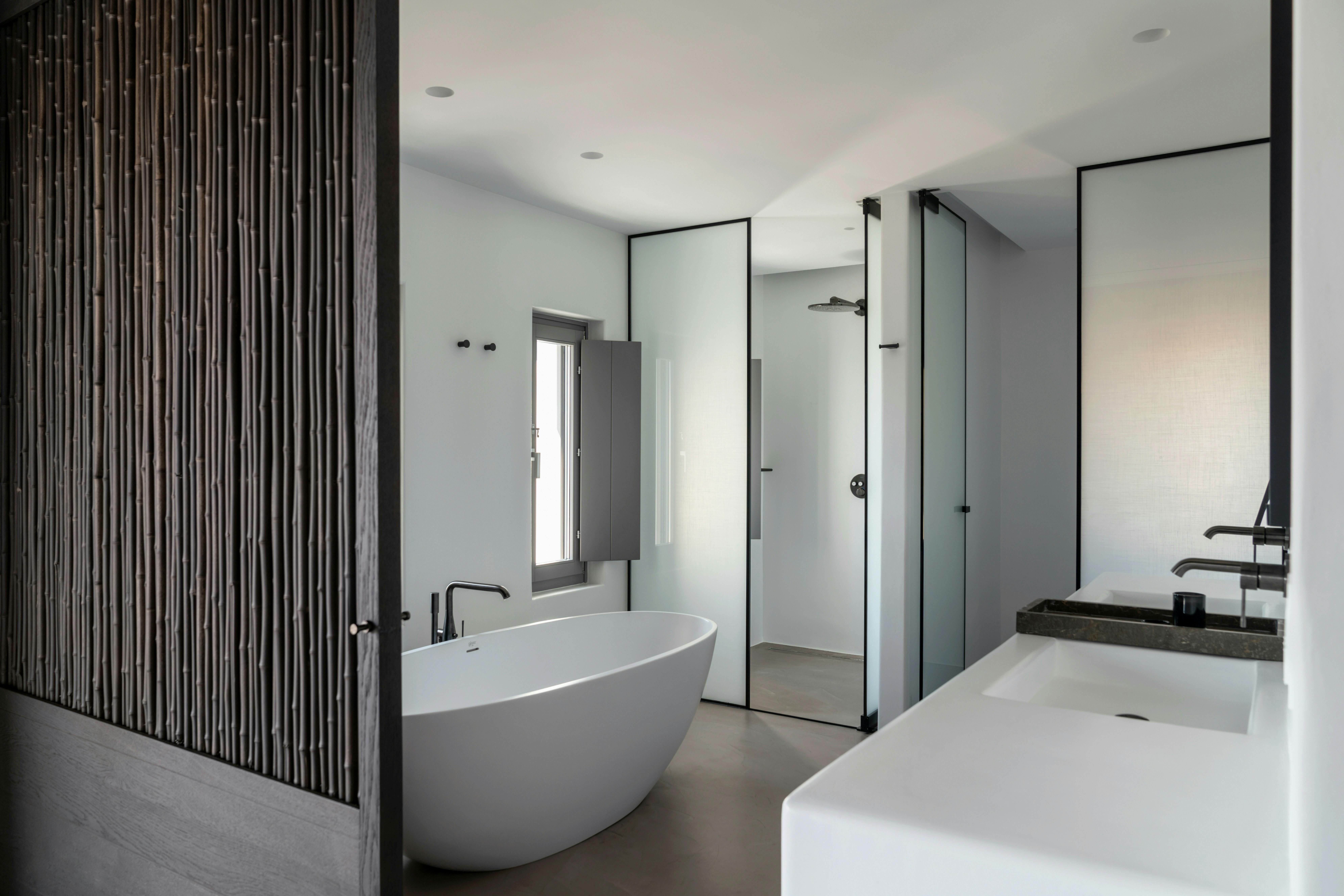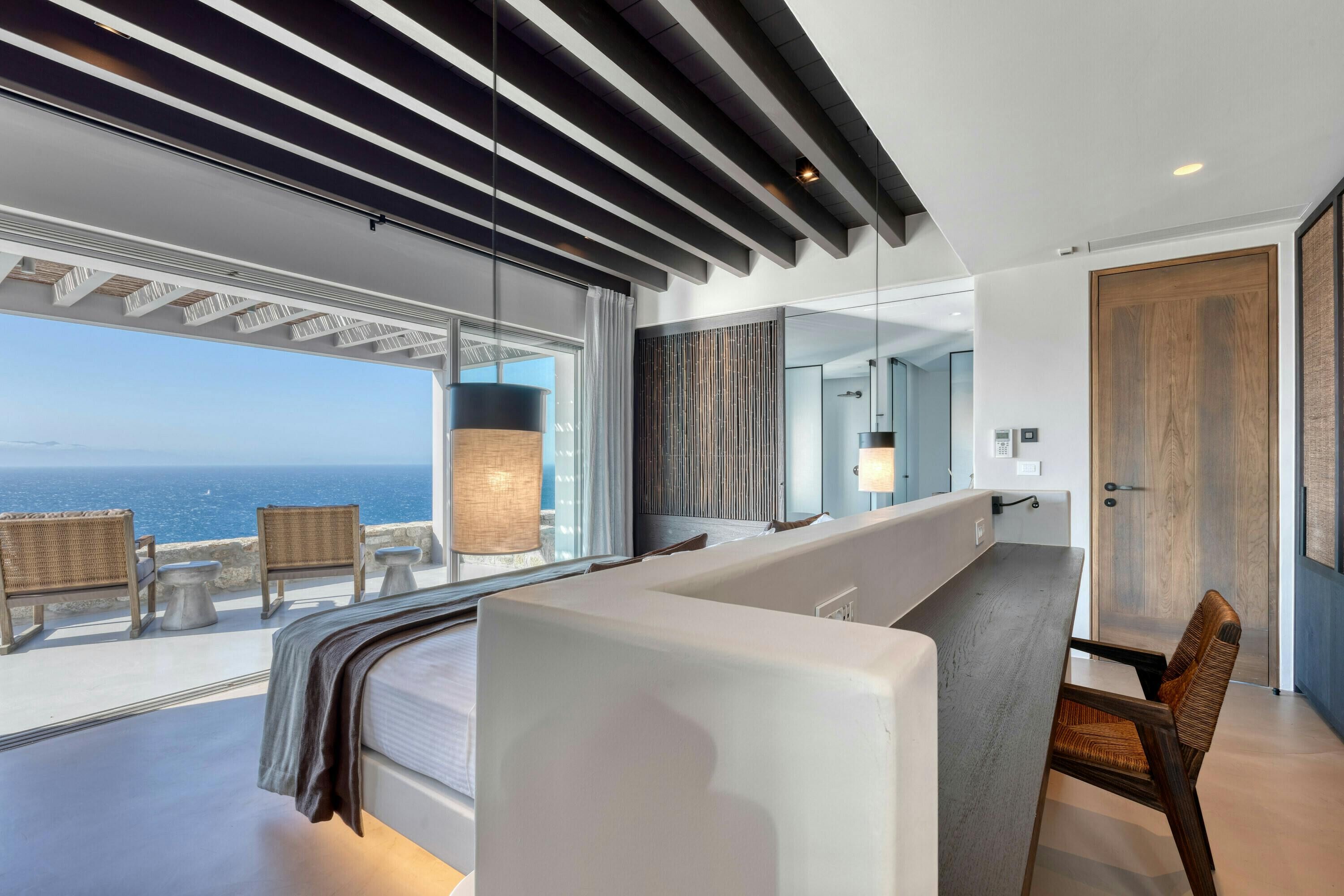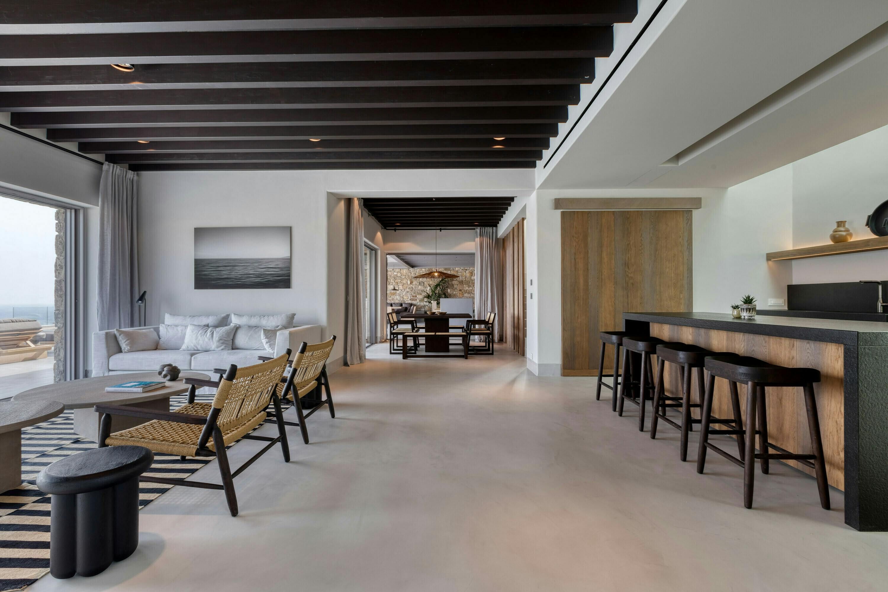 When it comes to the picture-perfect island escape, it doesn’t get much more dreamy than this home. Perched in the hills of Elia, there are stunning views across the south coast. There’s also a swimming pool which can be heated on request and a Jacuzzi as well as a gym for energising workouts. You’ll have a bar for sunset drinks and multiple terraces to choose from. It’s worth noting the rooms are set across the main house and the guest house, but this is a great option for groups looking to stretch out. It’s also in a fantastic location with Elia beach just a five-minute drive away, and a little further on to Mykonos Town.