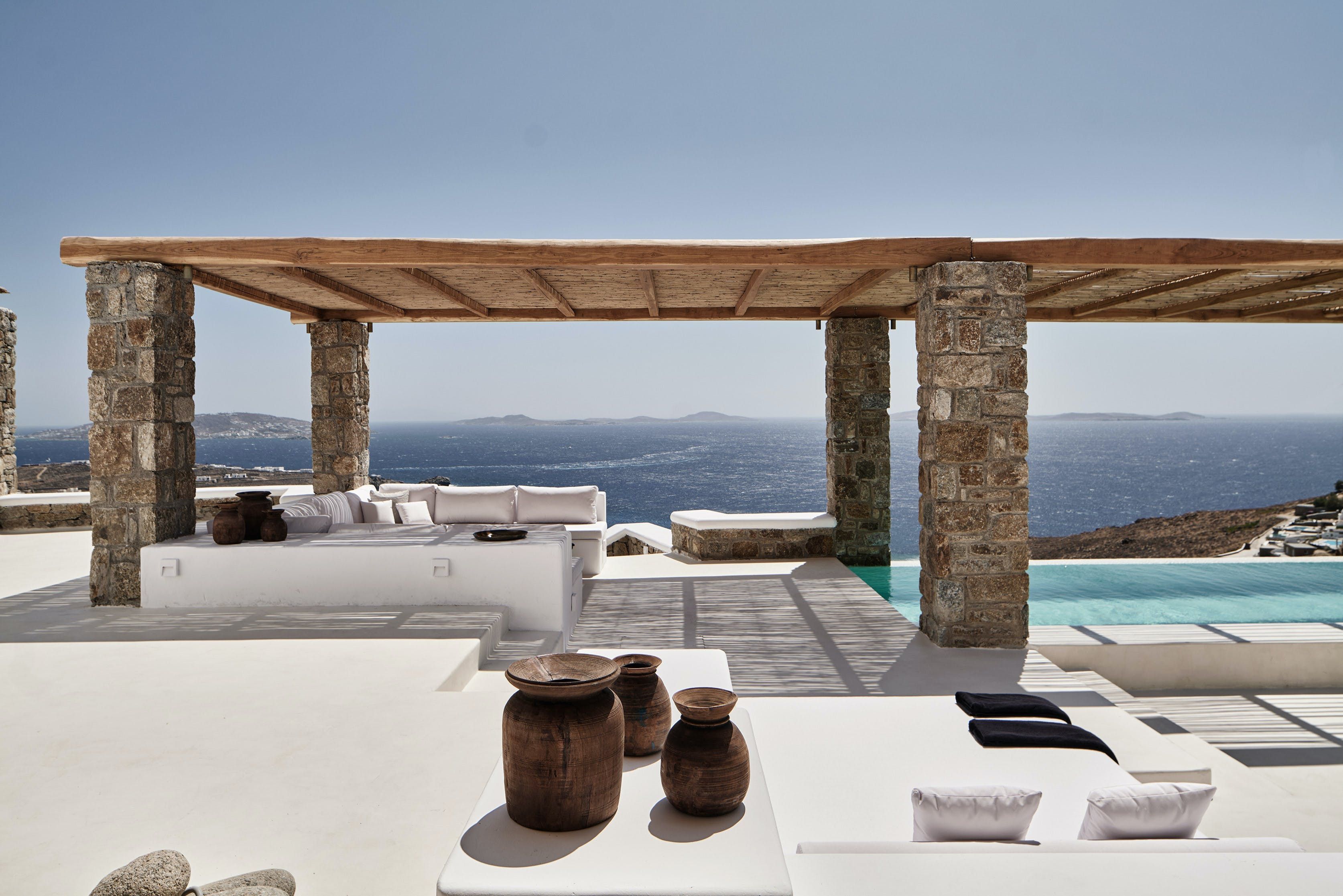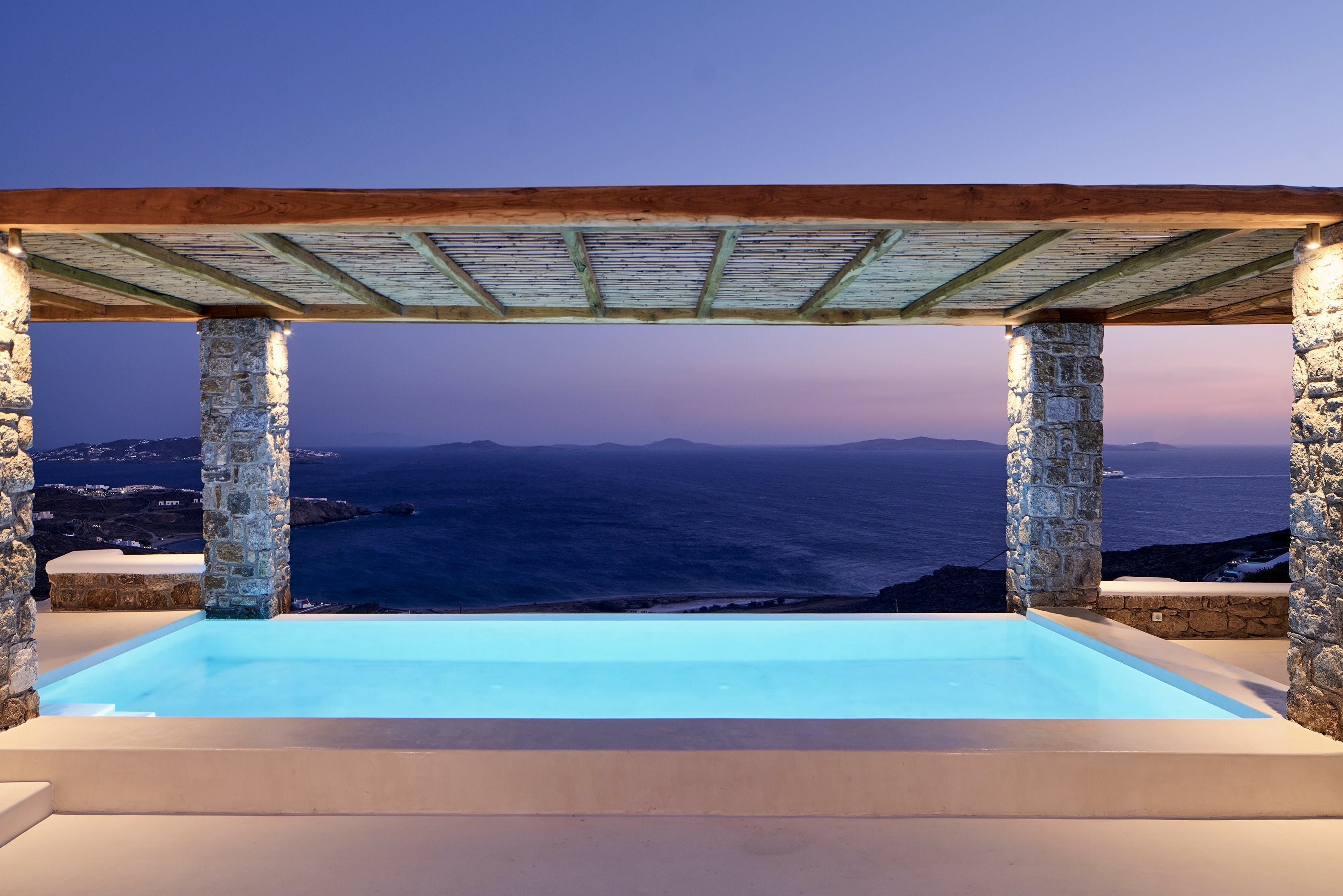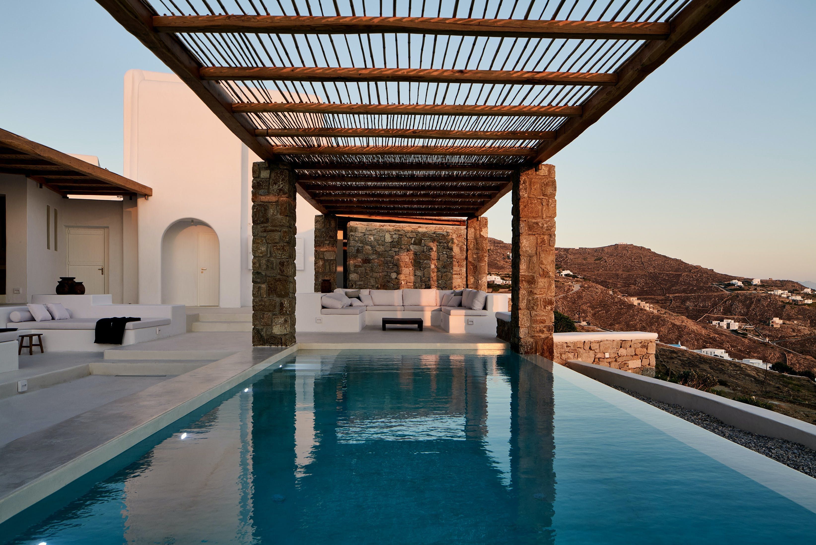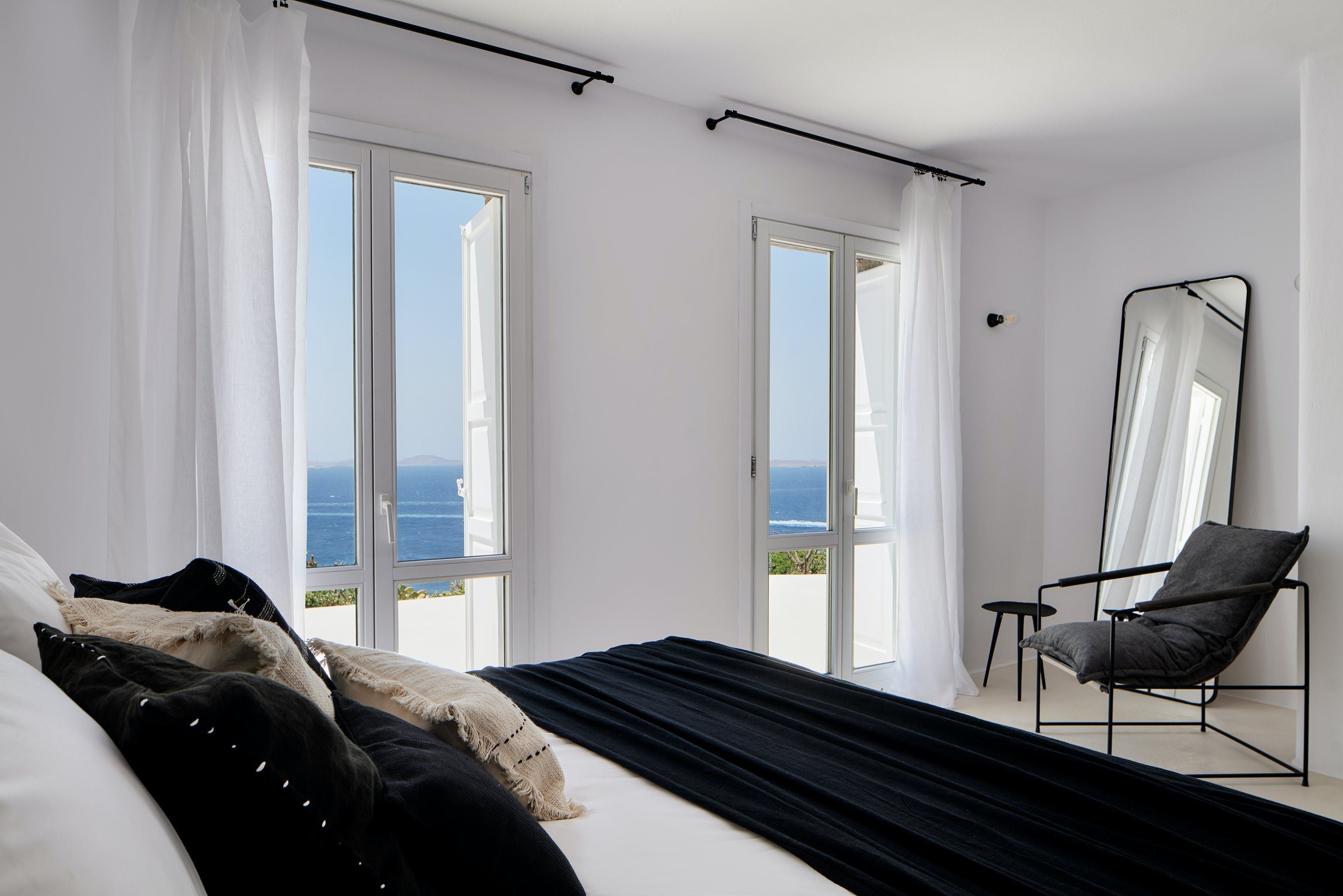A fully renovated Μykonian luxury property situated in the serene area of Houlakia, located just 5.5 km from the picturesque Mykonos Town. The villa, now renamed 'Les Cyclades', enjoys a magnificent view of the ancient Delos & Rhenia islands, as well as the neighboring Tinos Island. This bohemian-style retreat blends modern amenities with minimalist Cycladic architecture, providing guests with an exclusive and private accommodation experience. The property's advantageous location on the western part of Mykonos offers stunning sunset views over the Aegean Sea and an unforgettable panorama. 'Les Cyclades' features a large infinity pool, perfect for a refreshing dip while enjoying the breathtaking view. With spacious outdoor areas, built-in sunbeds and lounges, guests can relax and soak up the Mediterranean sun. The villa unfolds over three levels, offering luxurious bedrooms with ensuite bathrooms and terraces that capture the island's captivating beauty.