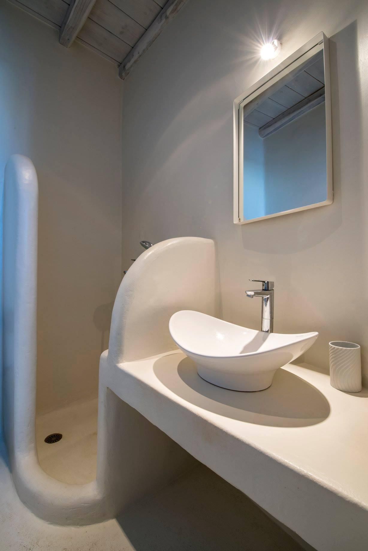 The interior is inspired by traditional Cyclades architecture, with thick white stone walls curving around each room. Exposed stone walls and a fireplace keep the living room with one foot in tradition, but the decor is decidedly boho-chic. Bedrooms sit beneath wooden ceilings with beds tucked into the curve of stone, and the master opens up to a terrace with a Jacuzzi tub and ocean view.