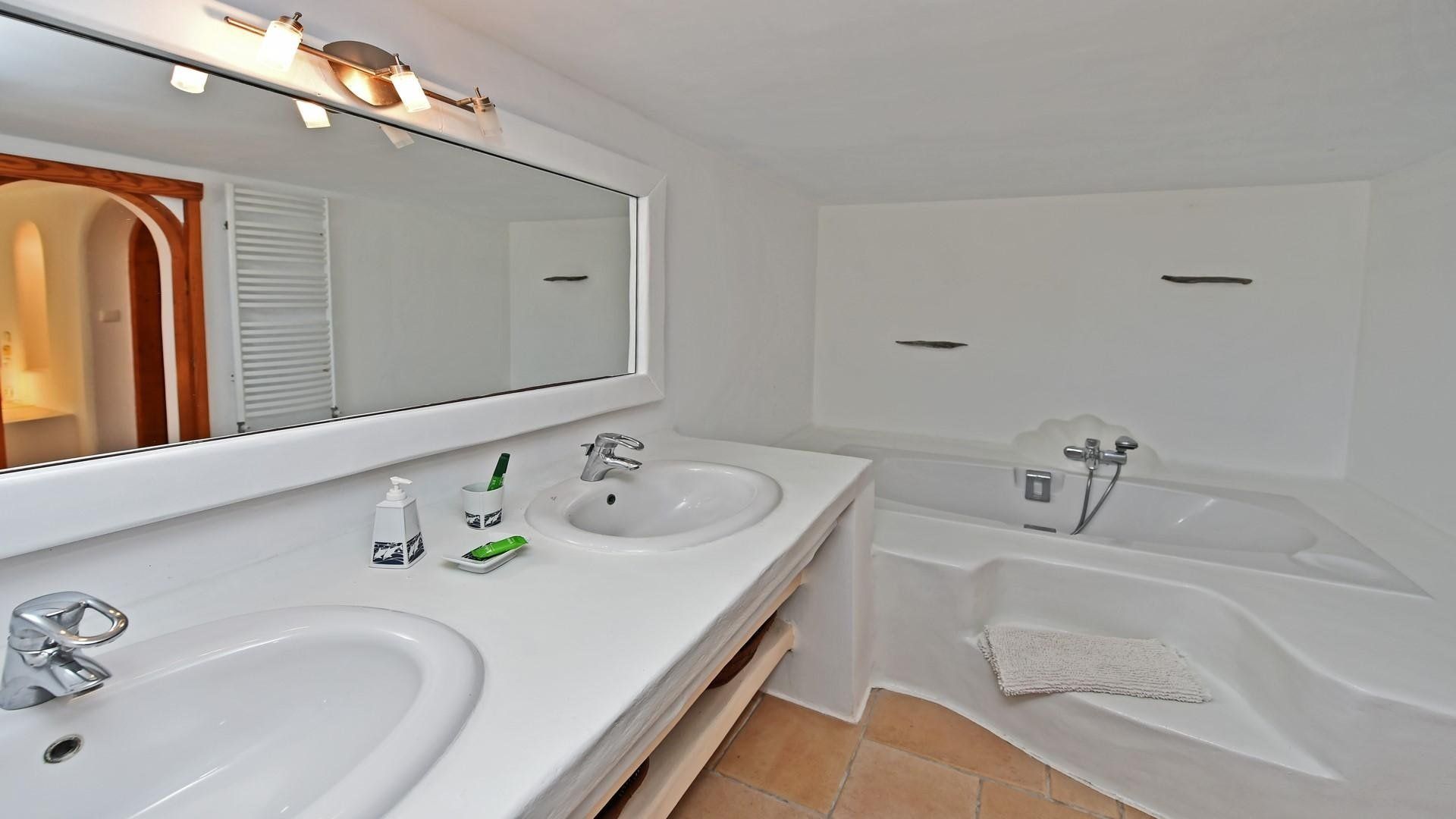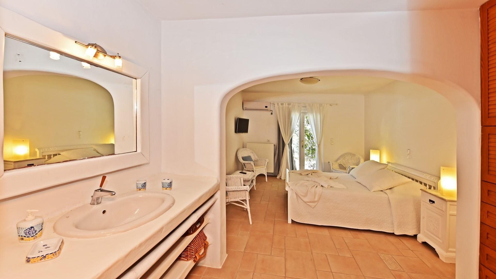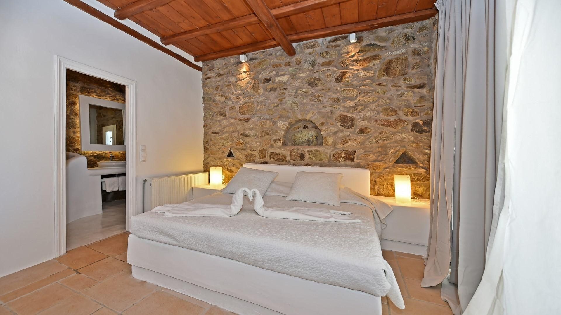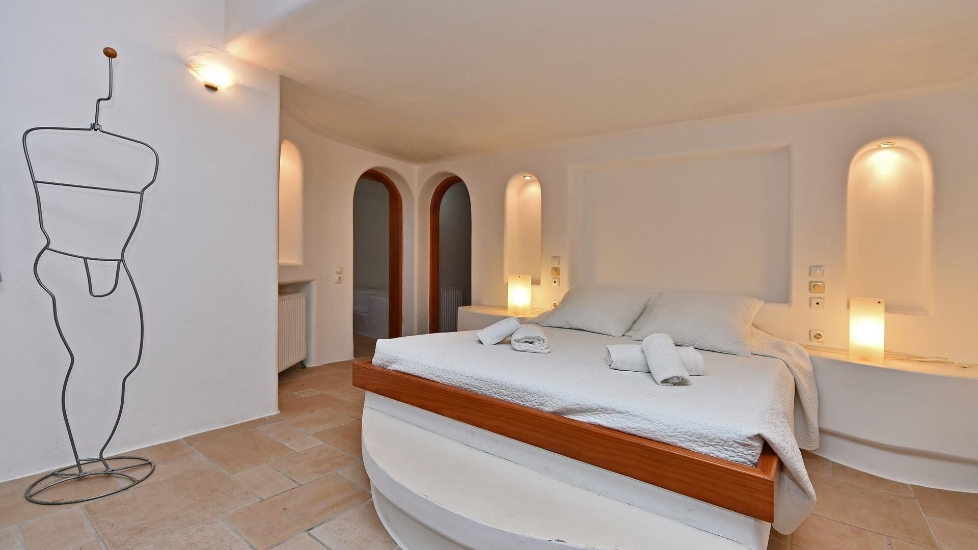 Open up the wall of glass doors to create a full outdoor lounge, decked out with white sofas and covered by a wooden ceiling. From here, a stone archway leads to the dining area which can be turned alfresco by folding back the glass doors. A dedicated bar in the dining room is perfect for a pre-dinner tipple. The design is pure Greek, with white-wash stone walls and smooth edges, but there are pops of Asian influence too like the gong in the breakfasting kitchen and teak globe in the dining room.