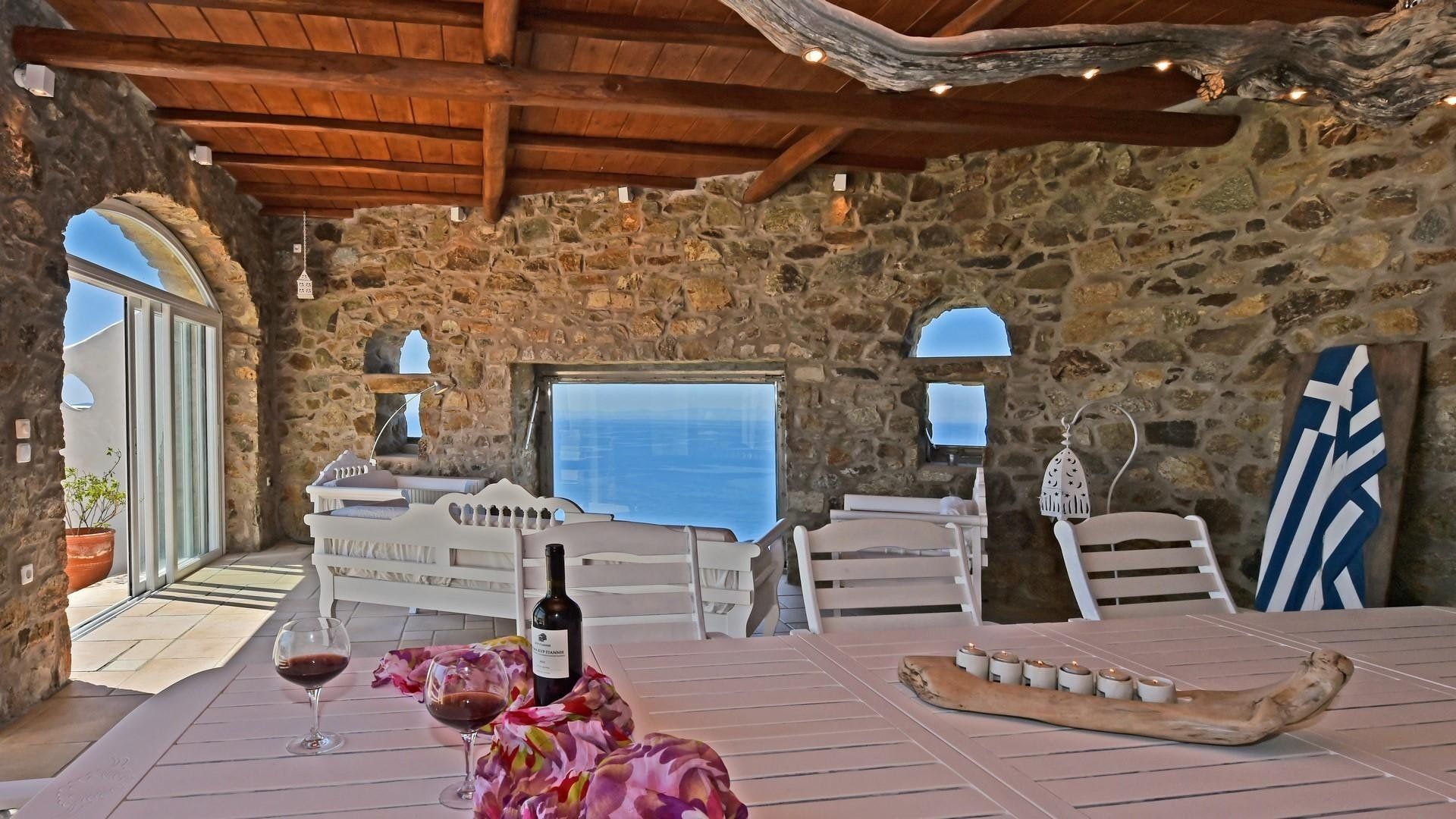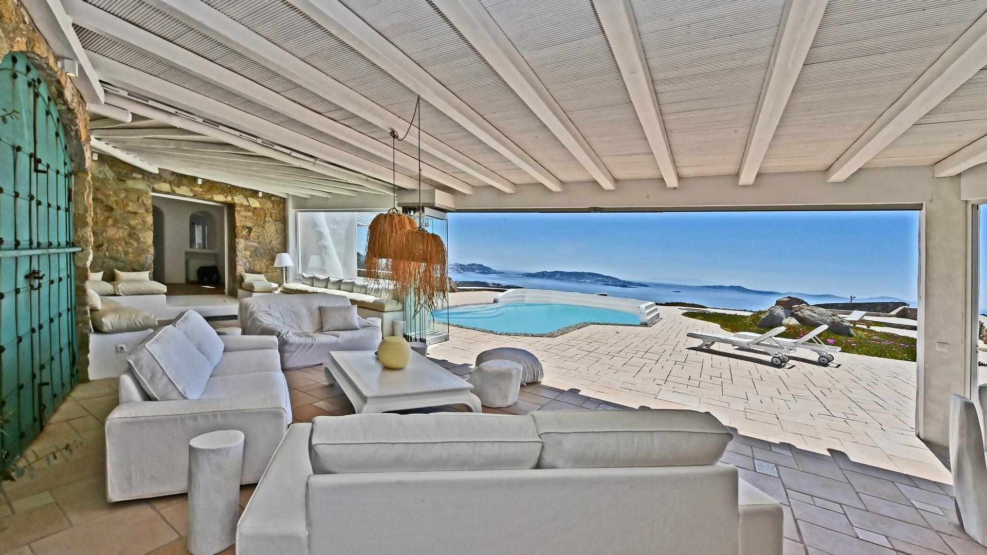 Up on a hilltop and facing west over the sea, sunsets from this villa are some of the best on Mykonos. Watch the sky streak pink and purple as Delos island floats on the horizon and the coastline towns below twinkle to life. During the day, a sea breeze cools the terrace, where a pristine swimming pool invites you to take a dip and loungers are spread across the huge, stone expanse.