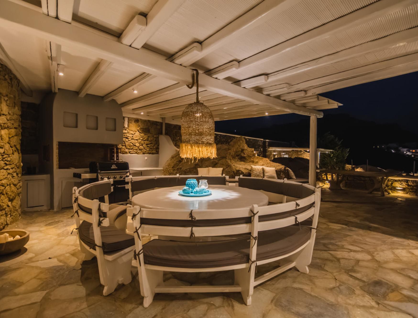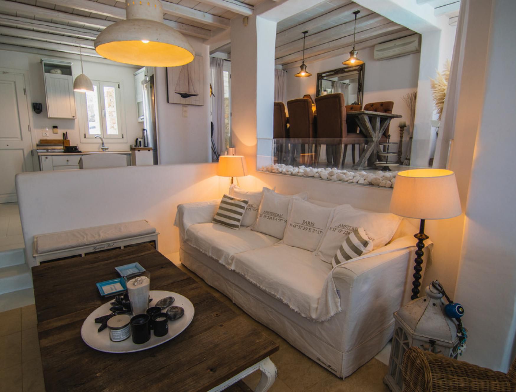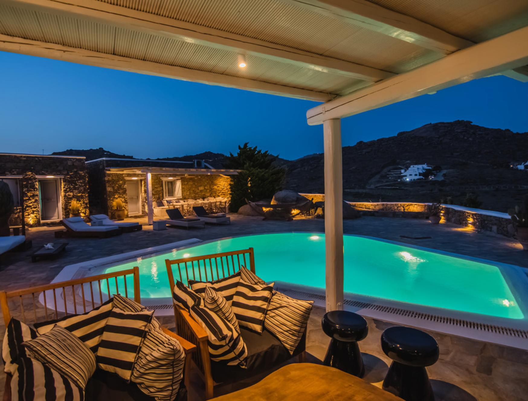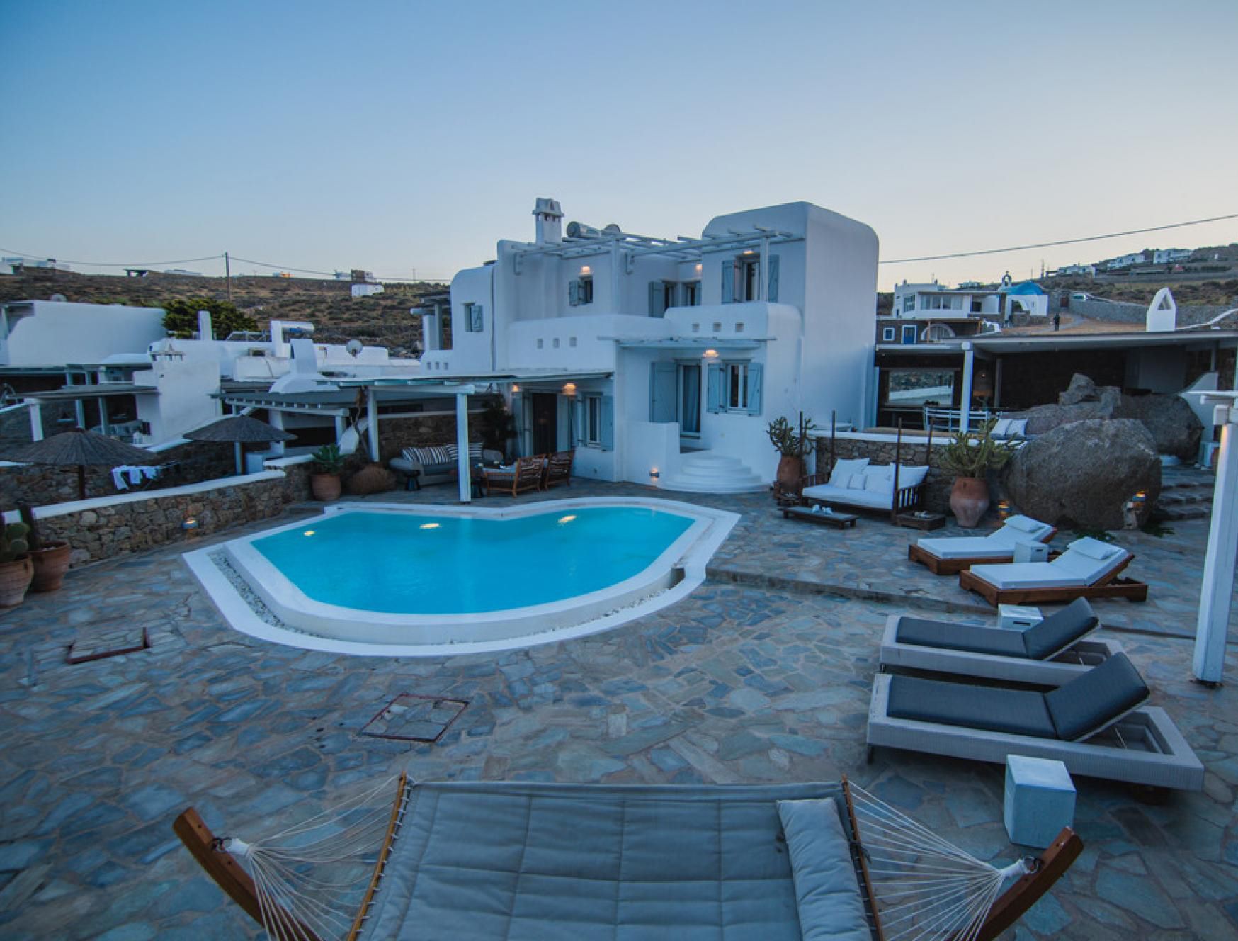 This luxurious villa is located in Mykonos, in the coastal village of Kalafatis. Made up of a main house and two guest houses, we think this is a great choice for friend groups or families with members that might want a little extra privacy. Alfresco amenities are in abundance here, with dining space and a barbecue in the shade and a large private pool surrounded by sun loungers and a hammock. Kalafatis Beach is only a short walk away, but we recommend driving into Mykonos Town, which is around fifteen minutes away by car.