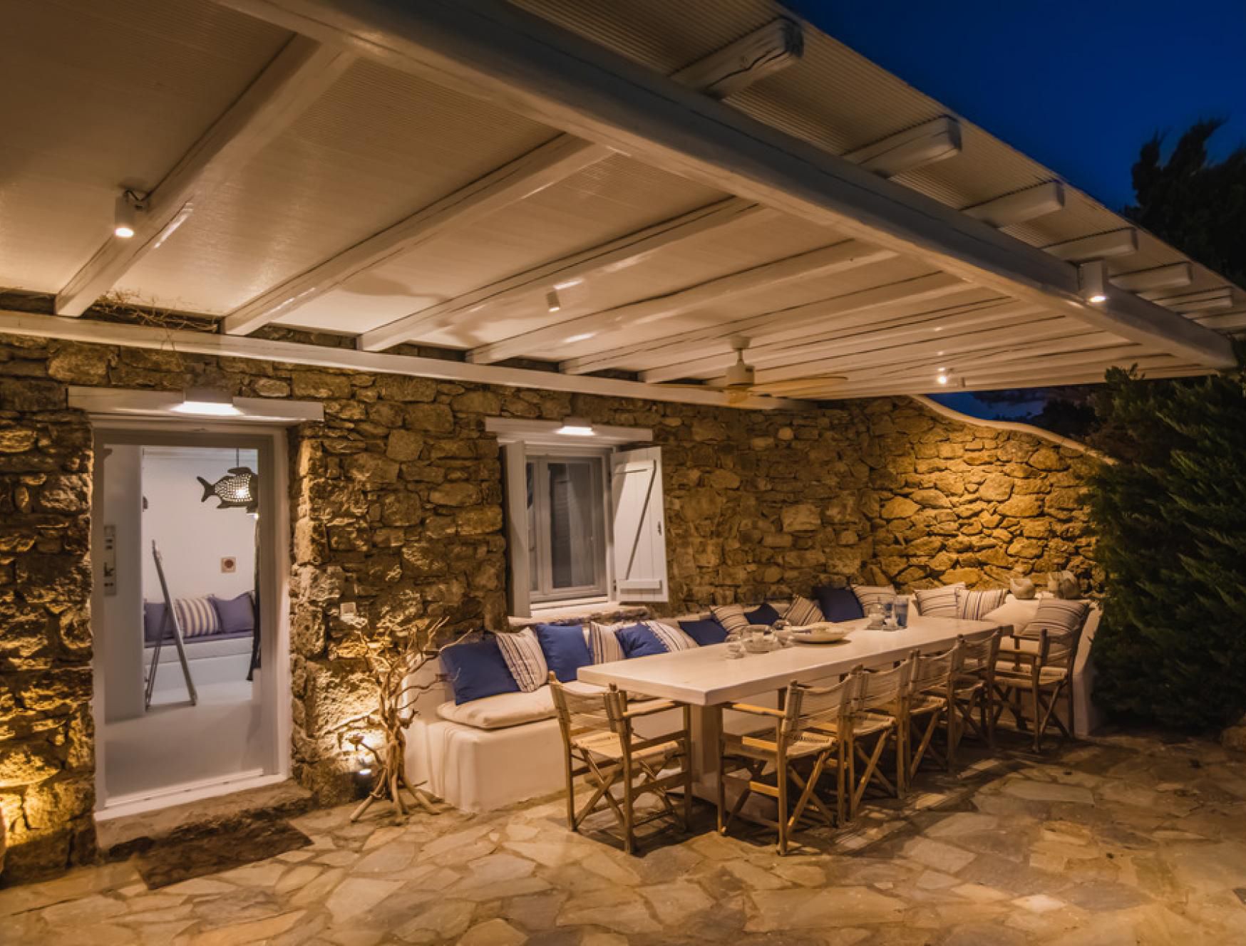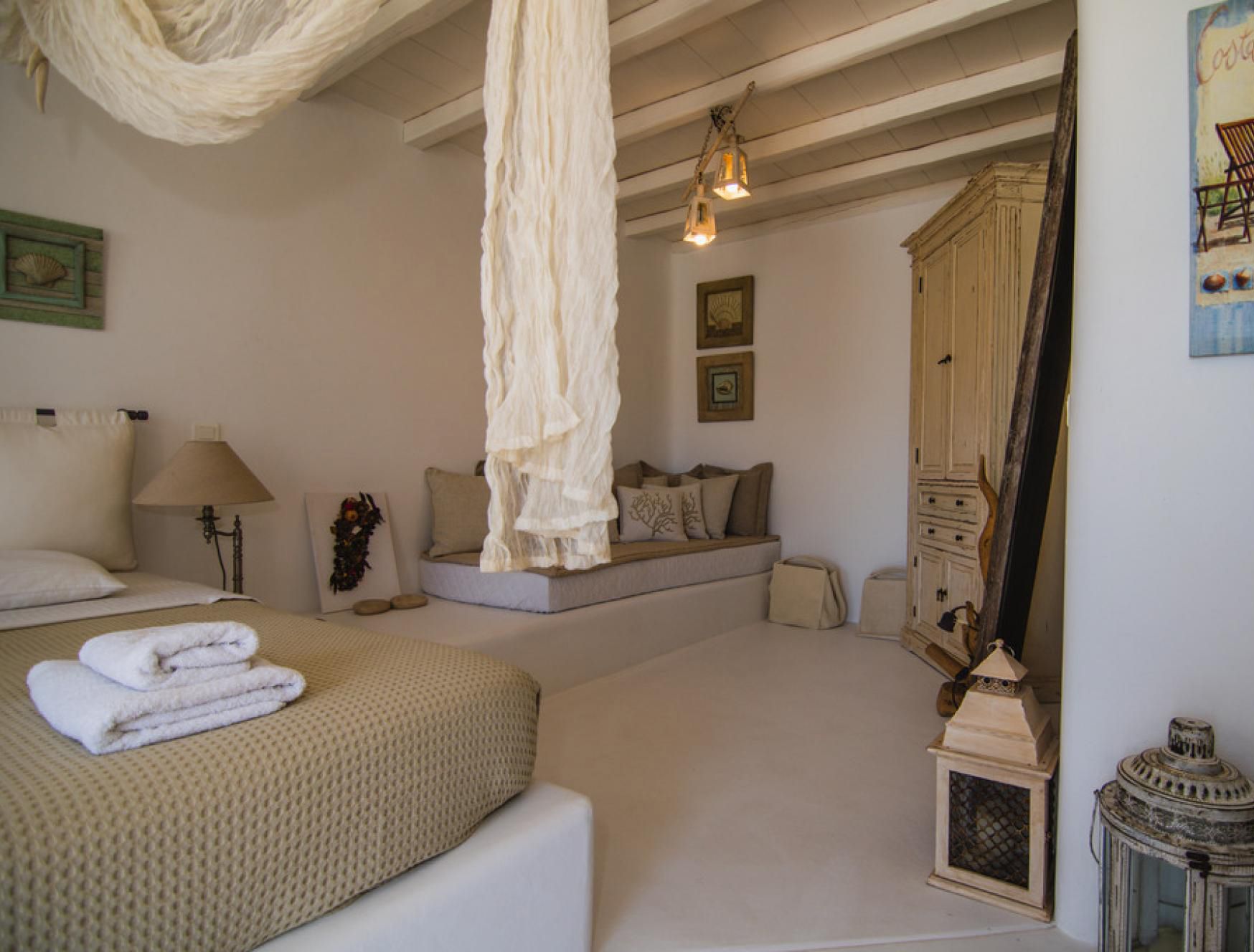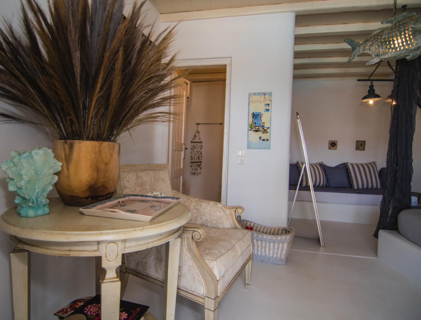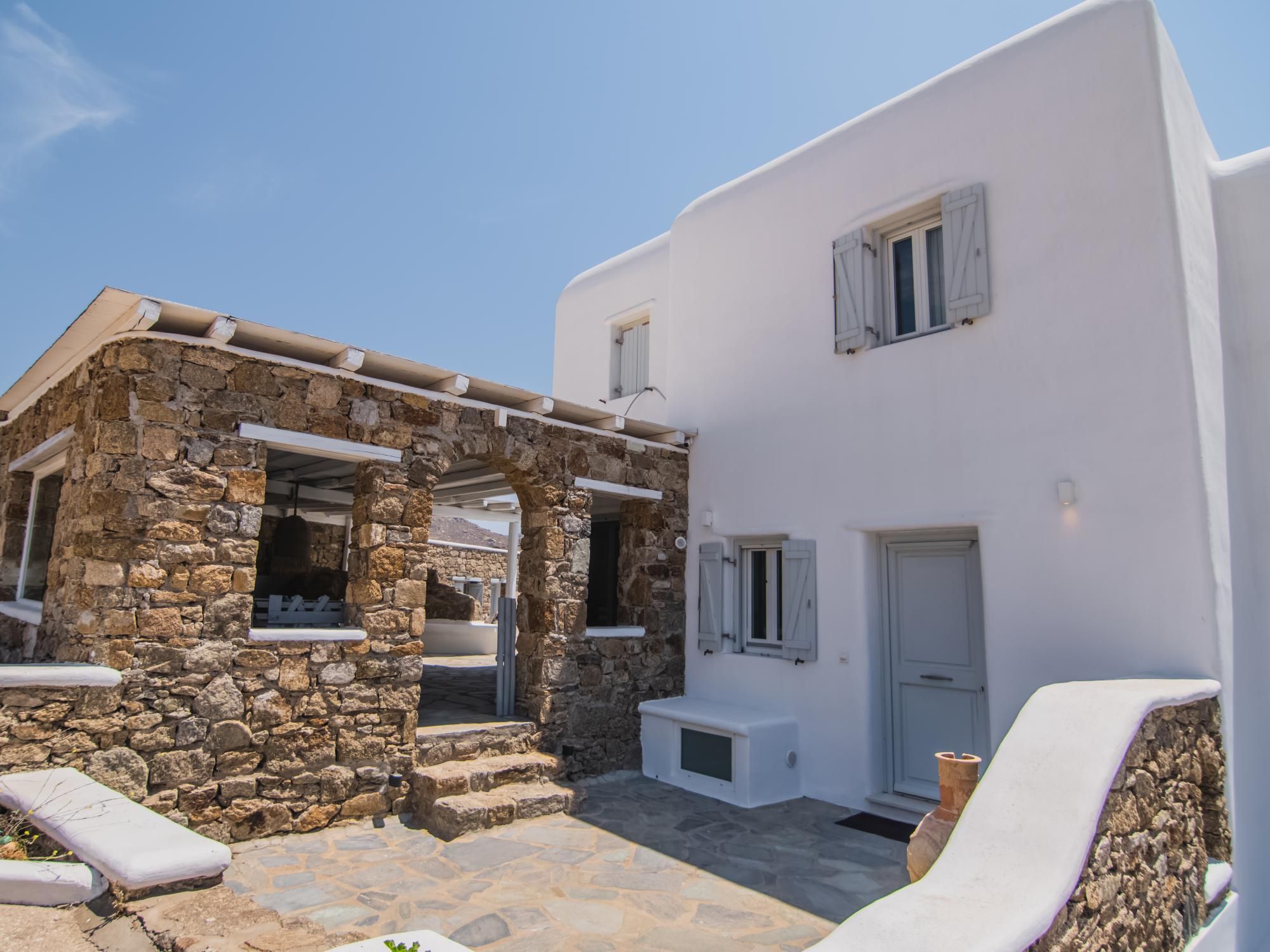 This luxurious villa is located in Mykonos, in the coastal village of Kalafatis. Made up of a main house and two guest houses, we think this is a great choice for friend groups or families with members that might want a little extra privacy. Alfresco amenities are in abundance here, with dining space and a barbecue in the shade and a large private pool surrounded by sun loungers and a hammock. Kalafatis Beach is only a short walk away, but we recommend driving into Mykonos Town, which is around fifteen minutes away by car.