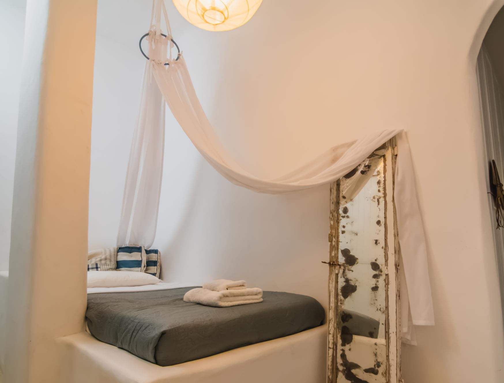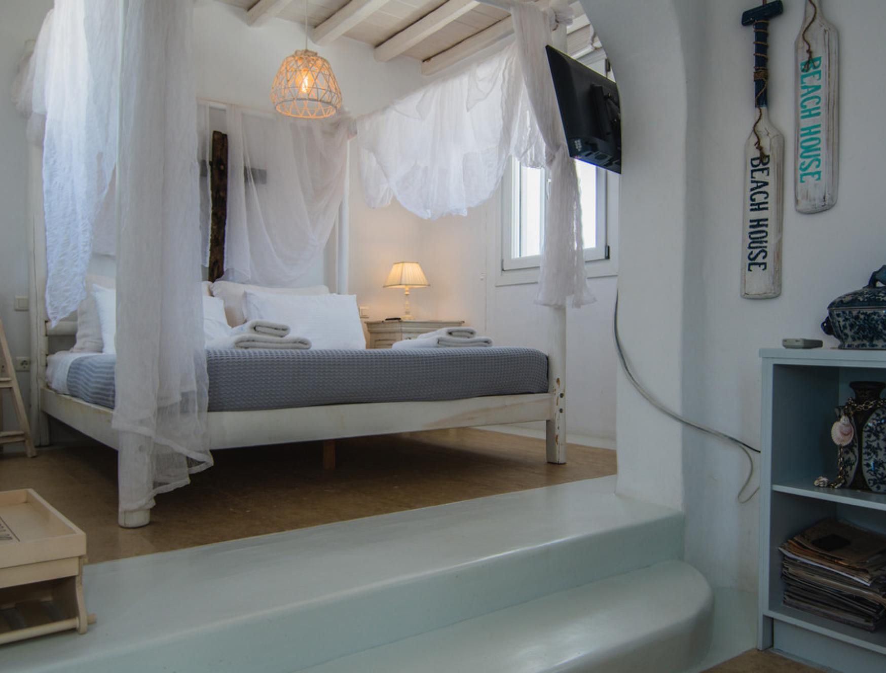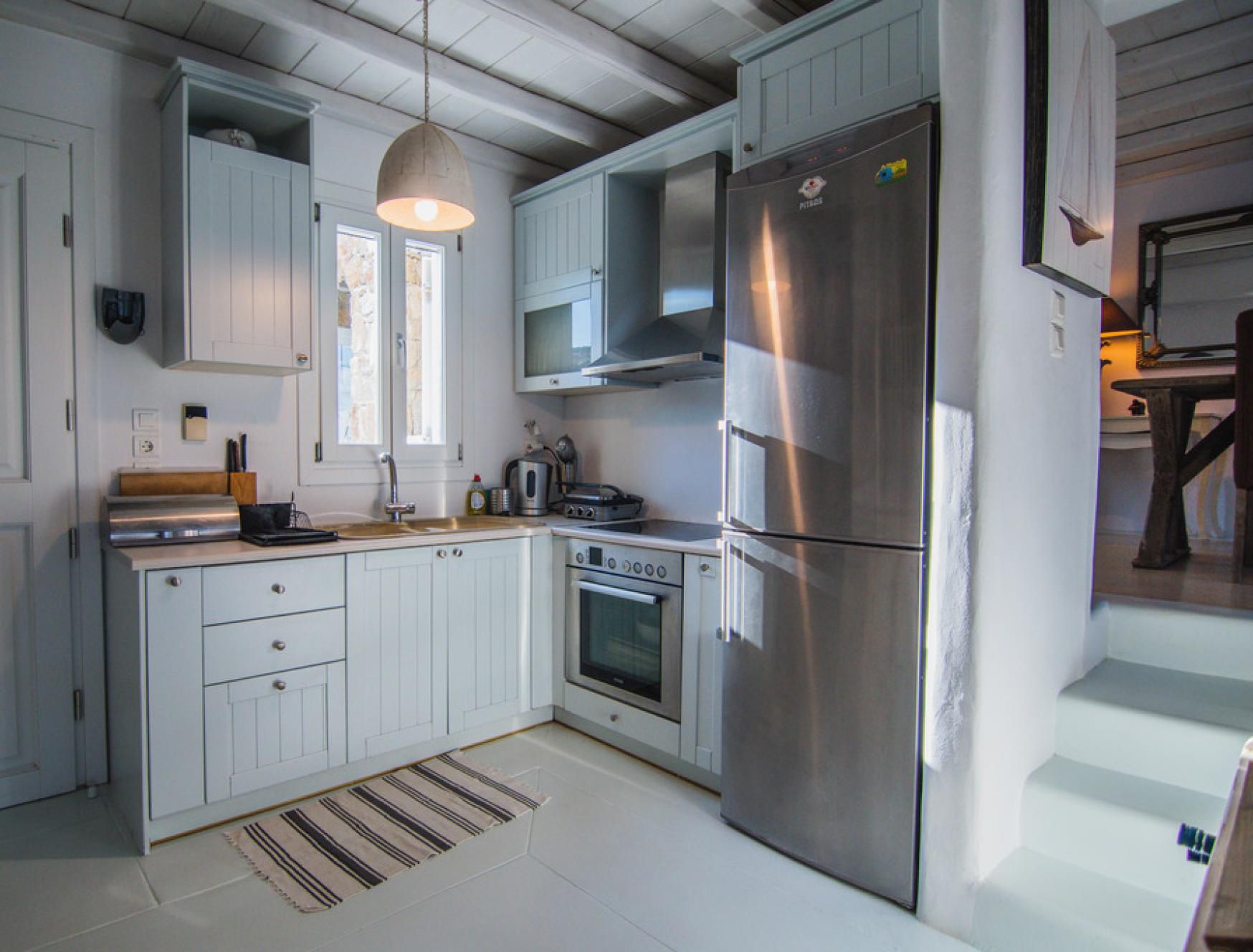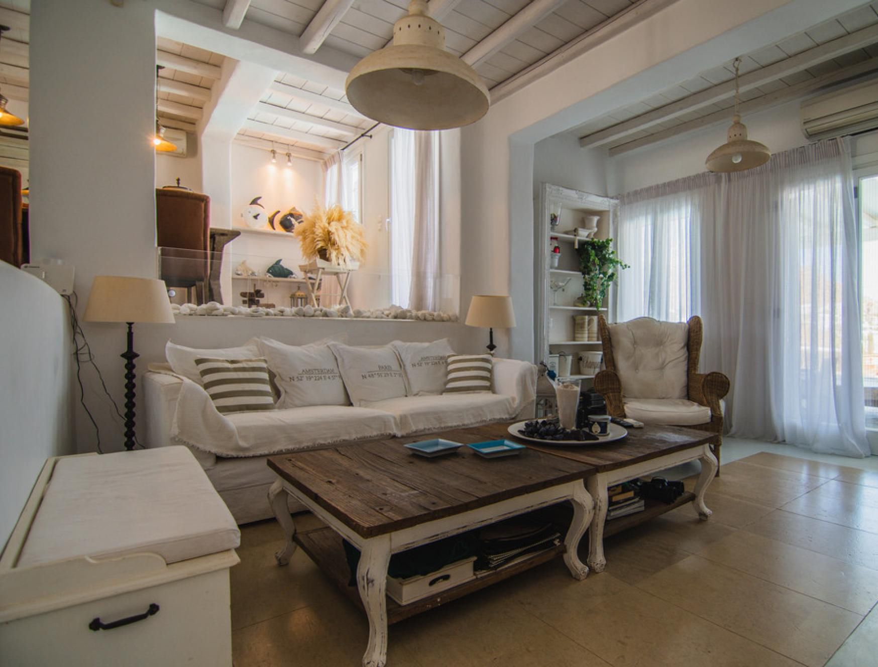 This luxurious villa is located in Mykonos, in the coastal village of Kalafatis. Made up of a main house and two guest houses, we think this is a great choice for friend groups or families with members that might want a little extra privacy. Alfresco amenities are in abundance here, with dining space and a barbecue in the shade and a large private pool surrounded by sun loungers and a hammock. Kalafatis Beach is only a short walk away, but we recommend driving into Mykonos Town, which is around fifteen minutes away by car.
