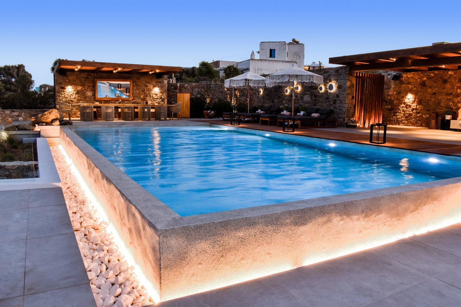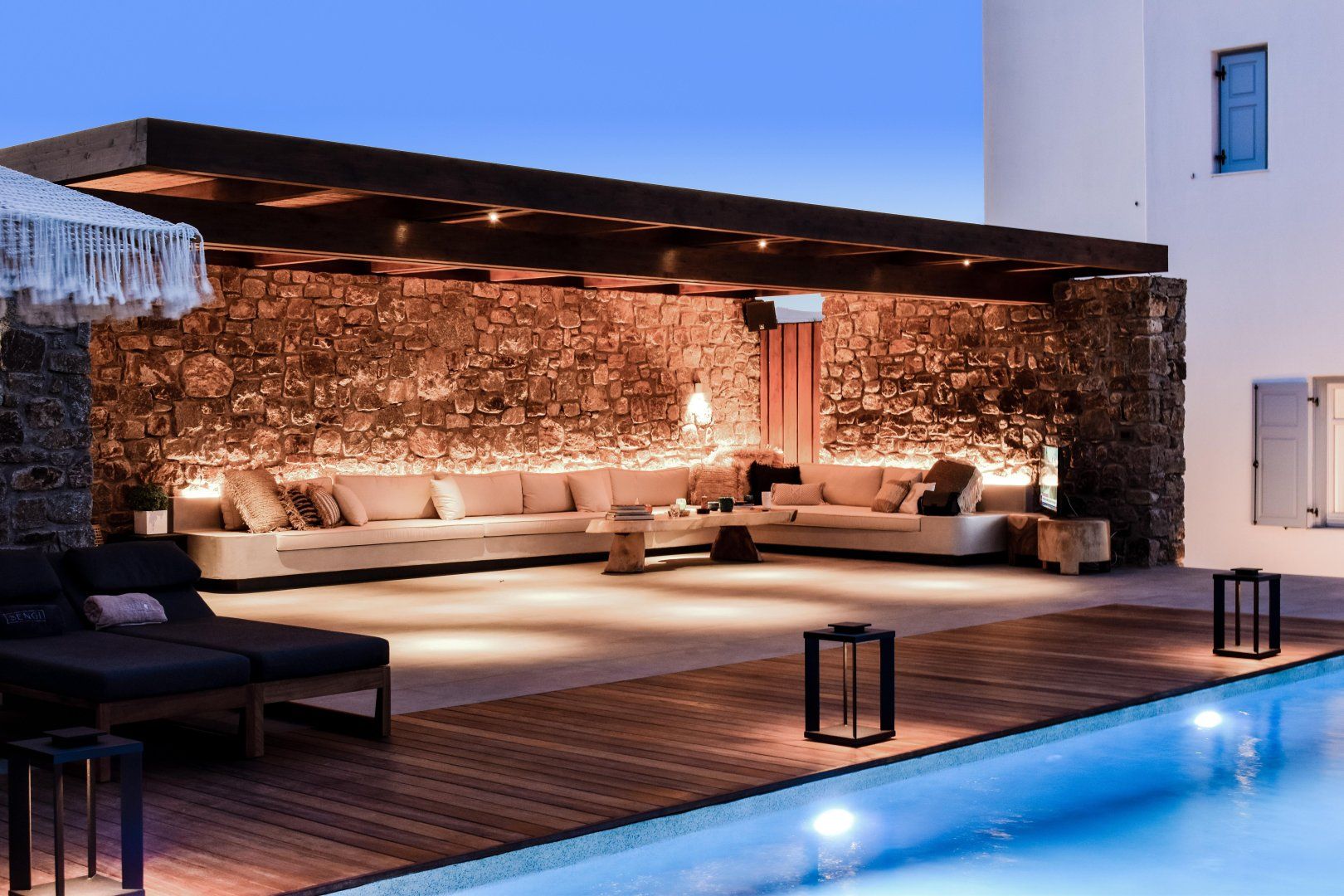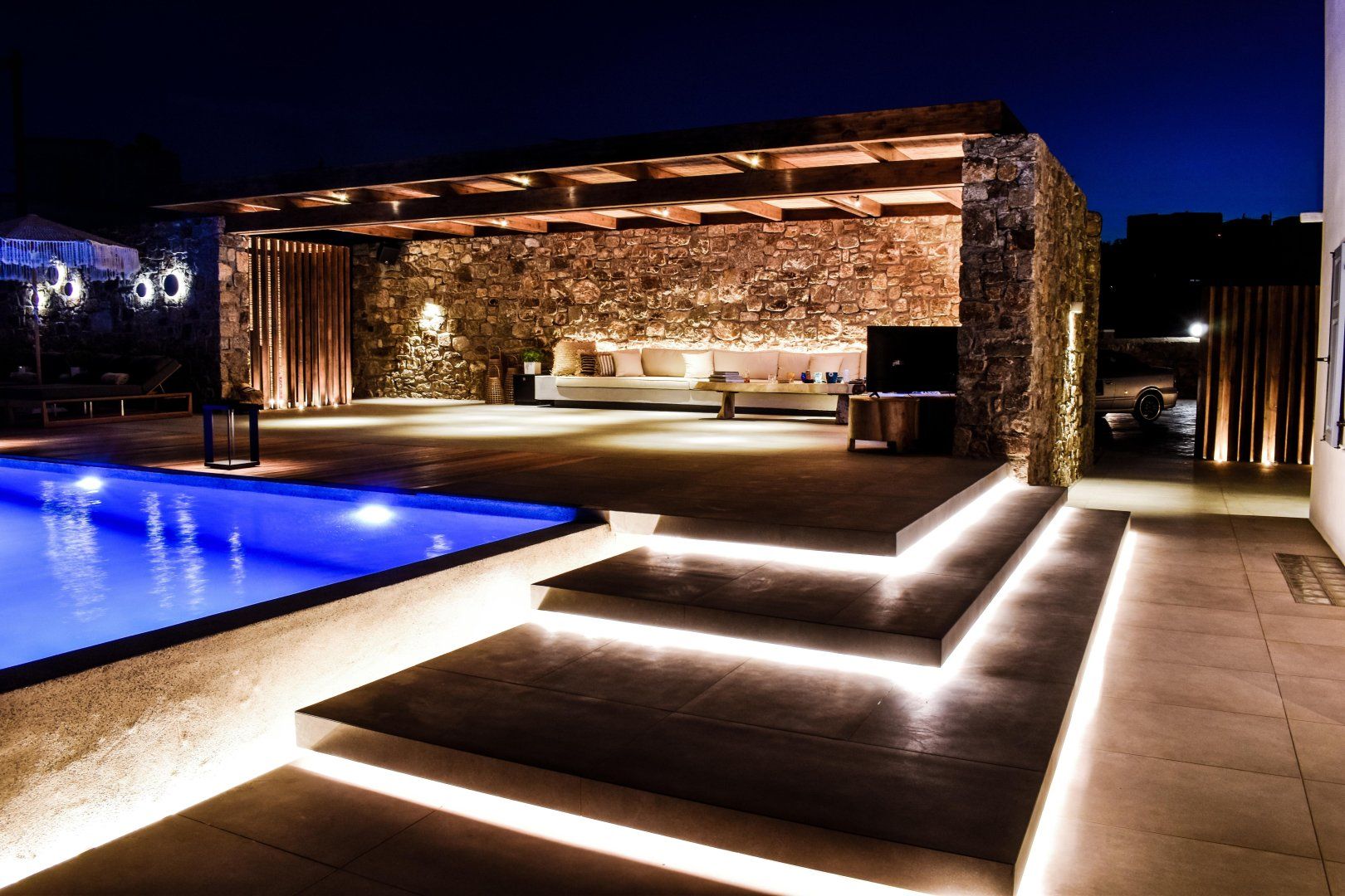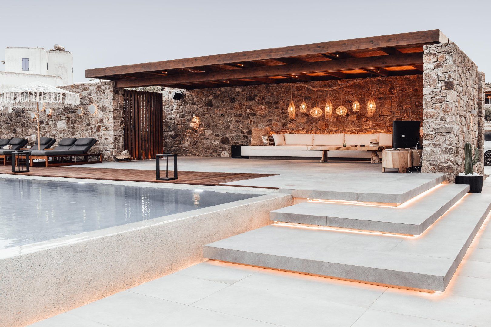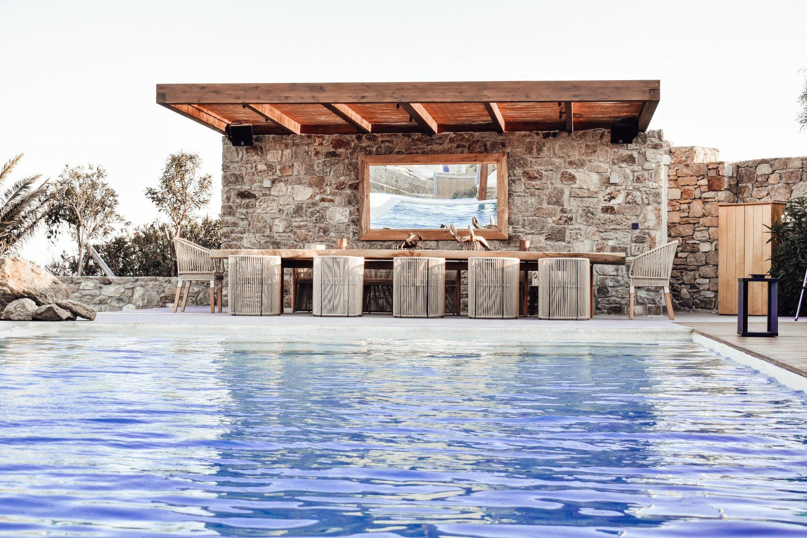 When it's extra balmy out and the sun is beating down, glide between the decadent shaded pavilion and your private swimming pool. No need to go indoors to wash the chlorine off – there's an outdoor shower for your convenience. The natural stone that clads the outdoor structures is sourced from the Myconian terrain, giving this contemporary villa an authentic island feel.