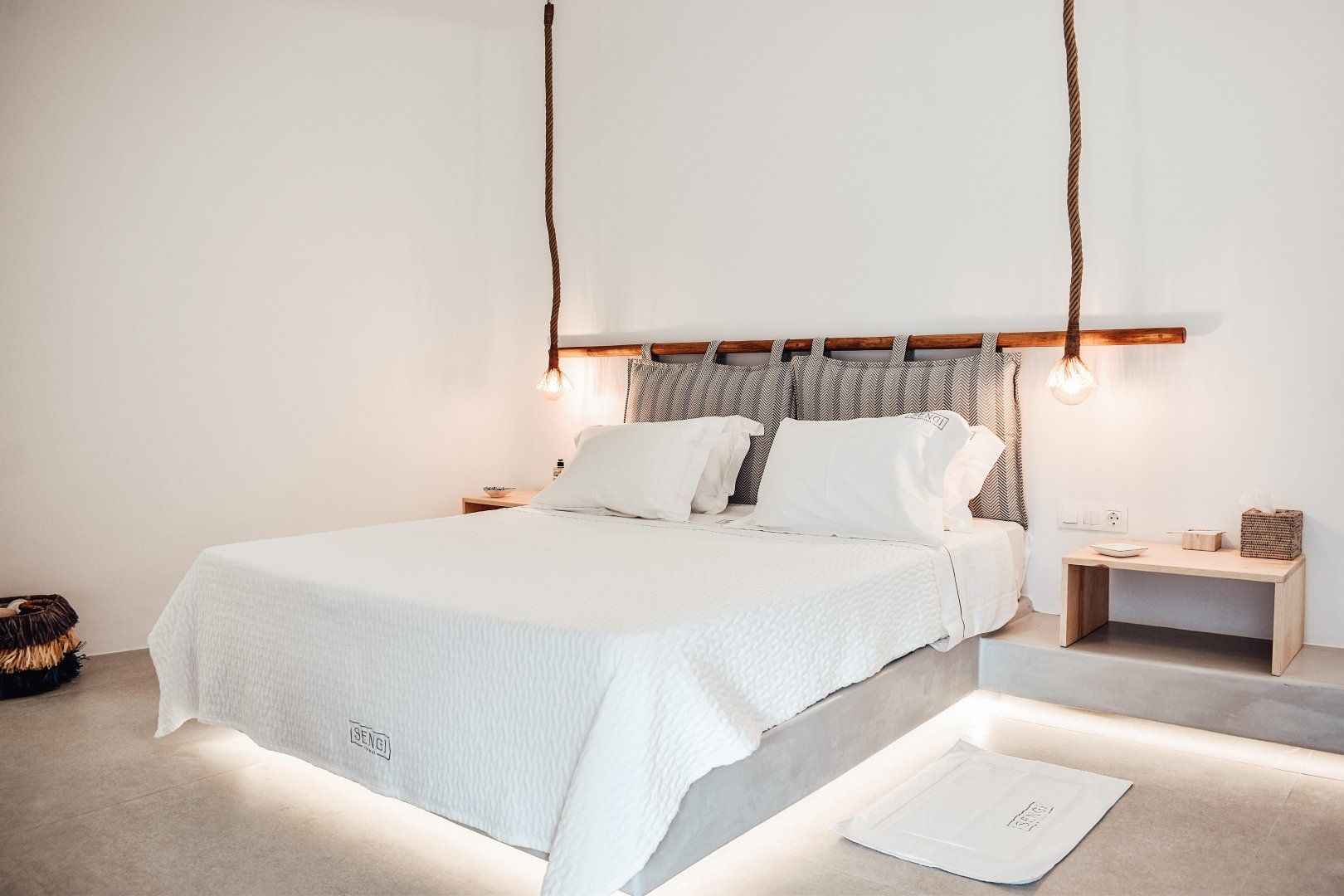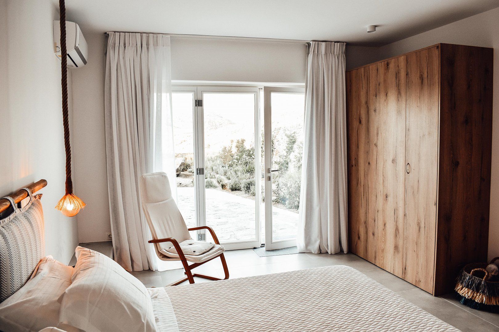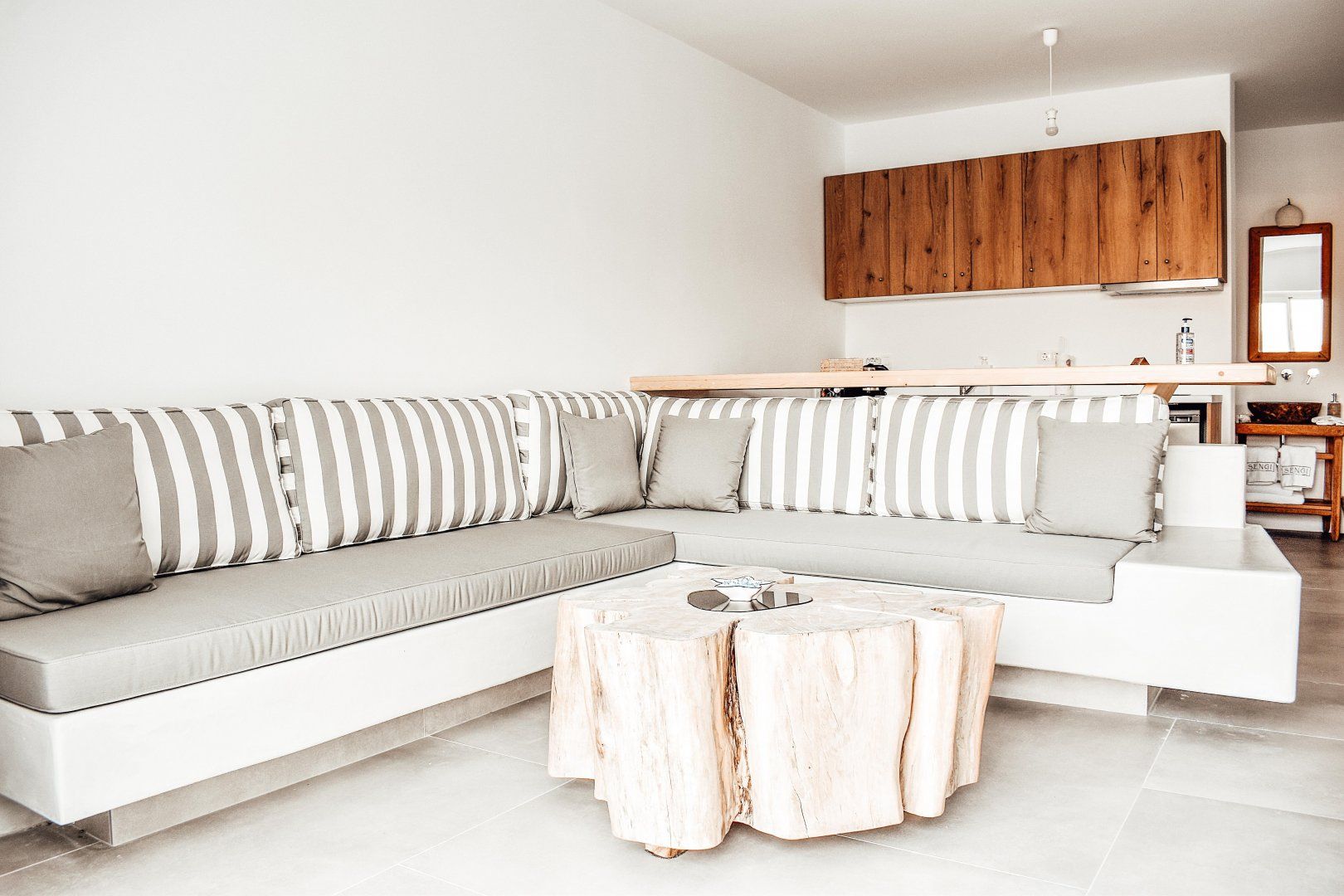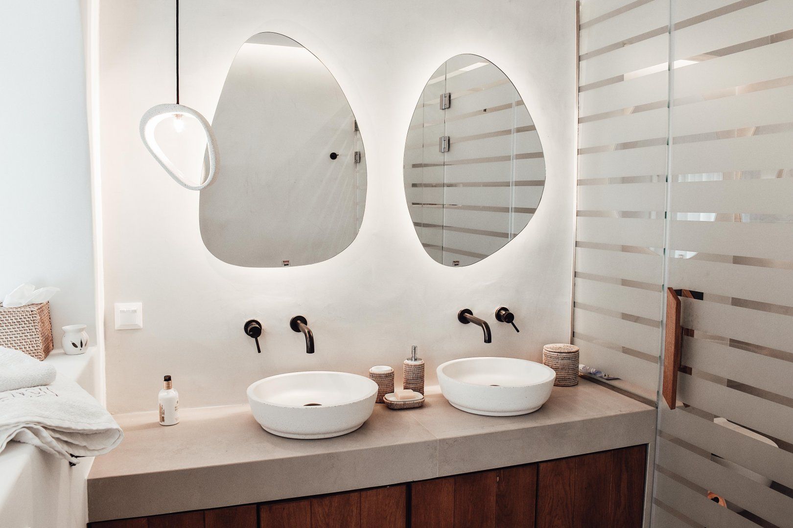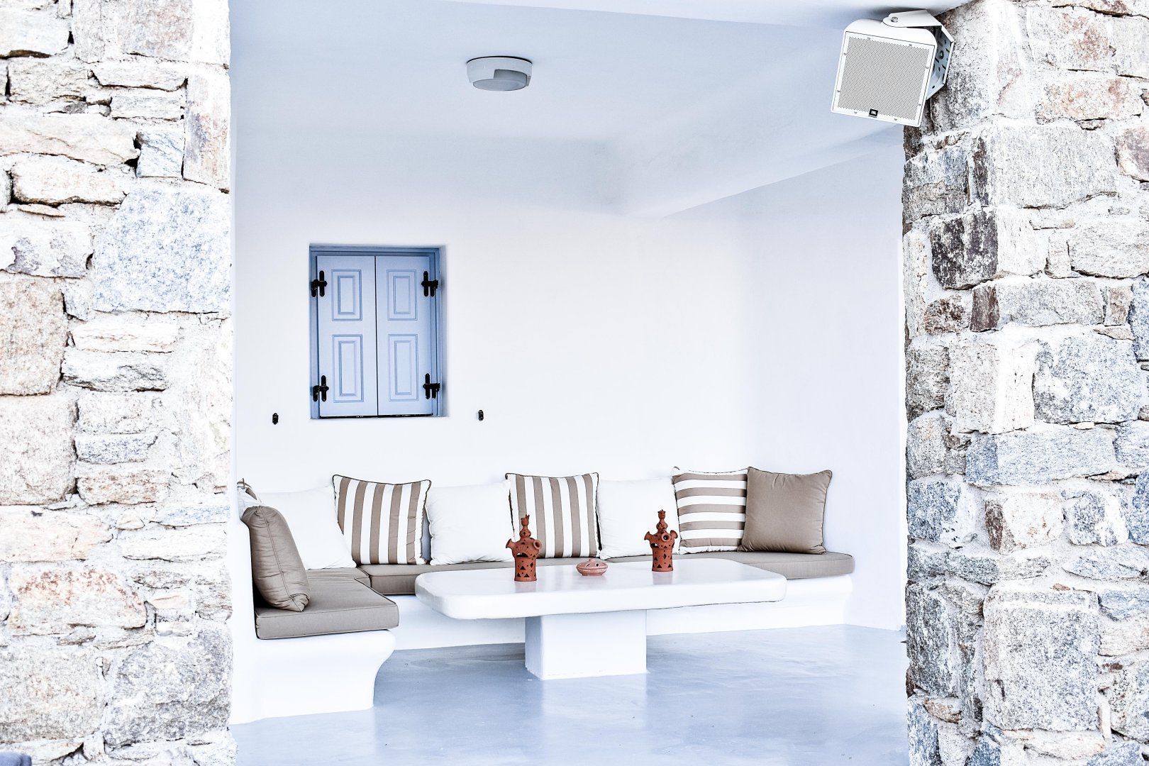 When it's extra balmy out and the sun is beating down, glide between the decadent shaded pavilion and your private swimming pool. No need to go indoors to wash the chlorine off – there's an outdoor shower for your convenience. The natural stone that clads the outdoor structures is sourced from the Myconian terrain, giving this contemporary villa an authentic island feel.
