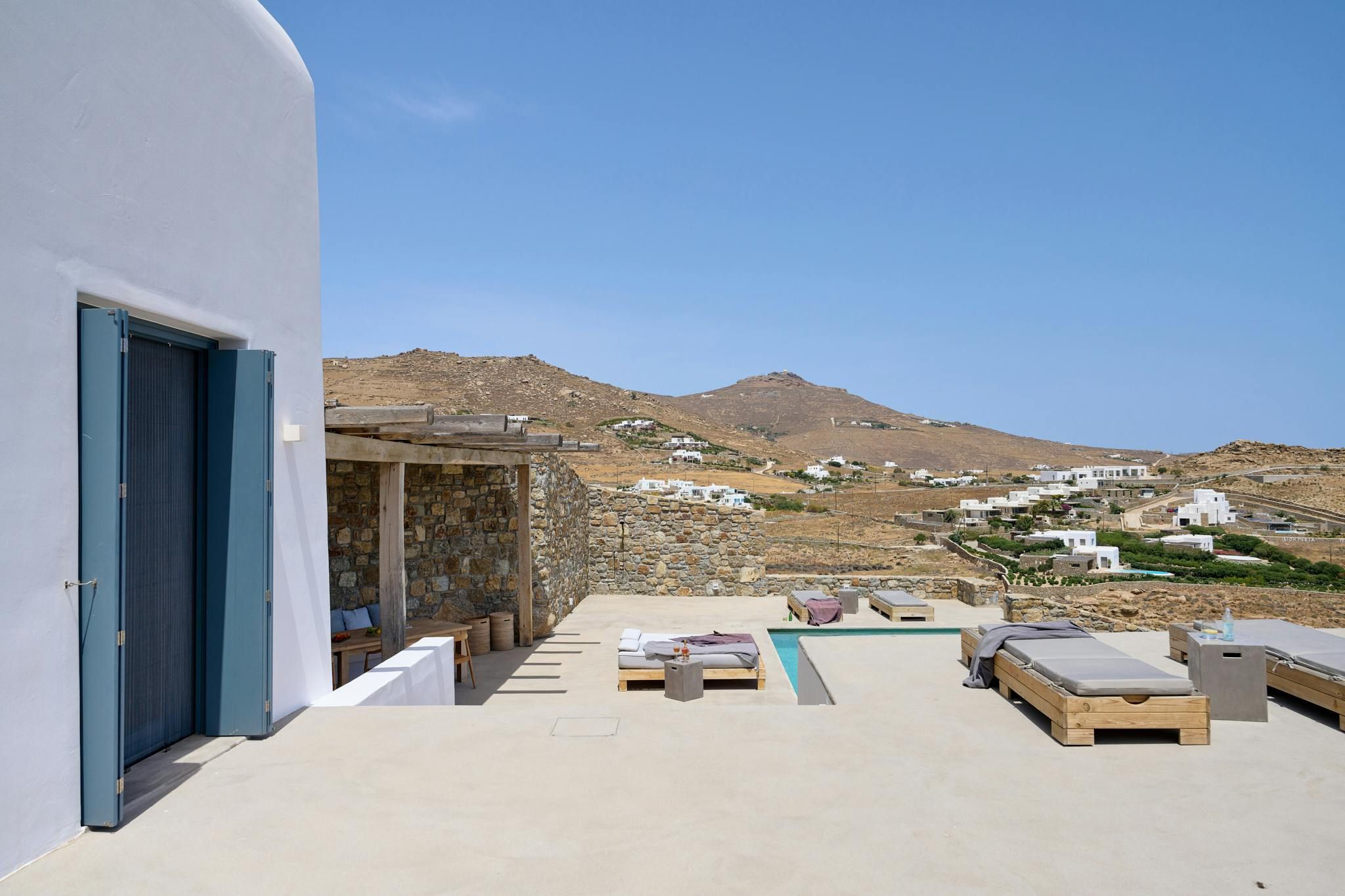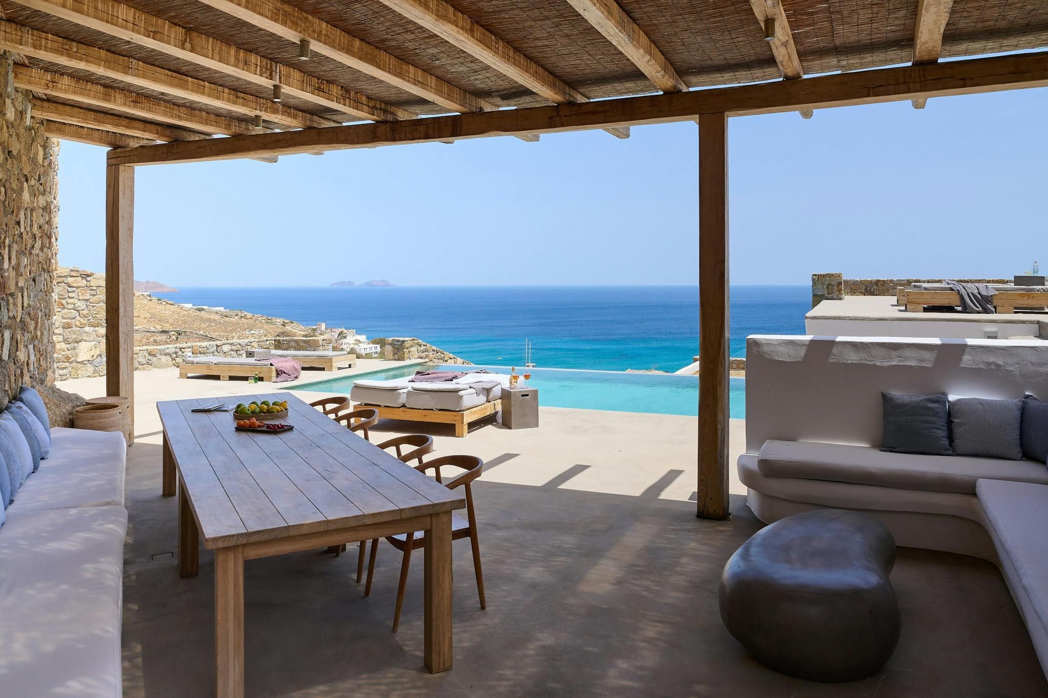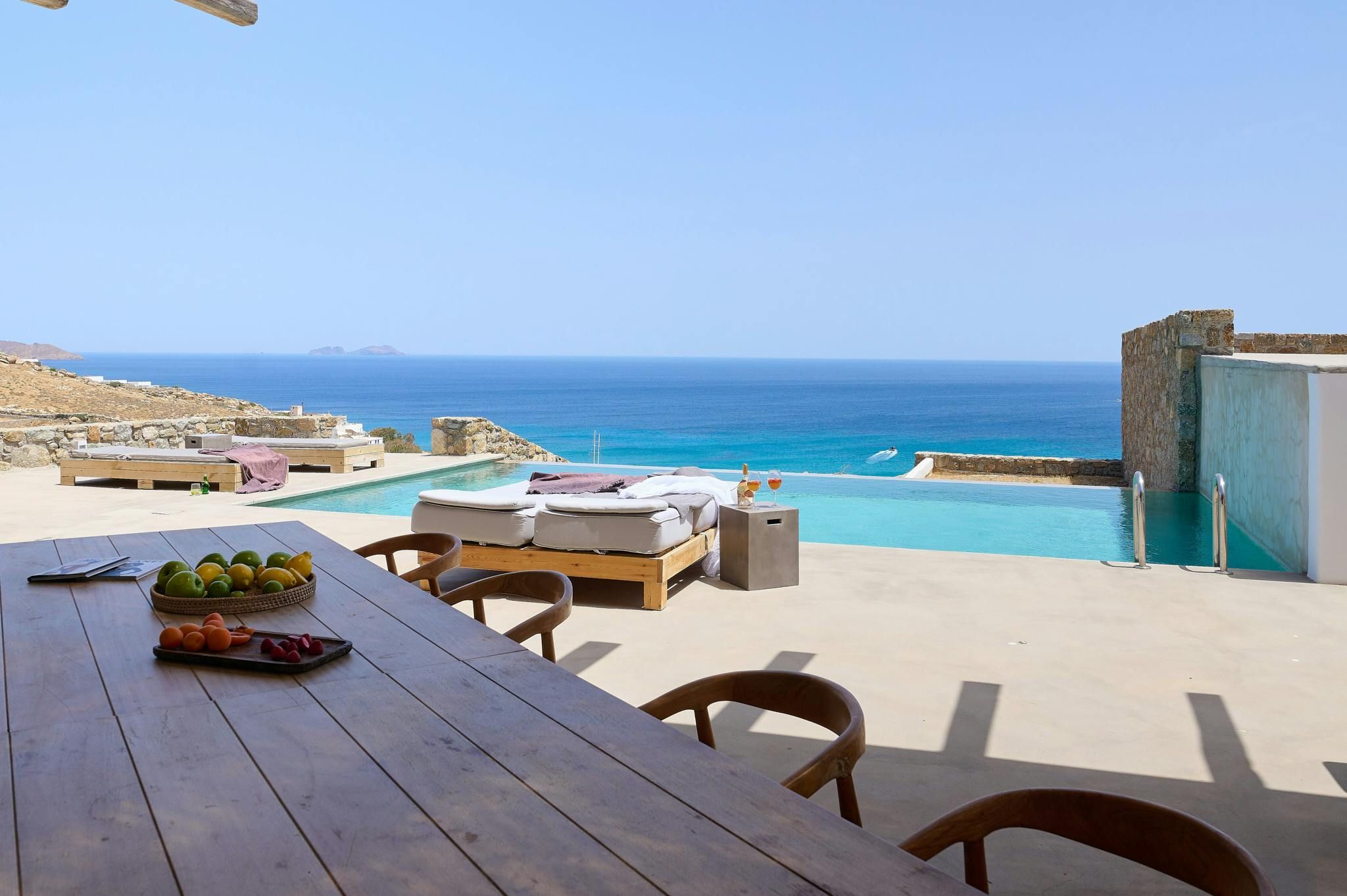 Overlooking the Bay of Kalafatis, this home will capture your heart with its stunning sea views. You can spend blissful days lounging poolside and reading in the shade. The terrace is perfect for alfresco dining, while the rooms set the tone for total relaxation. Daily housekeeping is included for optimum comfort, and there’s a concierge service offering extras like massage treatments. Another highlight is the fact that you can walk to the nearest beach – just 500 metres away. And if you feel like adventuring further afield, it’s just a short drive to Mykonos Town.