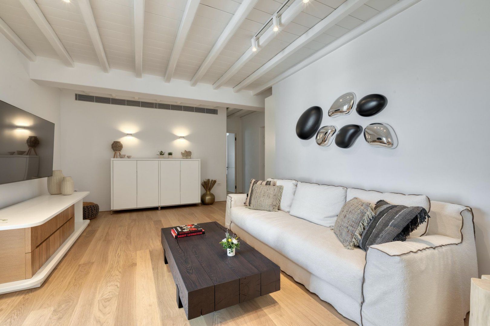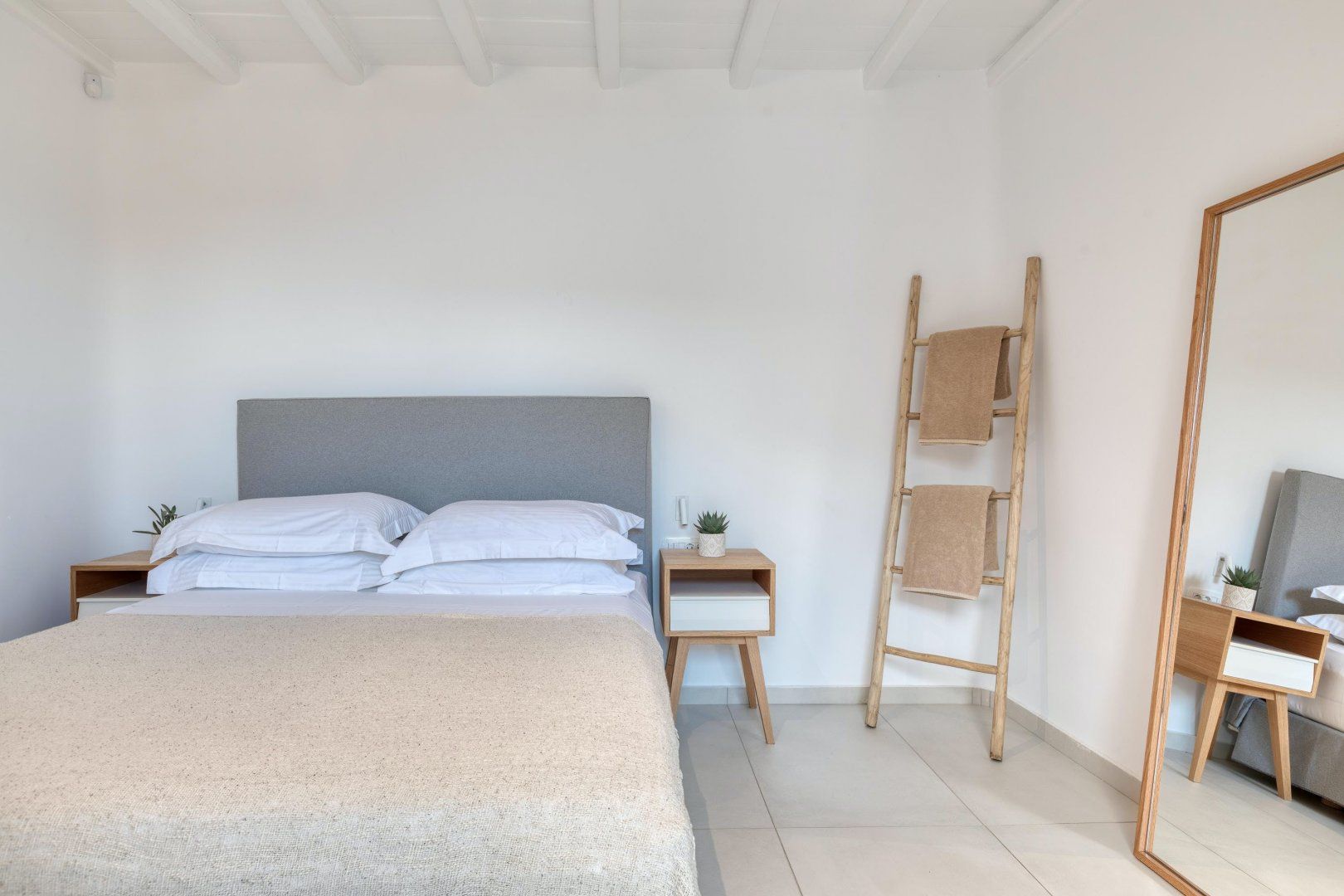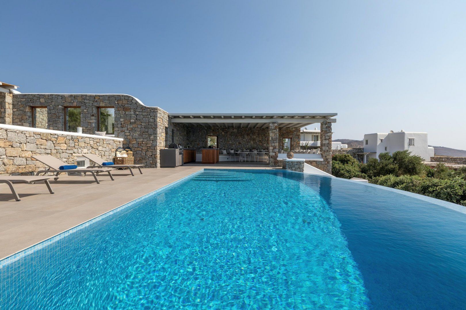 Set over three floors with a sprawling terrace, this modern Cycladic-style villa is perfect for a large family or group of friends. Everyone is catered for here – from the basketball court for the active types to the barbecue area for the budding chefs among you. Our favourite feature had to be the infinity pool with prime sunset views. Location-wise, Kalafati Beach is just a short walk from the doorstep. You’ll need a car for trips further afield – Mykonos town is around 10 kilometres away.