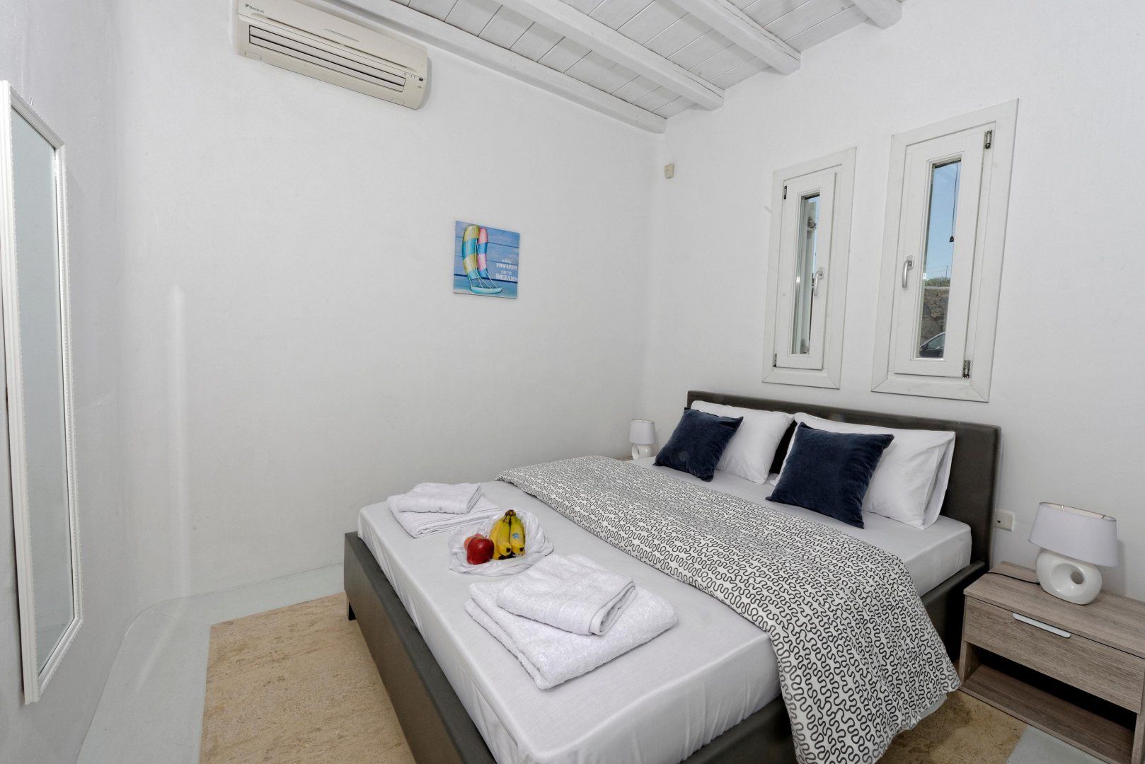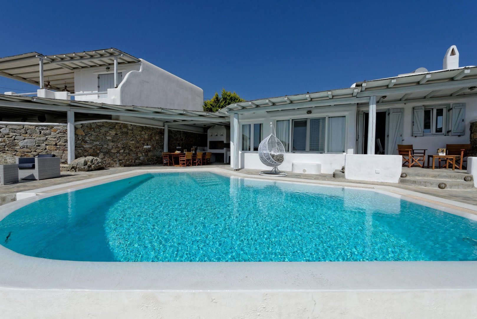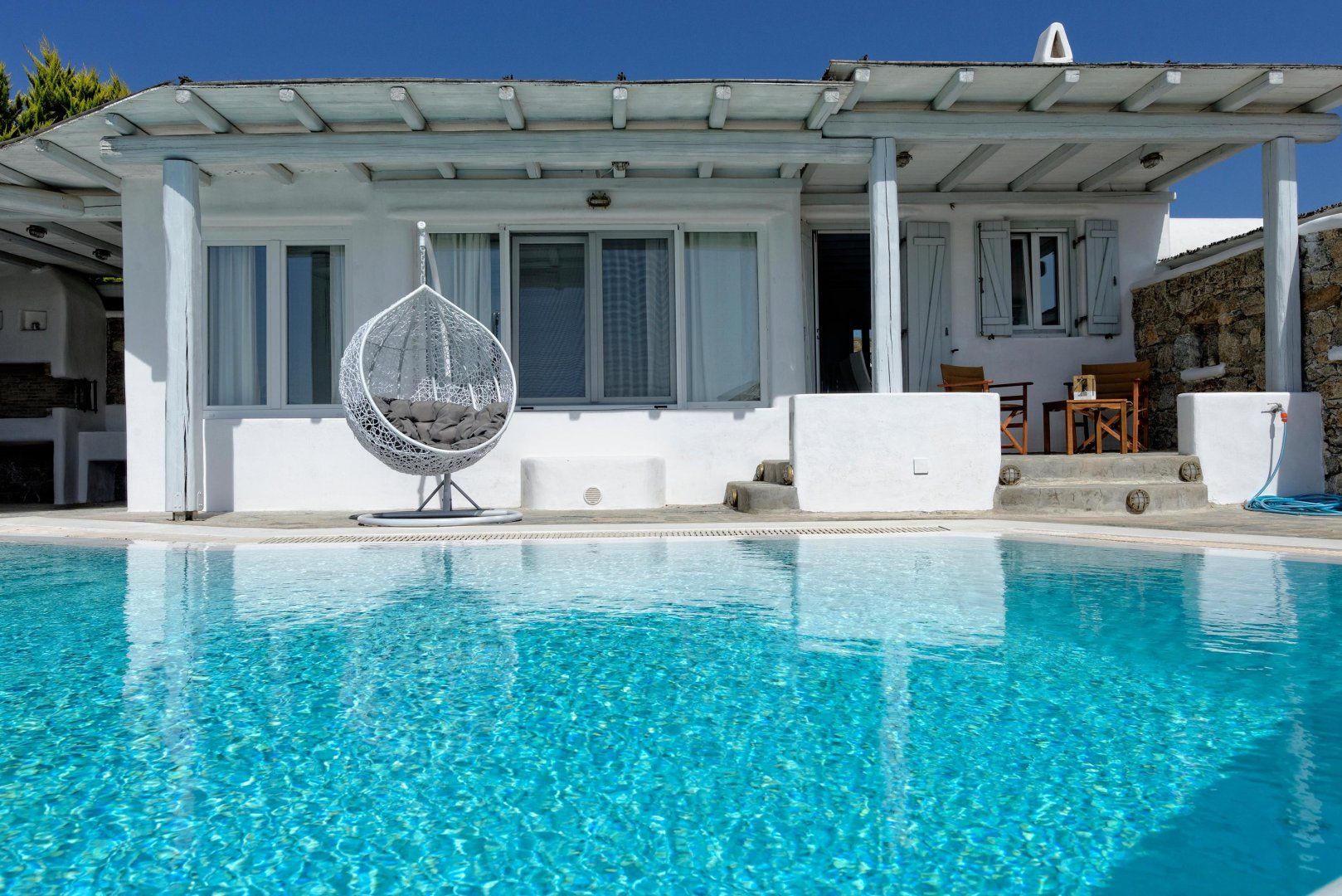 Mykonos might be famed for its nightlife, but at this charming whitewashed villa, you'll experience the island's softer side. Just two kilometres from a white-sand beach and Greece's impossibly turquoise waters, the home sits in its own peaceful plot with a private garden and swimming pool.