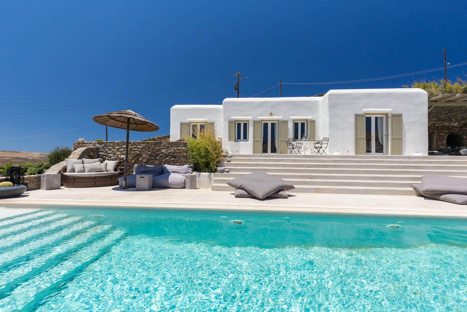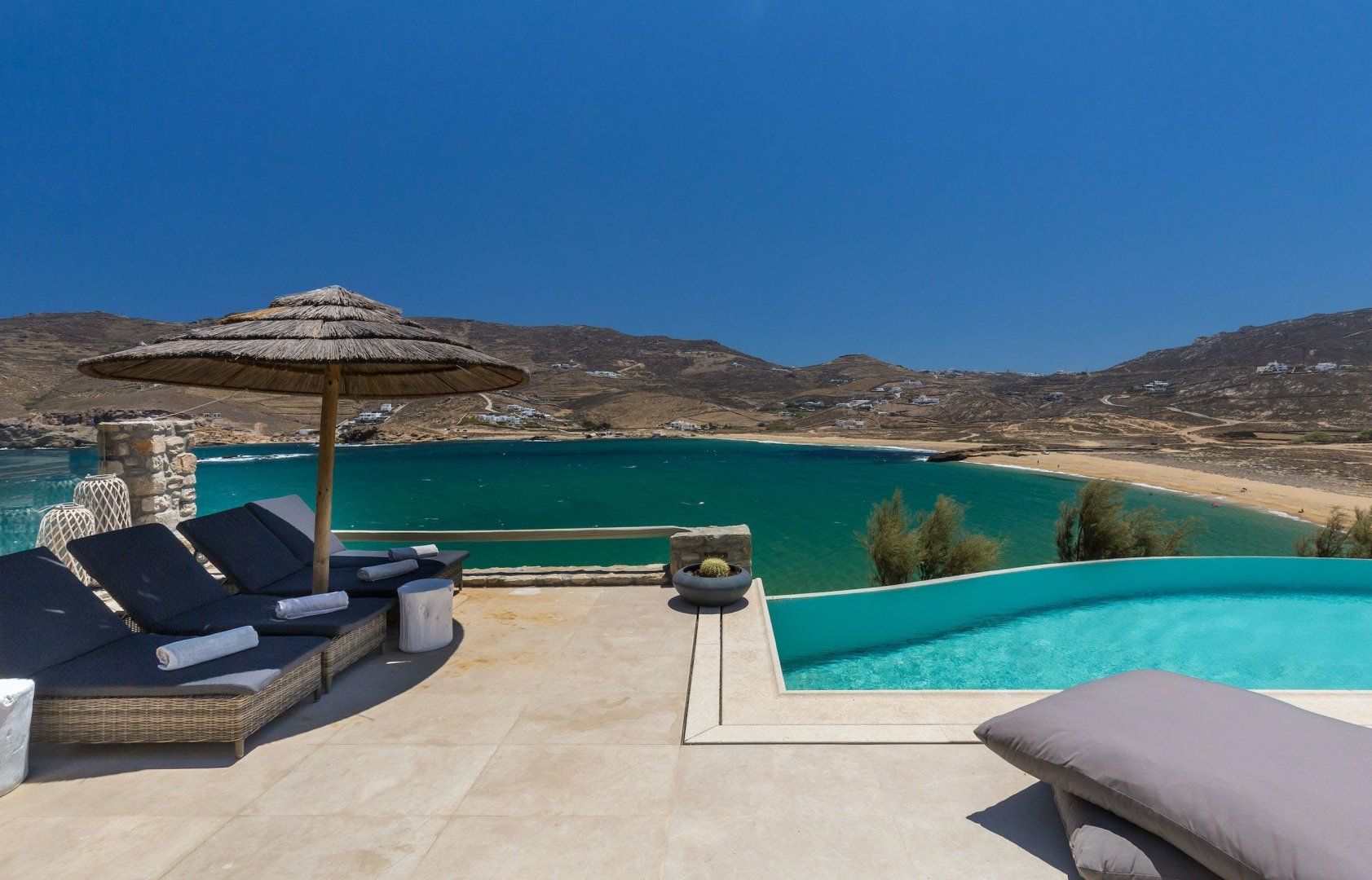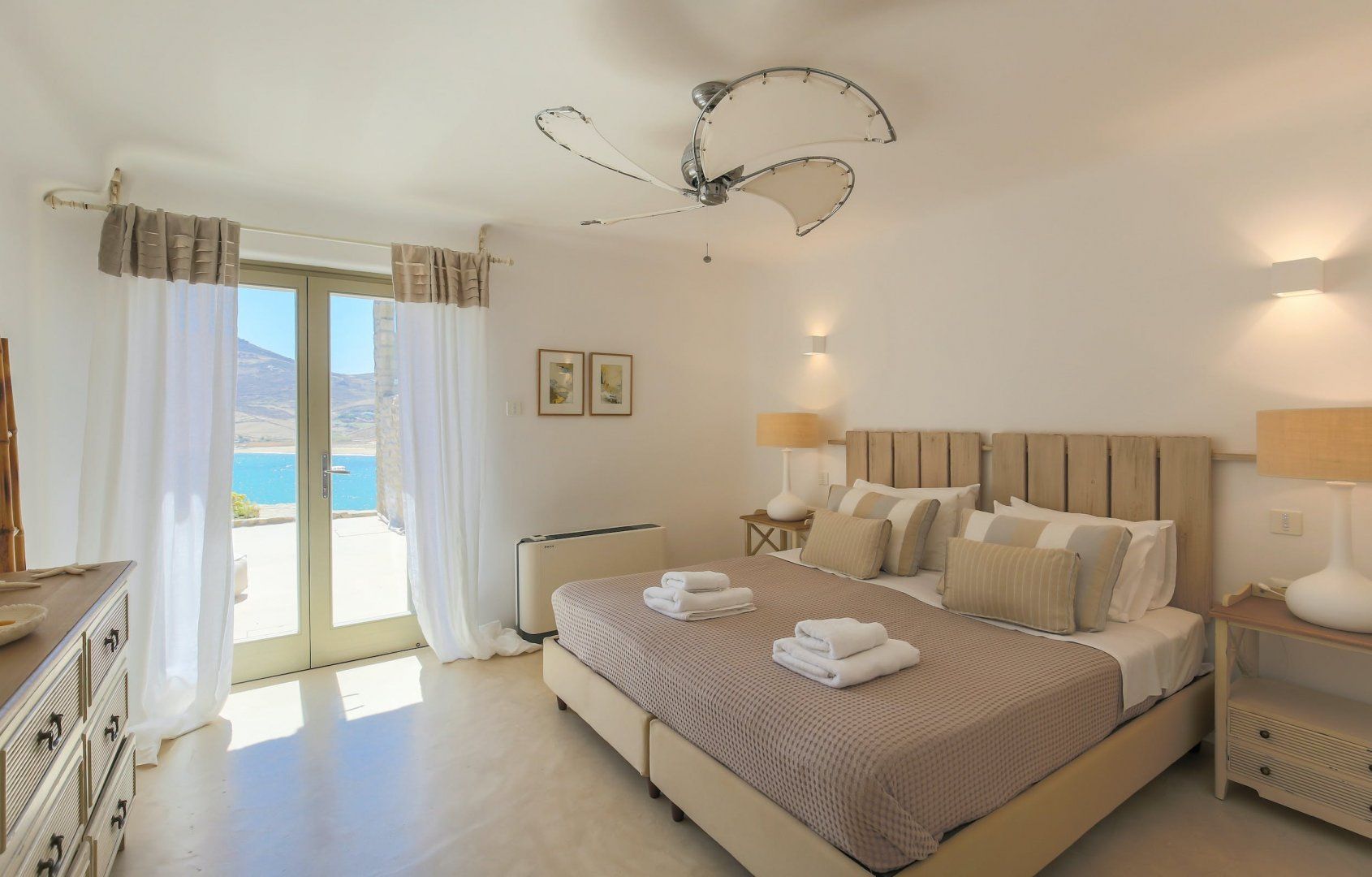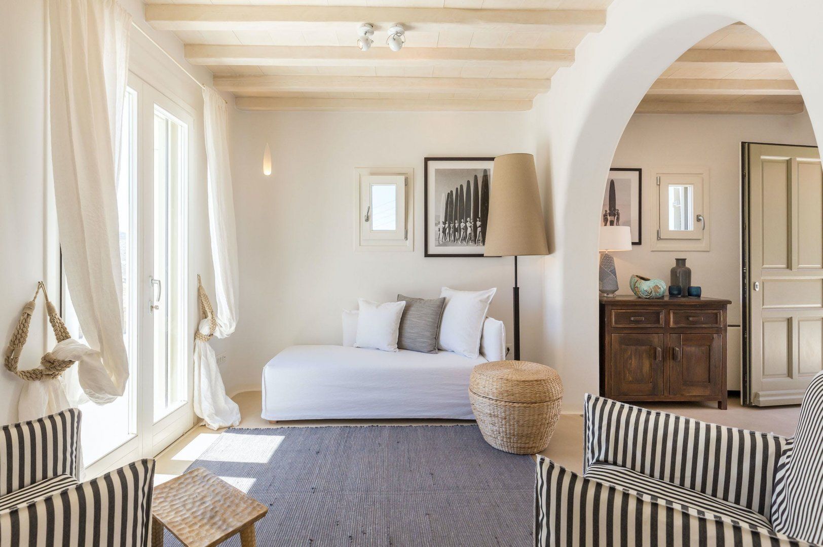This gorgeous whitewashed Cycladic home is all soft curves and natural textures – the type of place that’s canonised in glossy design magazines. Outside, a bow-shaped infinity pool drops into Ftelia Bay – to which you have direct access via steps that lead from the lower terrace down to the beach. On the terrace above, we can imagine you cooking Greek feasts in the summer kitchen, with its long dining table and bamboo-clad pergola. Unwind with a tot of ouzo on the alfresco lounge set, surrounded by the sounds of chill-out tracks coming from the outdoor sound system. Inside, the rooms are finished with crisp white walls and neutral shades of grey and taupe. The bedrooms are cosy and inviting, with comfy double beds dressed in high-quality linens. And that’s not to mention the views – waking up to the sight of the Aegean through French doors is beyond compare.