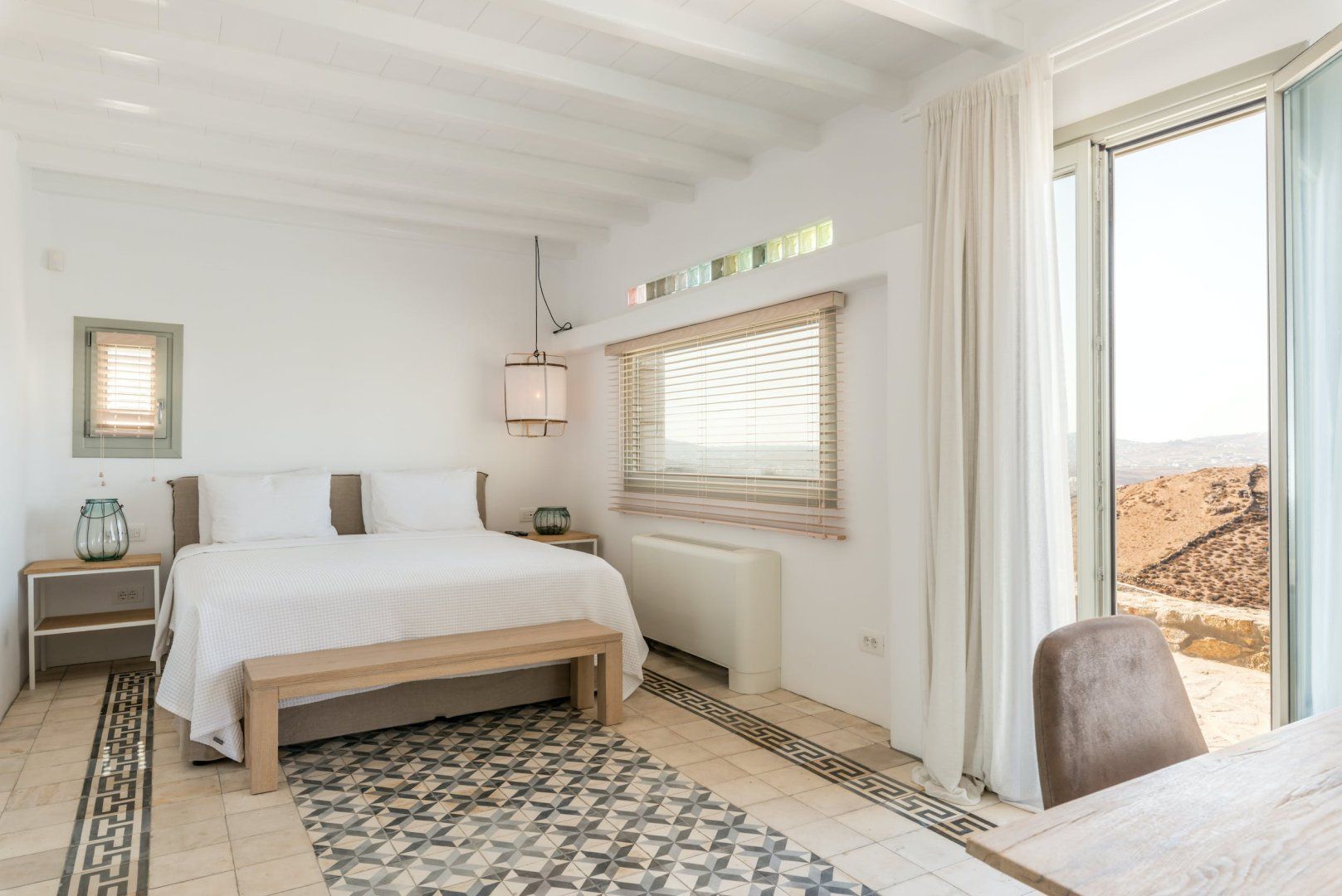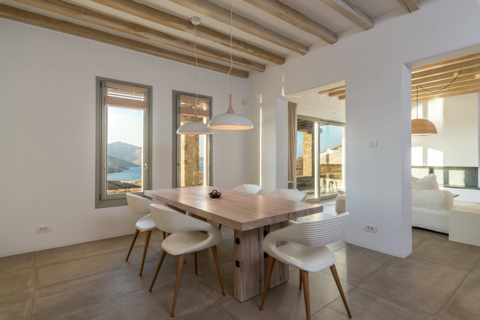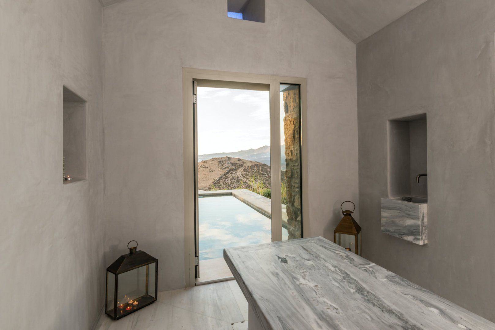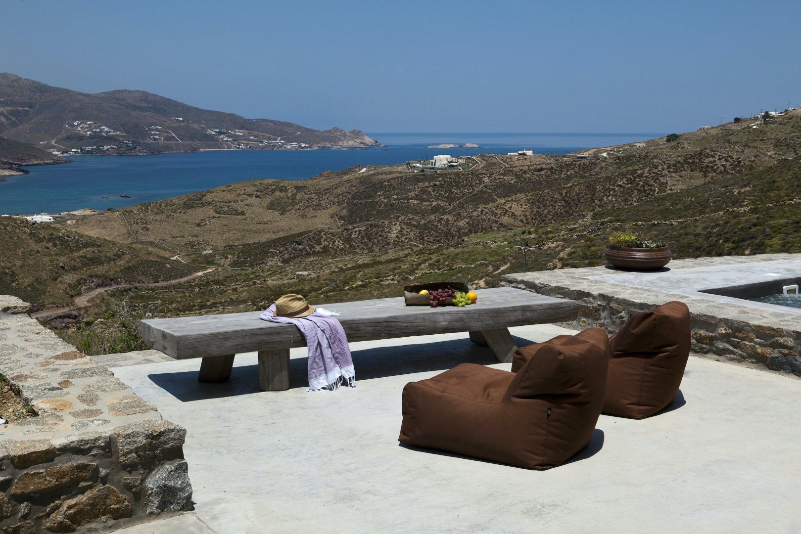 Forget beach clubs, glitzy bars and being seen, this beautiful home is showing us a quieter side of Mykonos. A ten-minute drive from Ftelia beach, the plot is carved into an arid hillside, giving you beautiful views of the Aegean ocean and the town below from every angle. Built in the traditional Cyclades style, the home incorporates white-washed and stone walls with French doors to create big, breathy rooms. A plush L-shaped sofa sits under wooden beams - and with sliding doors across one wall, it may be hard to pay attention to the TV with the stunning vistas in front of you. Arches, rather than doors, connect living areas giving an easy sense of flow in the home, without it feeling too cramped. Beds face towards the sea too, though are split into various outbuildings to give some privacy. Even the gym, with its floor-to-ceiling windows, makes working out a cinch thanks to the background scenes. Step outside to really soak up the panoramas, whether it's in the infinity pool, the plunge pool, or the hot tub.